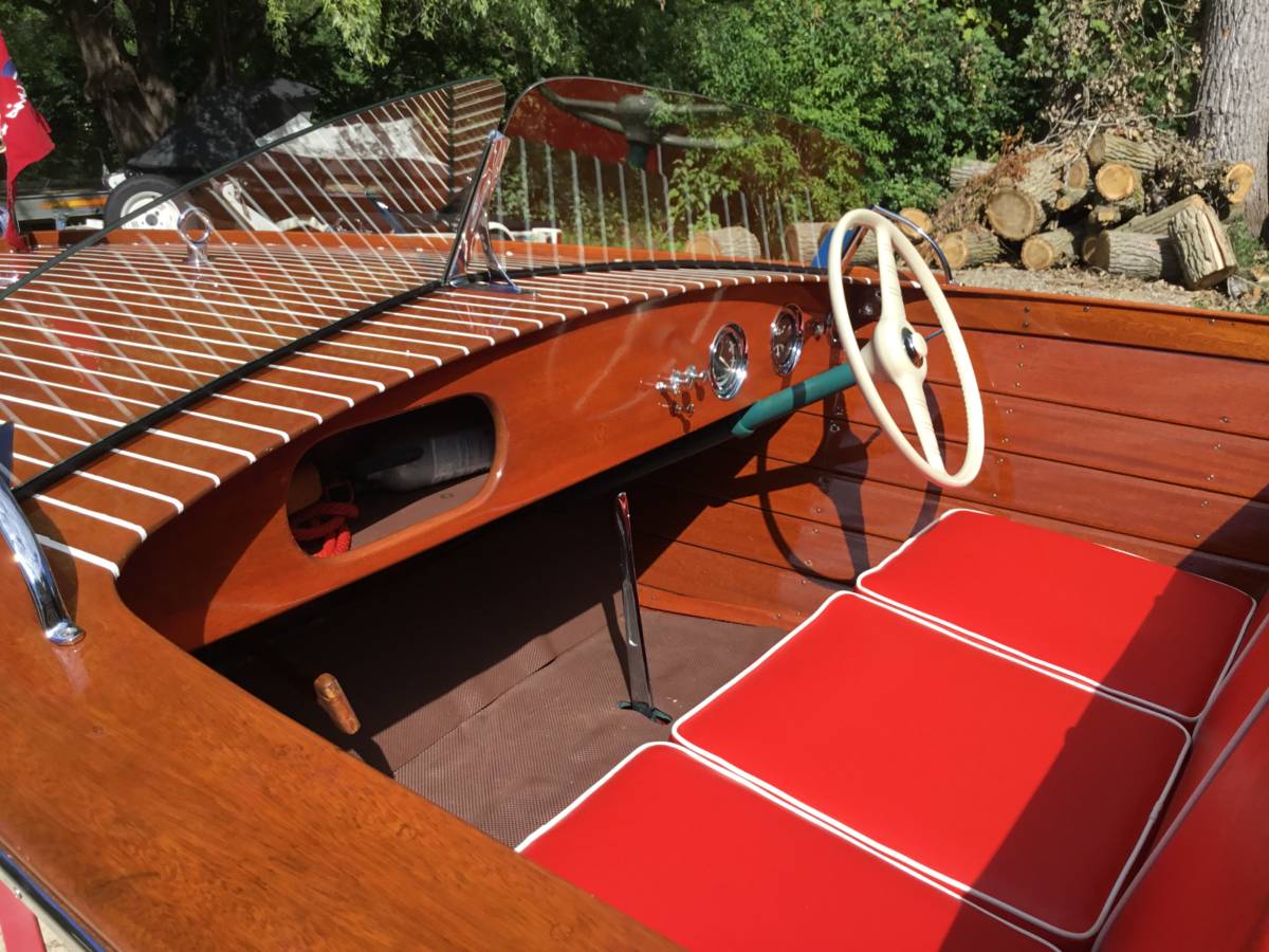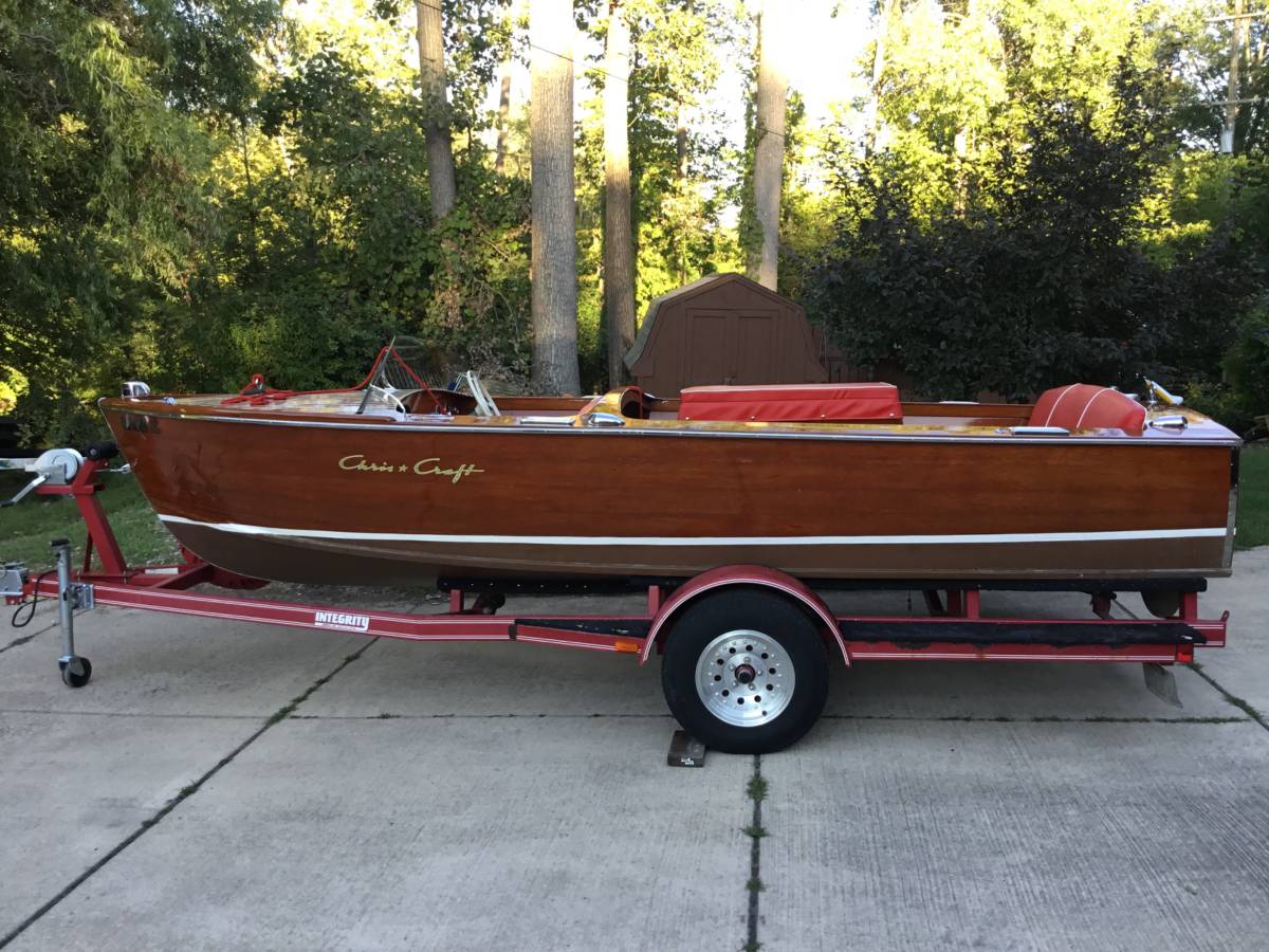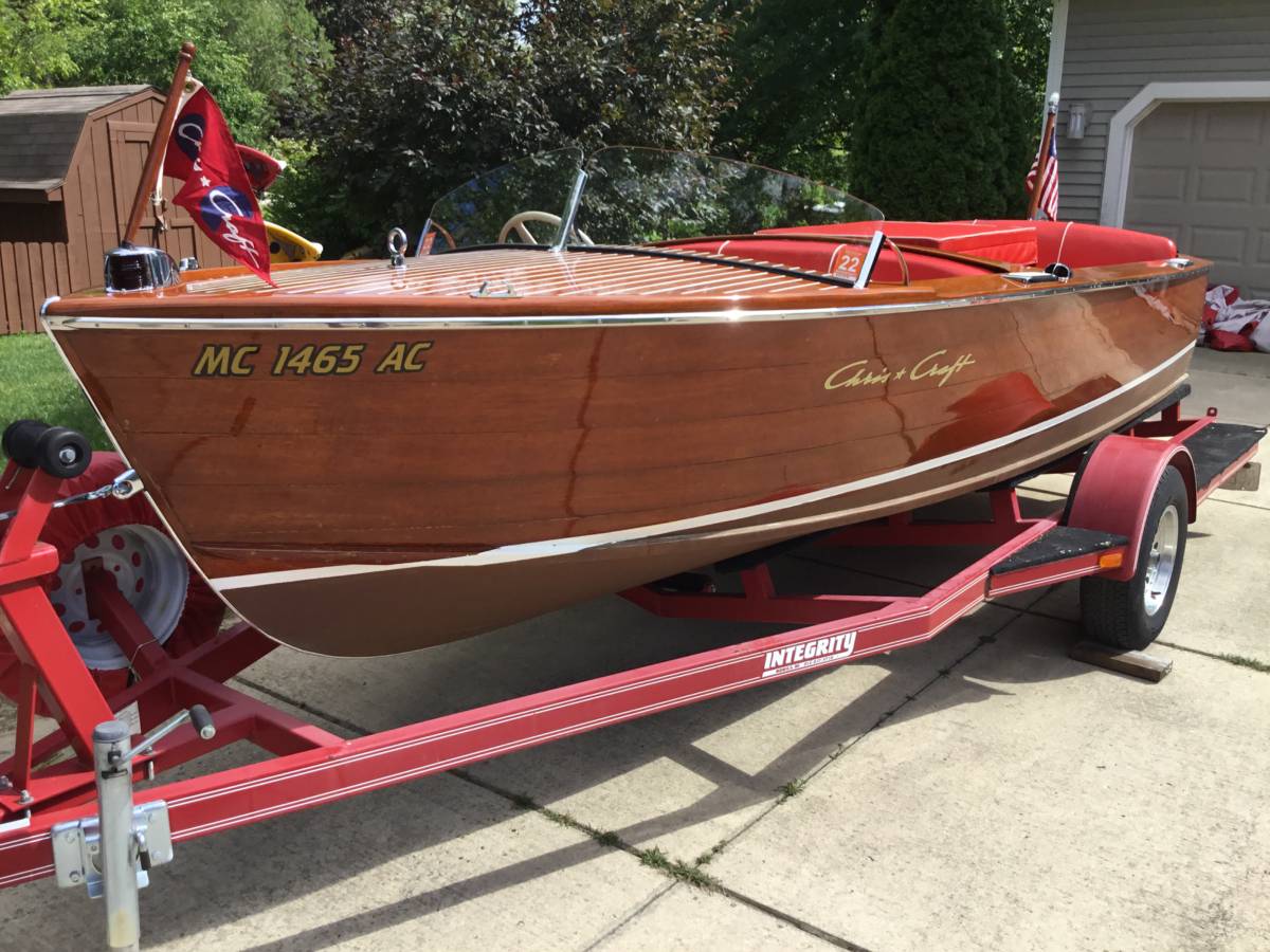 Award winning restoration: all original refinished mahogany interior and exterior, documented rebuilt KLC Chris Craft engine, 120 hp, 12v conversion, 5200 bottom, all refinished chrome, red with white trim like new upholstery. Always garaged and covered. Includes custom built Integrity trailer. Ready for immediate use!