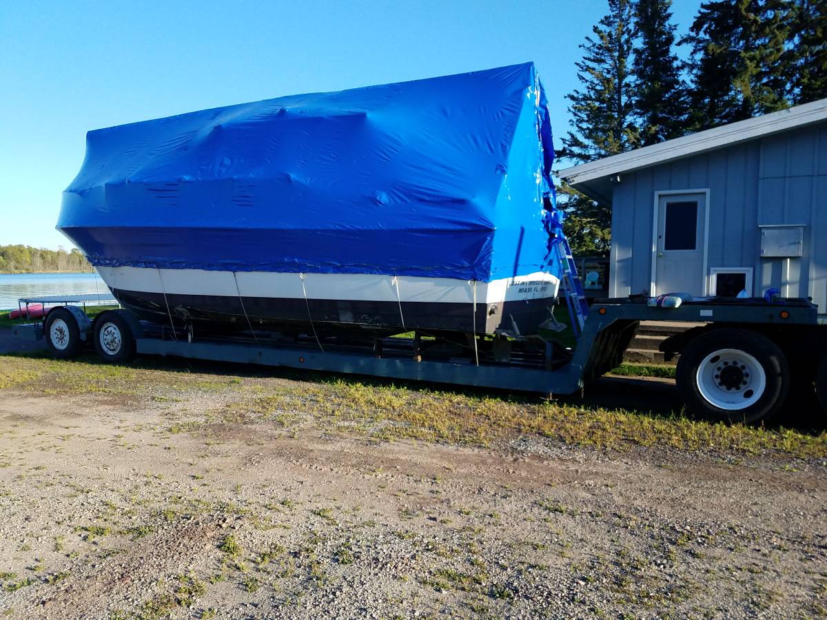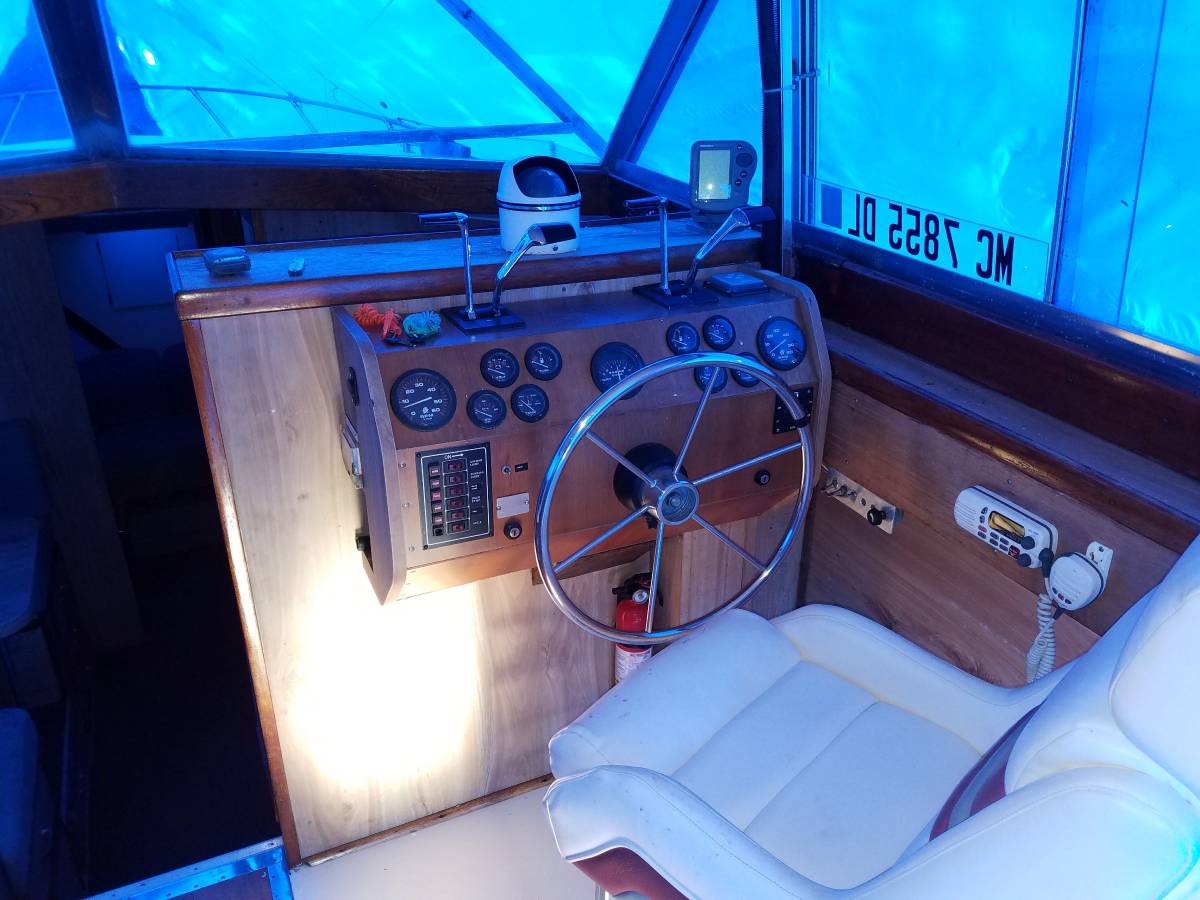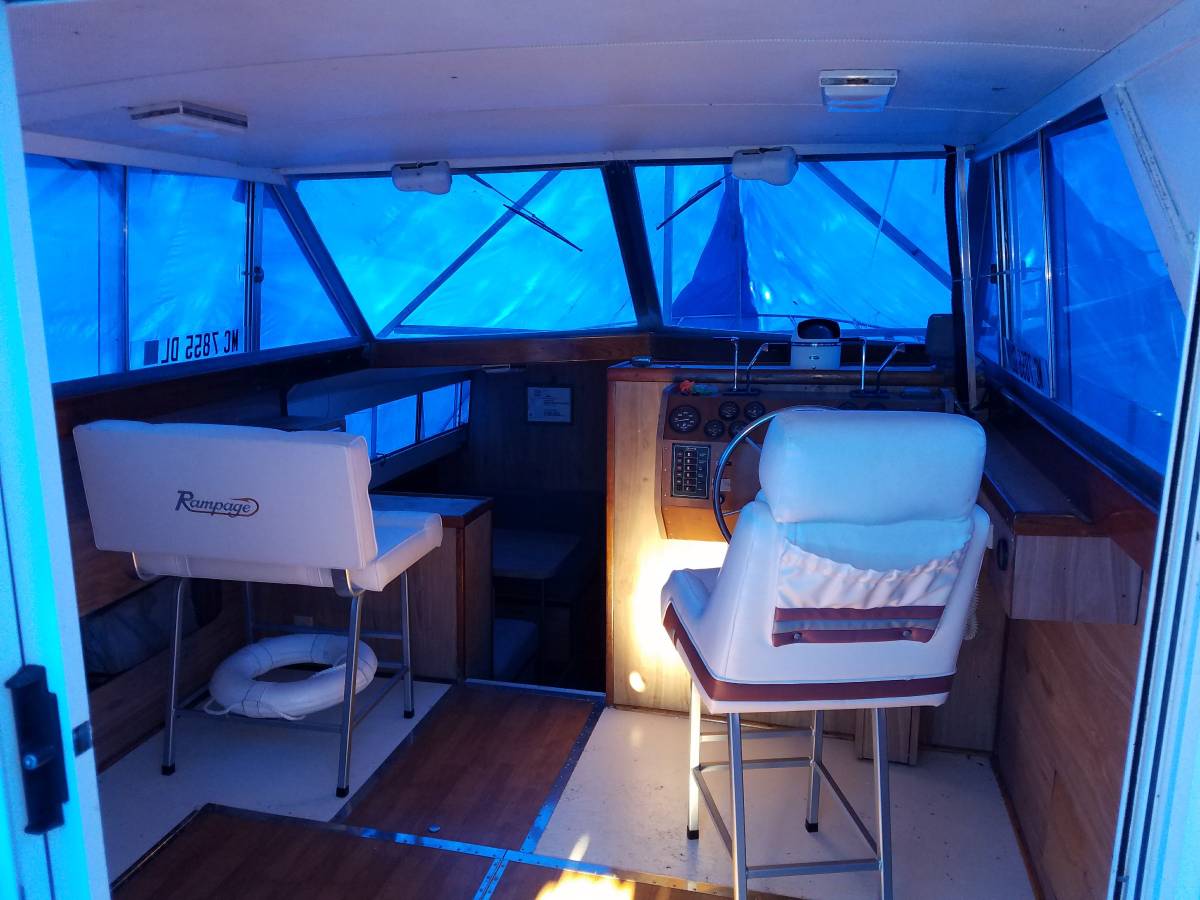 All controls, gauges, shore power, chargers, nav lights, fresh water supply plumbing, and camping toilet work well. New 4-blade props and 80 gallon aluminum fuel tanks. The interior could use a little TLC and the hull bottom could use anti-foul coating. The boat is currently on my boat hauling trailer and wrapped, but it can be ready for a water test in 1 day. Note we can store the boat FREE until spring if you place a deposit!