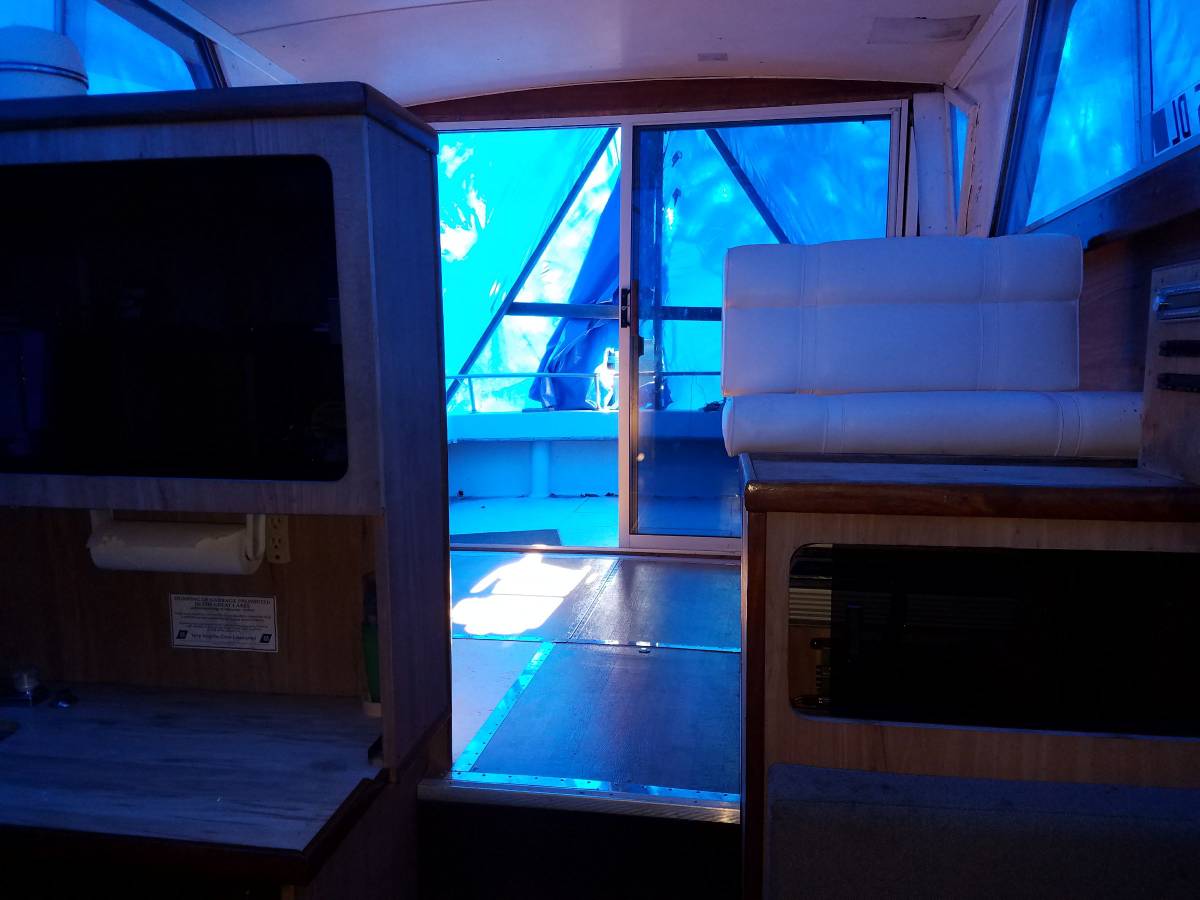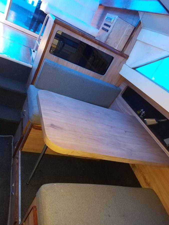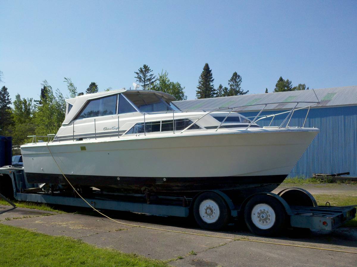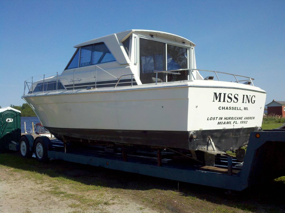 All controls, gauges, shore power, chargers, nav lights, fresh water supply plumbing, and camping toilet work well. New 4-blade props and 80 gallon aluminum fuel tanks. The interior could use a little TLC and the hull bottom could use anti-foul coating. The boat is currently on my boat hauling trailer and wrapped, but it can be ready for a water test in 1 day. Note we can store the boat FREE until spring if you place a deposit!