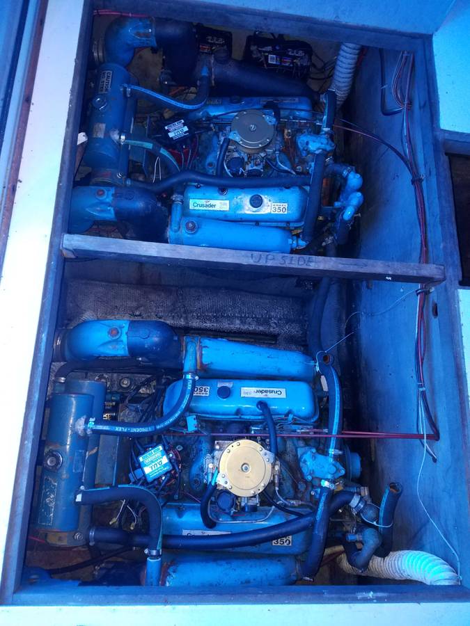 1977 Chris Craft Sports Sedan with twin 454 Crusaders. Very good overall condition. The hull is excellent. Engines and drives operate absolutely awesome. Engine rod/main bearings and manifolds were rebuilt recently and they have new electronic ignitions and new four-barrel carbs. This is now a fresh water boat with closed cooling systems (salt water useable). Boat planes out at about 13 mph and will top out about 33 mph.