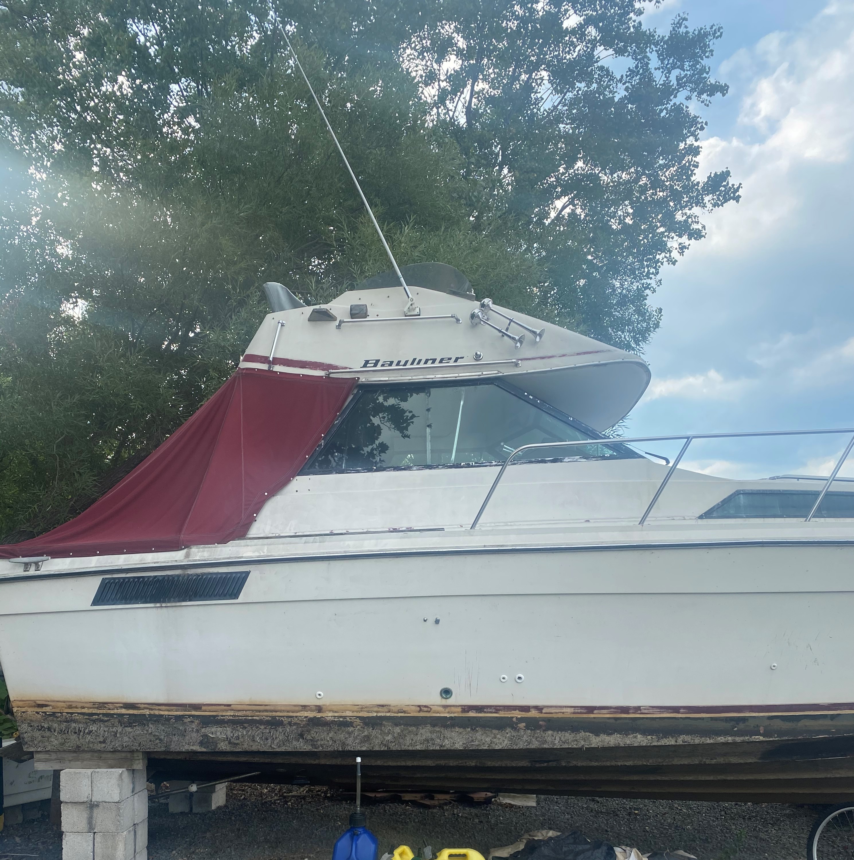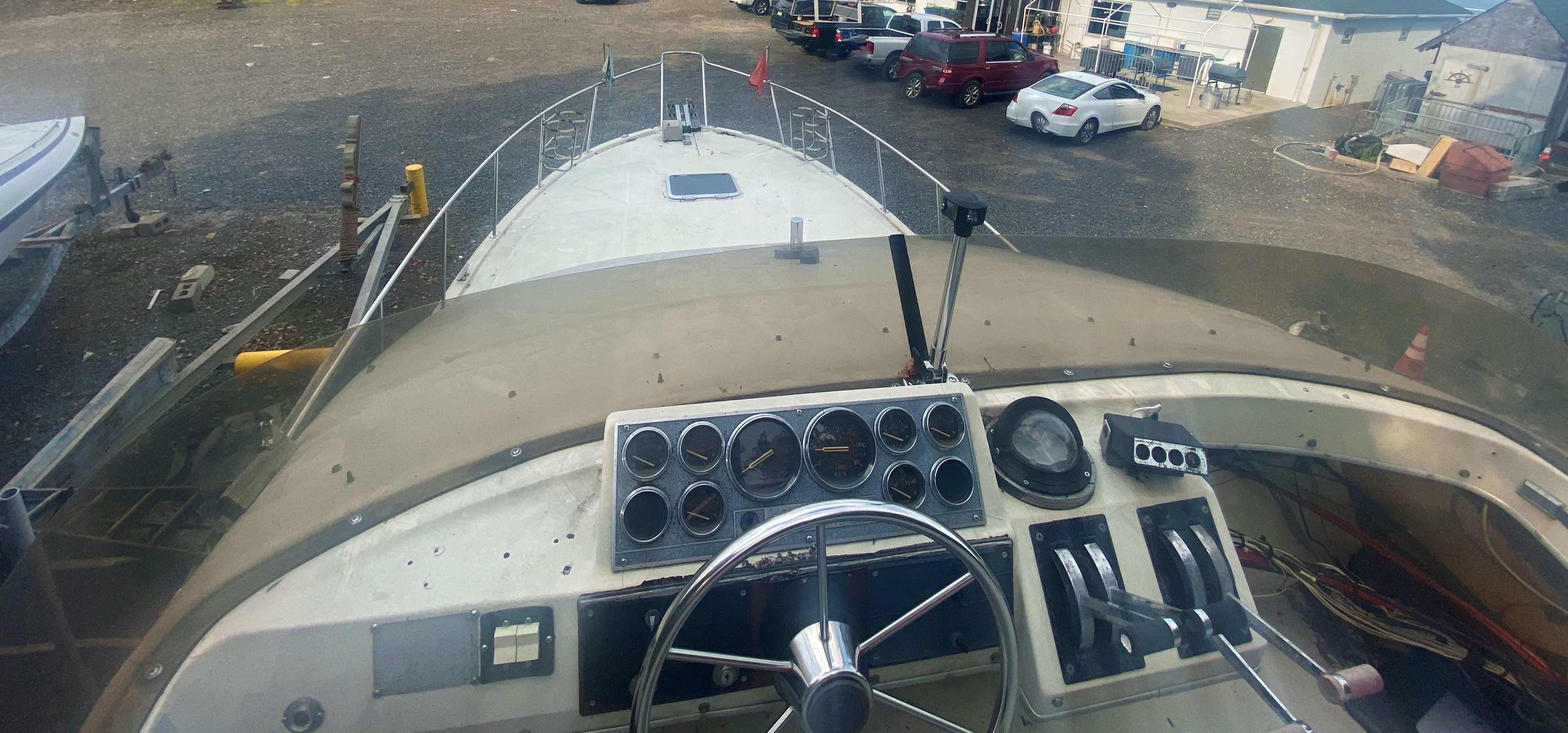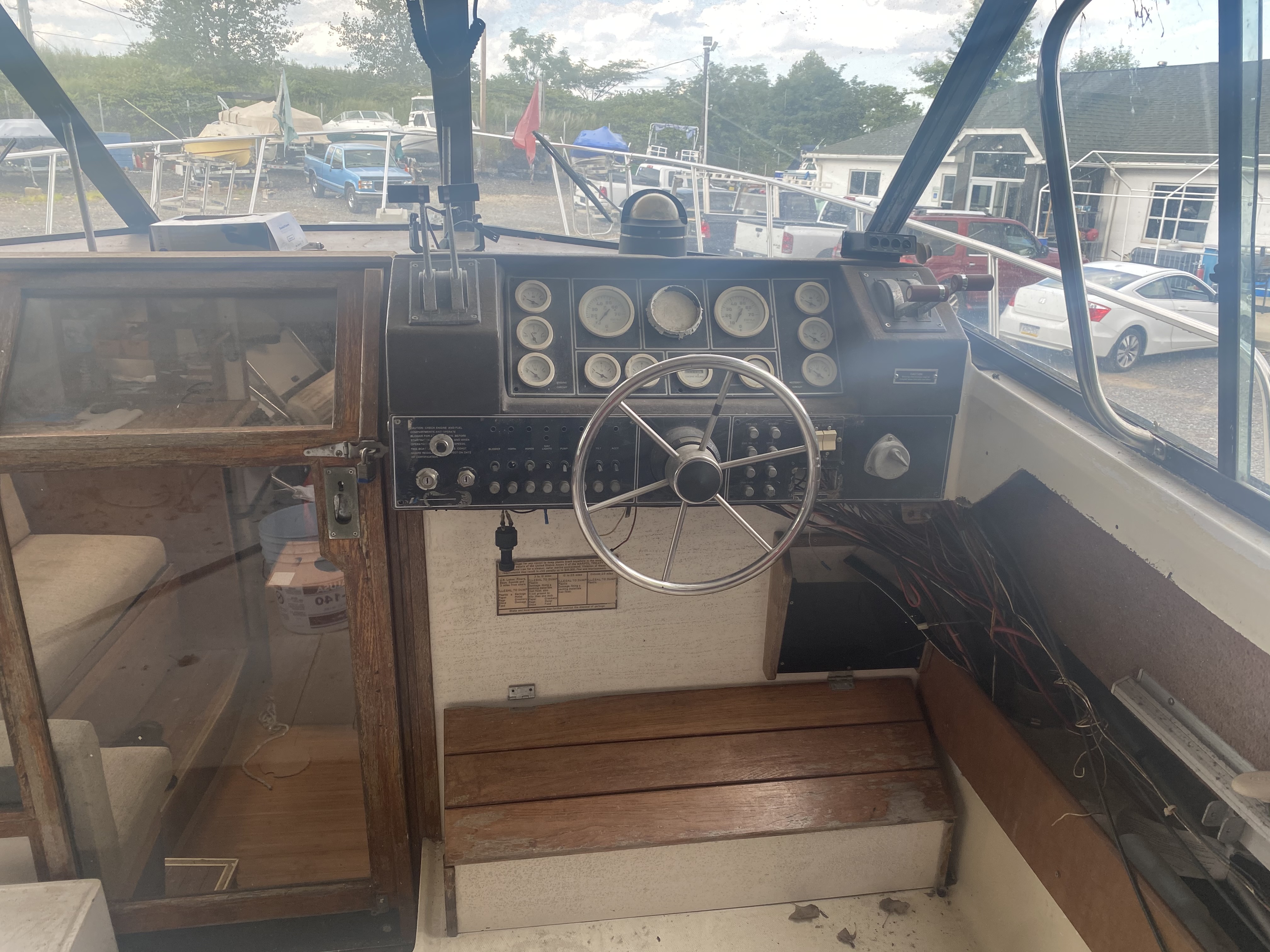 1979 Bayliner with flybridge. Boat has twin straight inboard 350 crusader motors that we repowered about 10 years ago. Both engines have under 150 hours on them. Clean cabin with hatchback boat cover. This boat is currently on land but is ready to drop in the water. Great cruiser boat for the whole family
