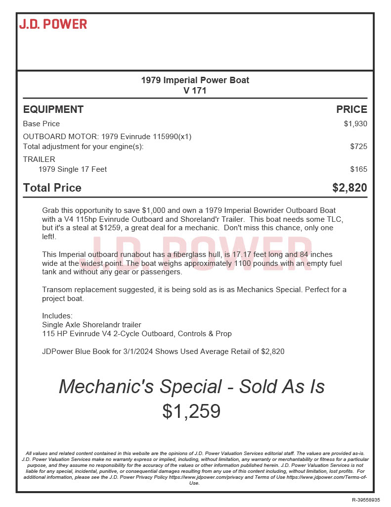 Grab this opportunity to save $$$, own a 1979 Imperial Bowrider Outboard Boat with a V4 115hp Evinrude Outboard with Power Trim & Tilt and Shoreland'r Trailer. This boat needs some TLC, but it's a steal at $750, a great deal for a mechanic. Don't miss this chance, only one left!.