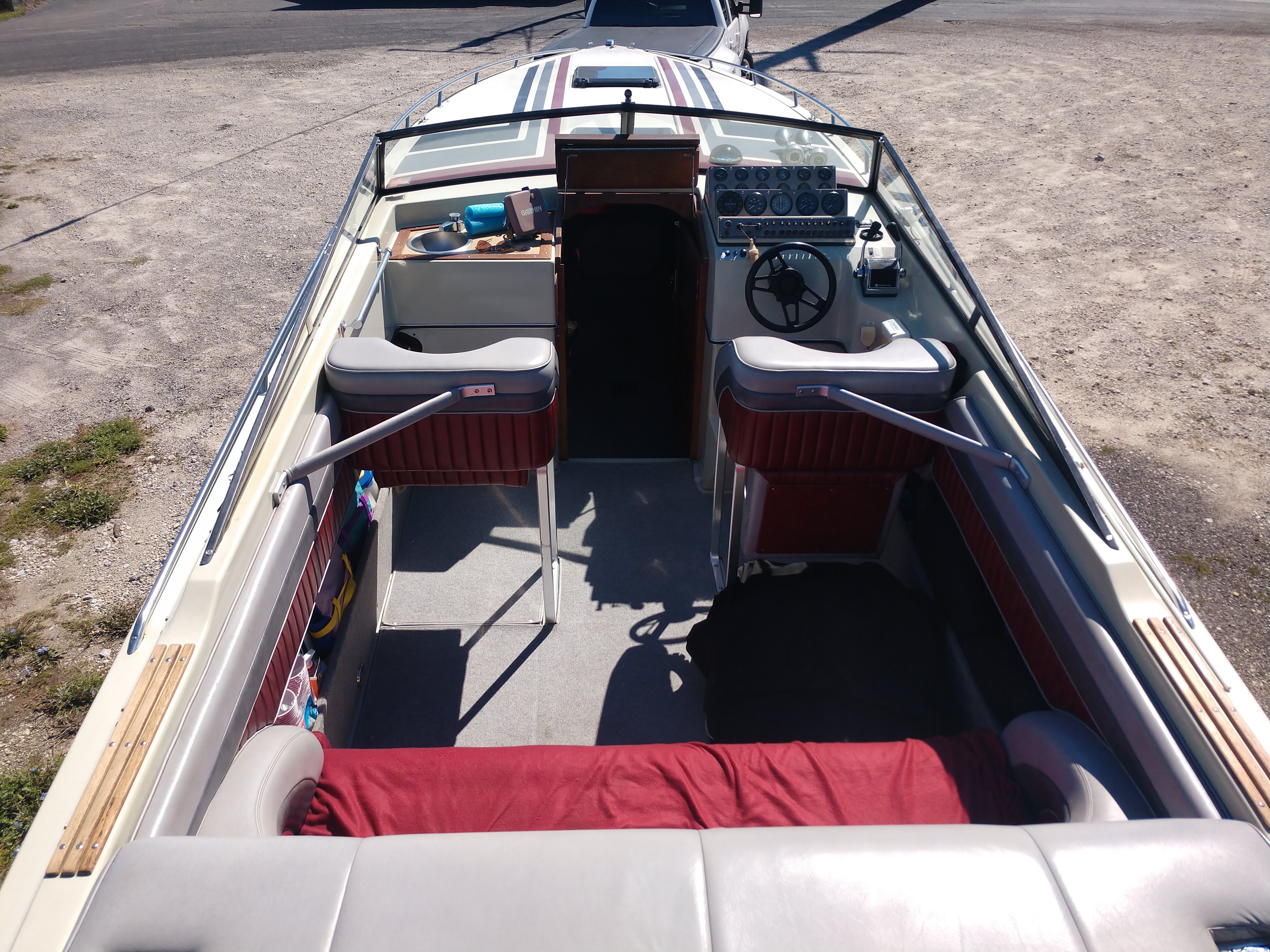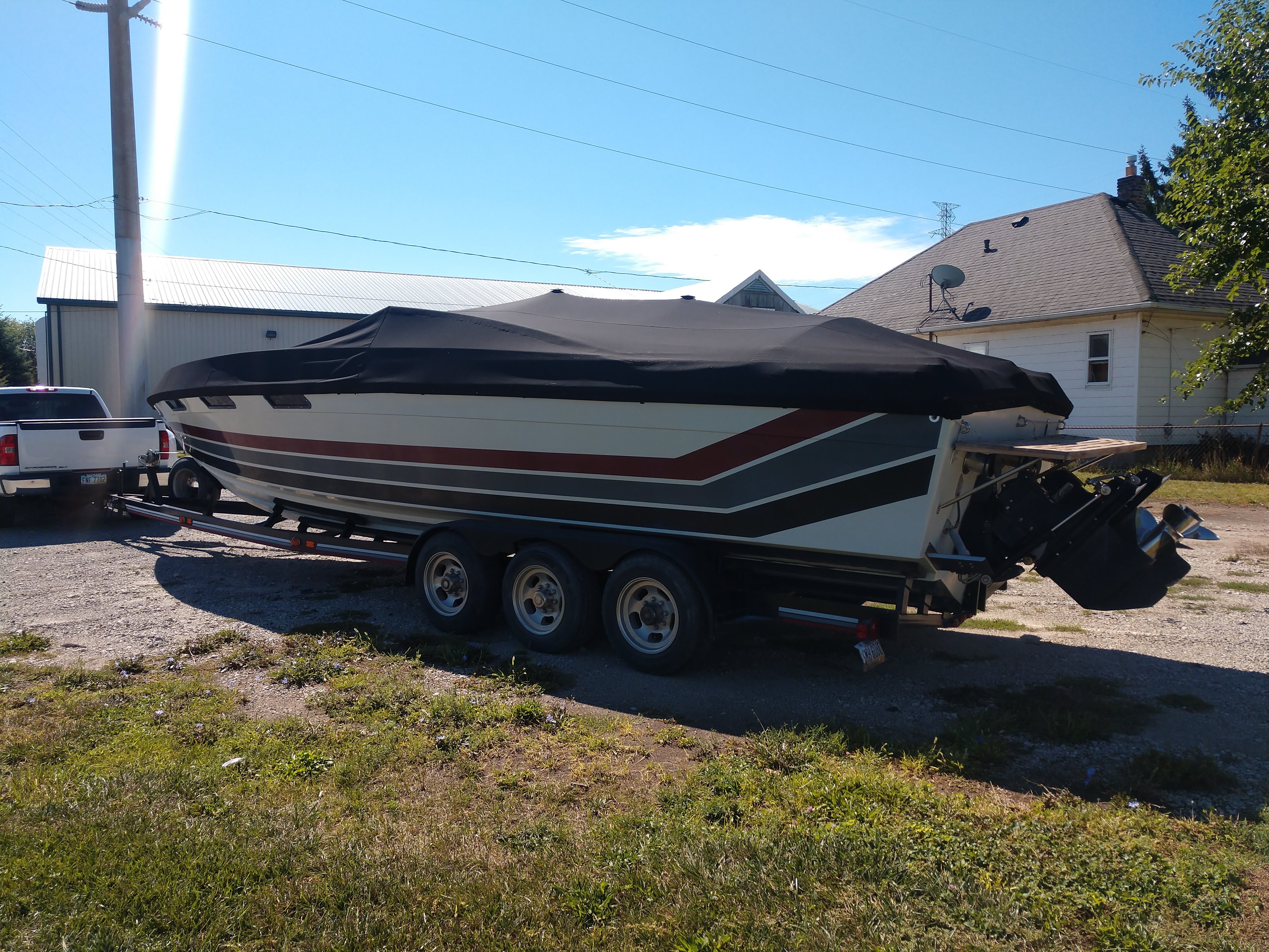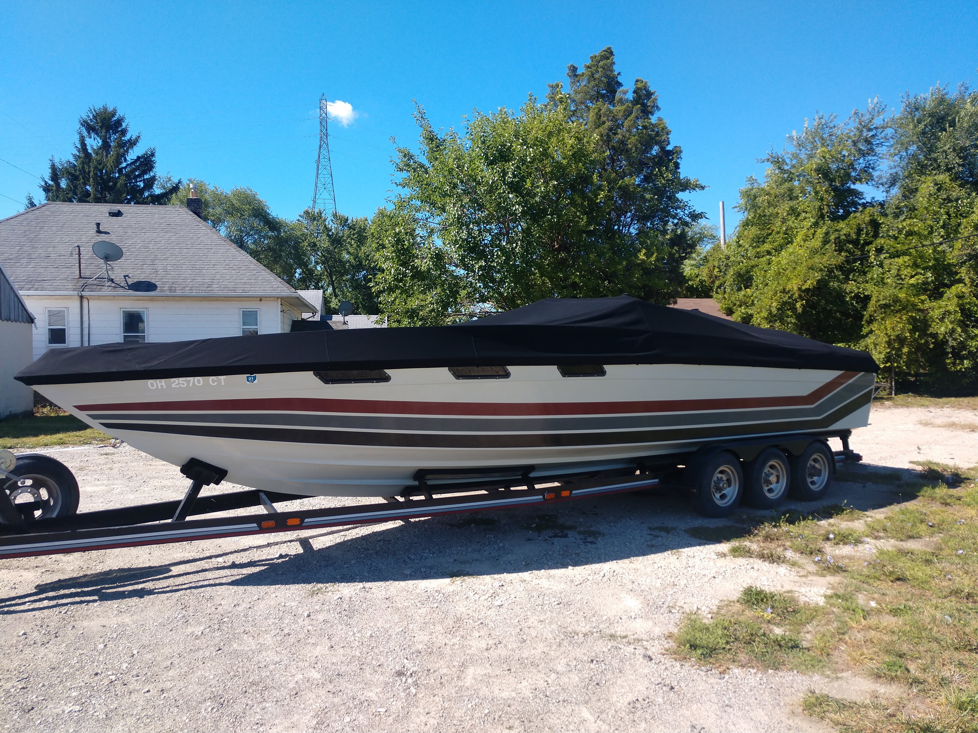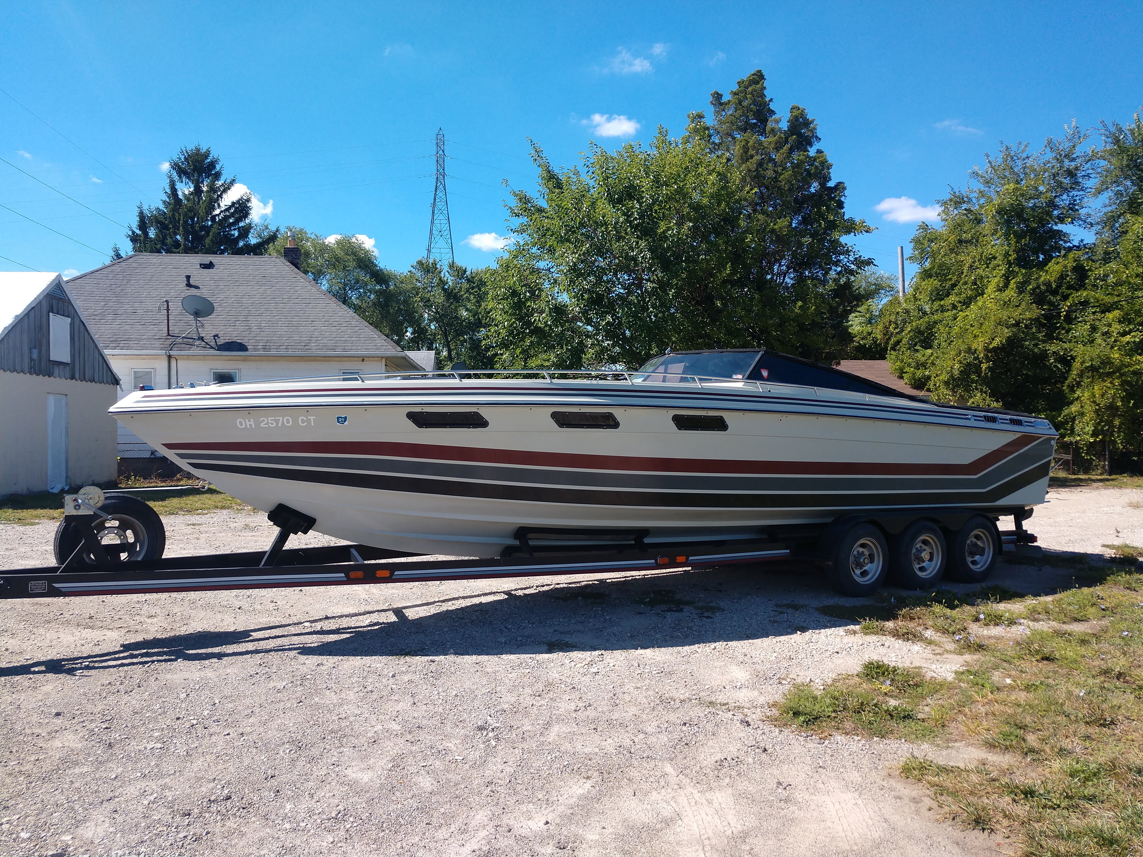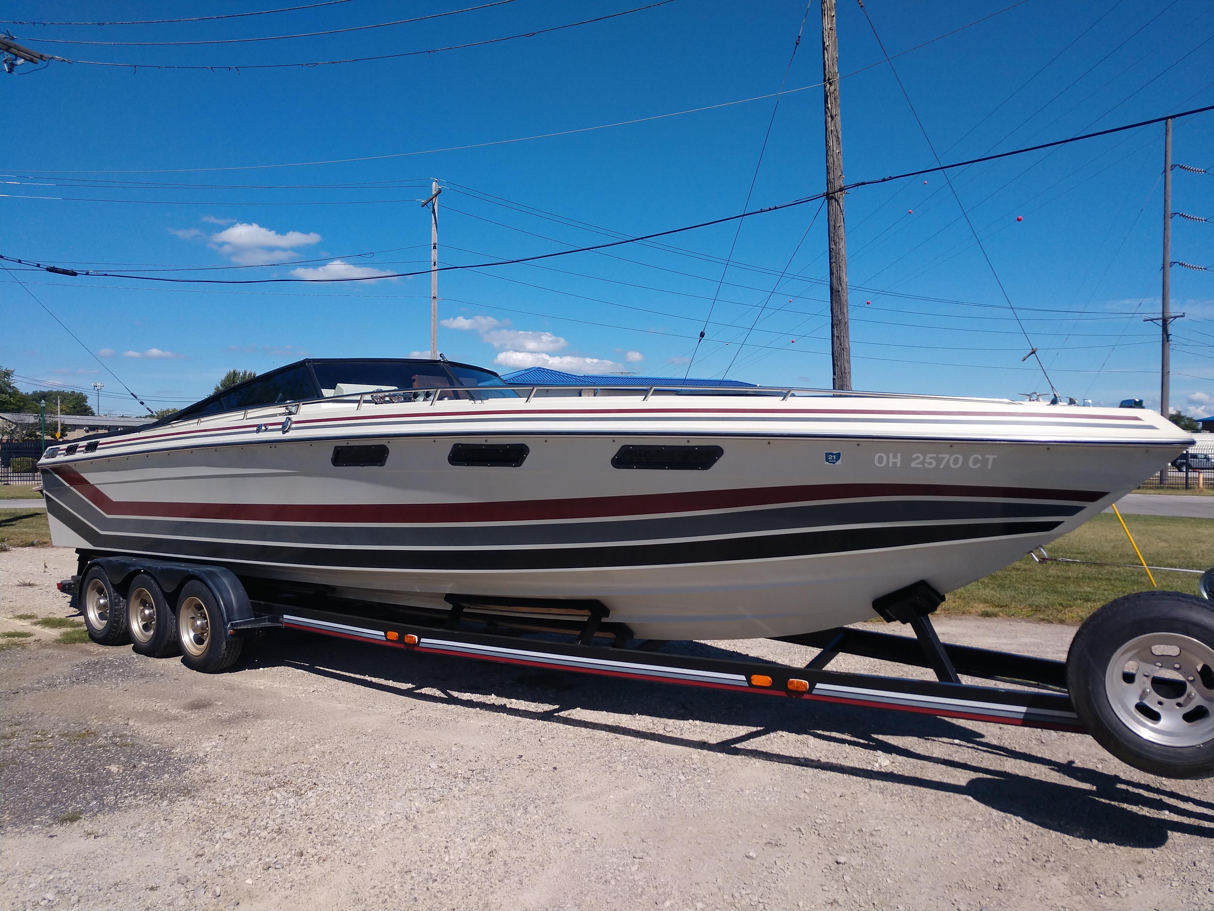 This boat is ready to go. Its current owner of 30 years has maintained this boat with an open check book. It is powered with Twin 420HP Mercury motors. The motors have been rebuilt they currently have 400 hrs on the port and 15 on the starbord. It comes with a tripple alxe trailer, bow to stern mouring cover, cockpit cover, bimi top with enclosure and many more.