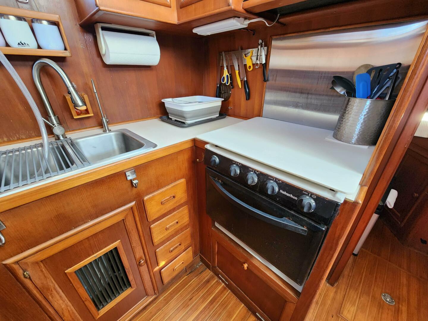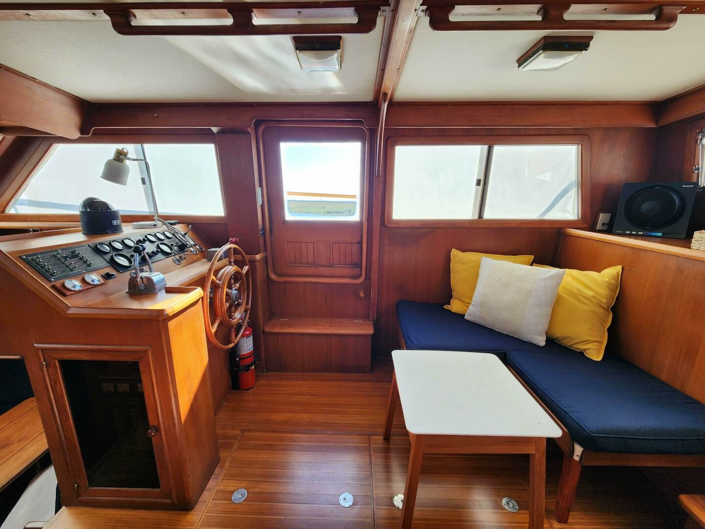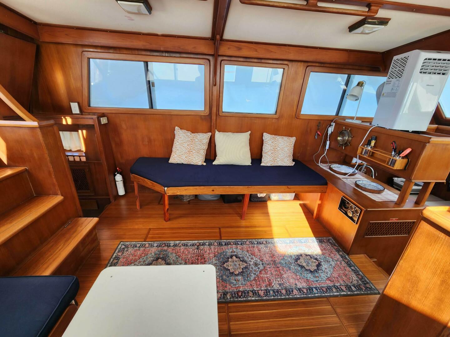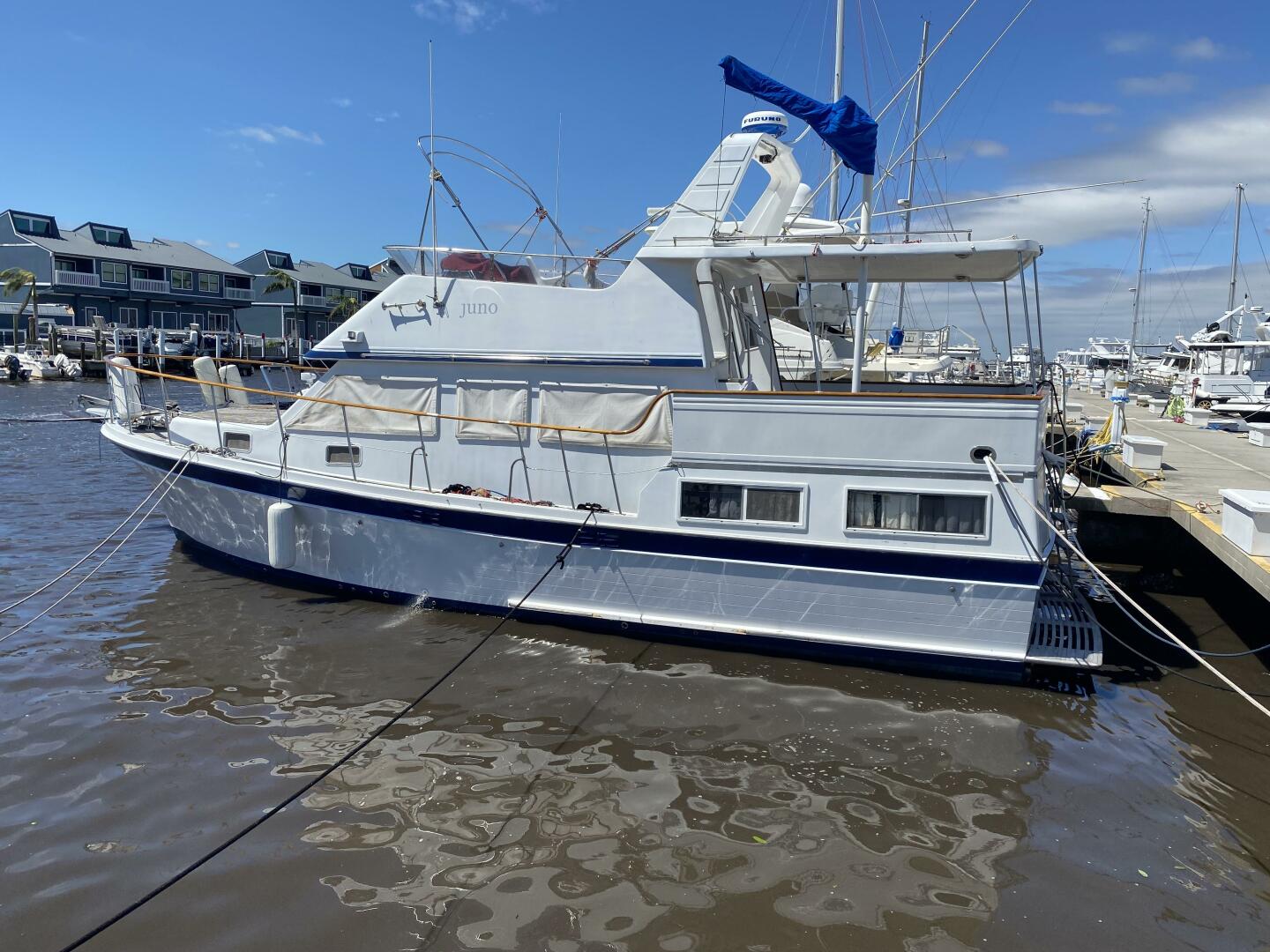 Juno’s owners completed the loop and are ready to pass her on to the next looper, cruiser or liveaboard.Highlights for this 1985 Marine Trader 40 LaBelle Sun Deck include, a recent bottom job, a sundeck davit system, well maintained twin Volvo diesel engines, a Westerbeke generator, AIS, Radar, Autopilot, reverse cycle heat/air and so much more.Welcome aboard Juno: Step onto this Marine Trader trawler through an opening in the varnished handrail from either starboard or port. The aft deck offers double doors down to the salon area, steps up to the flybridge and upper helm station or access to the swim platform via a transom door. Furthermore a sliding door on the starboard side of Juno’s deck leads inside to the helm station and salon.A joy to cruise and live on, this double cabin, two head layout vessel, features the thought after walkaround bed in the aft cabin (access steps to port of the companionway) with an ensuite L-shaped head and separate shower. A well appointed U-shaped galley can be found forward of the salon with a dinette seating area just opposite. The forward guest cabin features a double berth and a wet head and wash area. The whole interior of the boat boasts plentiful cabinetry for storage, hatches and windows (sunshades included) for lots of light and is warm and inviting. The engine room access is through multiple removable floor panels in the salon.Highlights:Engine and generator service (1/2025)Last Antifoul (March 2024) Furuno Radar, 8.4 Color, 36mi., 4KW 19 DomeRaymarine EV100 AutopilotAISNebolink (automatic tracker/gps that logs e.g. speed etc.)Davit lift (Aluminum dingy davit arm with electric winch)Boat Wet Exhaust Overheat and Bilge alarmsDinghy and electric OB included in the saleElectronics/Electrical:Faria 13751 Depth SounderFuruno Radar, 8.4 Color, 36mi., 4KW 19 DomeRaymarine EV100 AutopilotAIS (send)Cobra MR F45-D Fixed Mount VHF Marine RadioProMariner 44021 ProSport HD Waterproof Marine Battery Charger, 20 Amp, 3 BankELING Guaranteed Rudder Angle Gauge Indicator Richie Compass (Flybridge and lower helm)Nebolink (tracking)LED lights (Interior and Navigation)Two units: Cruise Air reverse cycle heat and air (ducted throughout the entire boat)Two start batteries (EverStart Marine Deep Cycle 750/109/27DC) (new in 2024)Two 4D House batteriesDual 30AMP shorepower outlets/cablesOtherJabsco Macerator pumpSJK Electric Marine ToiletSR SUN RISE Shower System with Handheld ShowerBosch Water Heater (2.7gallon)New interior cushionsSliding companionway bug screen doorDeck, FlybridgeLewmar electric windlass with remote controlTwo anchors. Main anchor 45lbs plow with chain and spare anchor 22lbsTwo fender holders bowWindow shades all aroundFlybridge with sink, storage compartments, two benches with cushionsFlybridge Helm coverSunbrella Bimini with frame flybridgeBoat Wet Exhaust Overheat and Bilge alarmsAft deck access to swim platform with boarding ladderAft deck can hold table and a few chairsHardtop bimini aft deckStorage compartmentsAluminum dingy davit arm with electric winch Below the waterlineRebuilt propellersNew Antifoul (March 2024)GalleyAquasure water filterDouble SS sink galleyFrigidaire EFR451 2 Door Refrigerator/FreezerDomende 12 Volt Refrigerator 54qt Portable Freezer Electric Cooler (stored forward)Black & Decker MicrowaveSuburban Three burner propane stove and oven Mechanical:Dual Volvo Penta TAMD-40B Diesel Engines 165 HP:Port (4073 h)Starboard (4262 h)Westerbeke WMD 8kw Diesel Generator (3215 h)Drive Type: Direct DrivePropeller: 3 Blade BronzeTanks:Water 200 G - one stainless steel tank under the aft cabin berth Fuel 350 G - two on each side of the engineBeam: 13’5”Draft: 3’5” Bridge Clearance: 21’3’’ Displacement: 23,000Headroom lowest 6’4’’ average around 6’6’’. Both berths have a length of around 6'8".Cruising speed: 8kntMax speed: 10 to 12kntRange: Owners cruised at 1,500 rpm at about 6.5 to 7.5 knots and burned 2.7 gallons per hour with the generator running. Average around 4.5 gallons/h (depending on speed, current etc.)