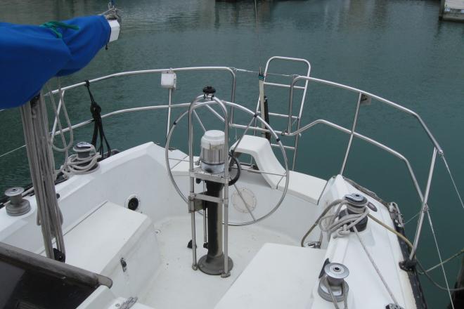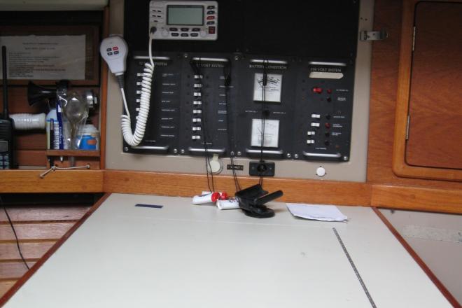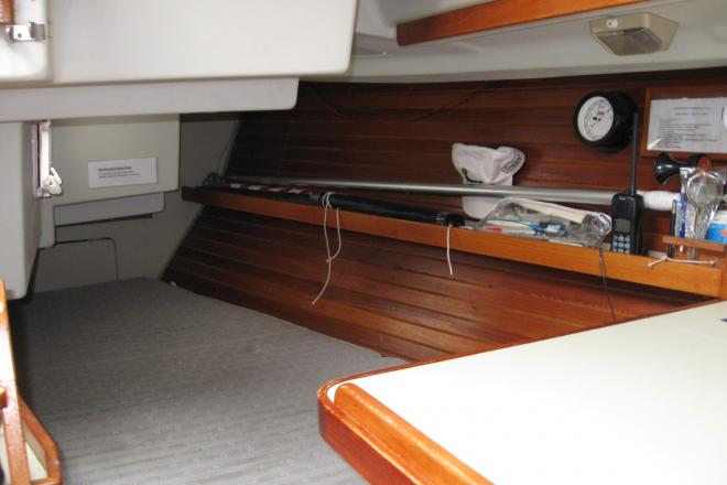 STANDING & RUNNING RIGGING : Mast ,boom , spinnaker pole all aluminum. Shrouds and stays stainless steel rods with the exception of forestay which is wire, RF feature. Backstay rod with Navtec Hydraulic system rebuilt 2018. Mast lightning replaced with new tri-color LED Aqua light at top of mast; Steaming and foredeck combo light added. Sheaves in mast all replaced with bronze bushings. Running rigging is all lines led aft to cockpit through rope clutches and to four winches at the end of cabin roof. Four winches in cockpit two as primary for jib and the other two for spinnaker work. Barient and Andersen winches. Harken roller furler RF. Edson wheel steering with binnacle mount compass.