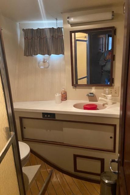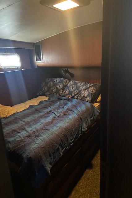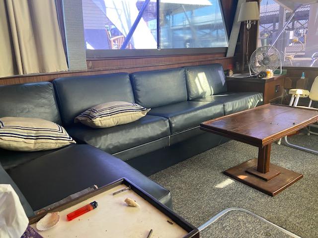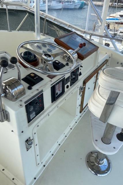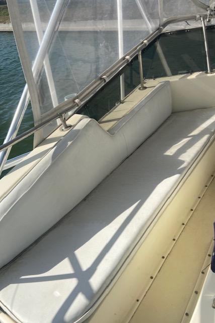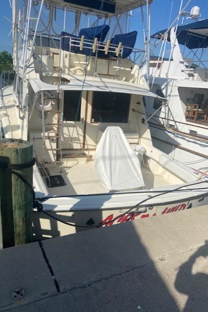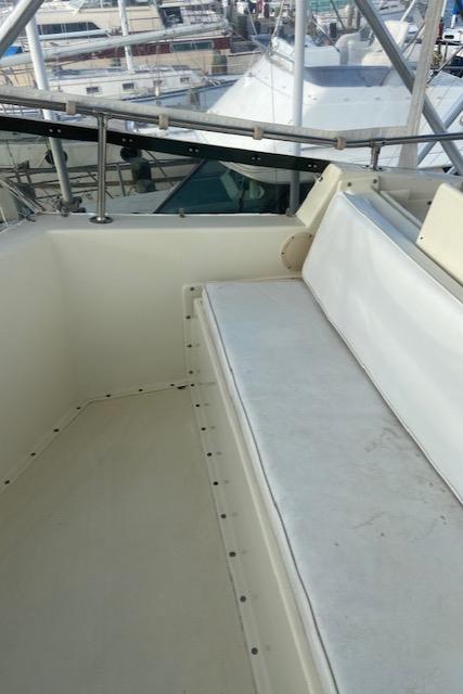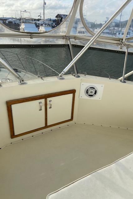 Hatteras 45 Convertible Built on a solid fiberglass hull with moderate beam and shallow keel, the 45 was a popular model for Hatteras. Key to her success was a two-stateroom, galley-down interior whose spacious salon and luxury-class amenities were perfectly suited for cruising and entertaining. A built-in lounge sofa to starboard in the salon opens to reveal a large rod storage locker, and wraparound windows offer panoramic views of the water. Three steps down, the galley includes a full-size refrigerator as well as generous storage. The master stateroom has a private en suite head with stall shower. Forward, the bow stateroom has V-berths and private access to the head compartment. The huge 132 square-foot cockpit came standard with an in-deck fish box, tackle center, and transom door. Detroit 535hp 6V92 diesels cruise the Hatteras 45 at 20–22 knots (mid 20s top).