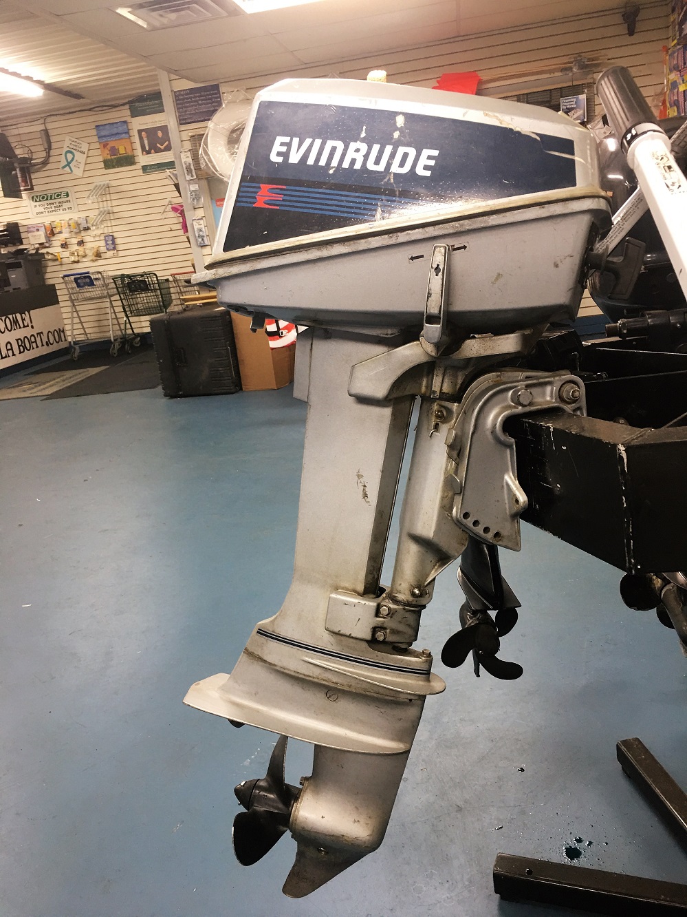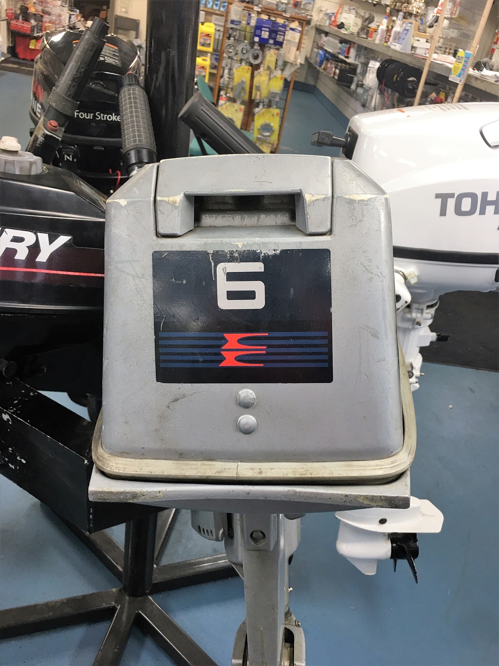 EVINRUDE 1987 OUTBOARD 6 HP, car gasoline. Model E6RCUD from Belgium, short shaft, well maintained, working well. Not sure of total hrs. Good quality engine, light weight, low noise, requires low maintenance. General fair to good condition.