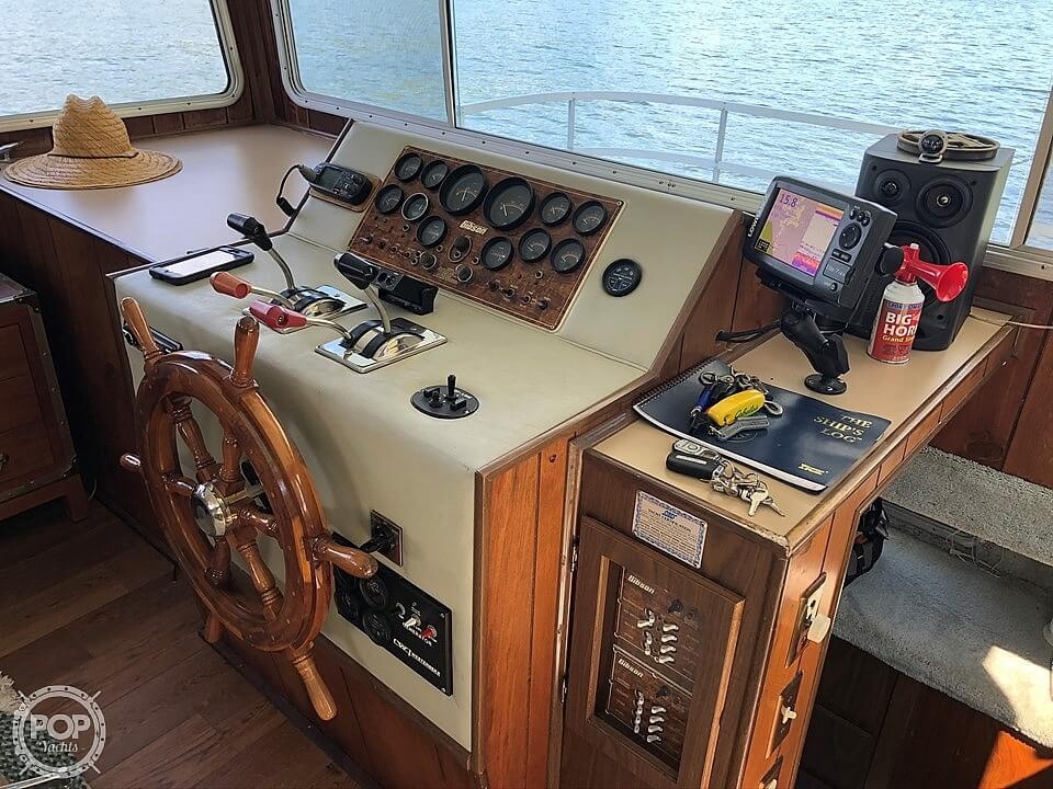 Main cabin, galley, captains quarters, shower and bathtub, two cubbie bunks, two heads, westerbeke generator, upper and lower decks!