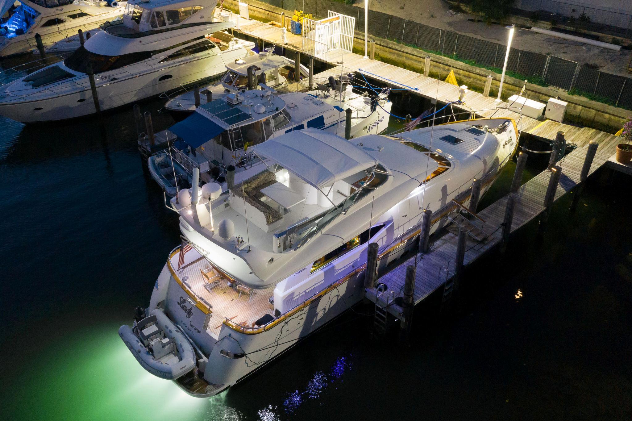 Maiora quality construction, built like a ship and has the feel of much larger yacht. Low hours on her 1150hp engines. VIP stateroom doubles as a 2nd master with kingsized bed. Guest stateroom sleeps 3. Crew quarters fwd with private entry. Features bow and stern thrusters, yacht controller, plus added 3rd docking station aft. 11' AB tender included.