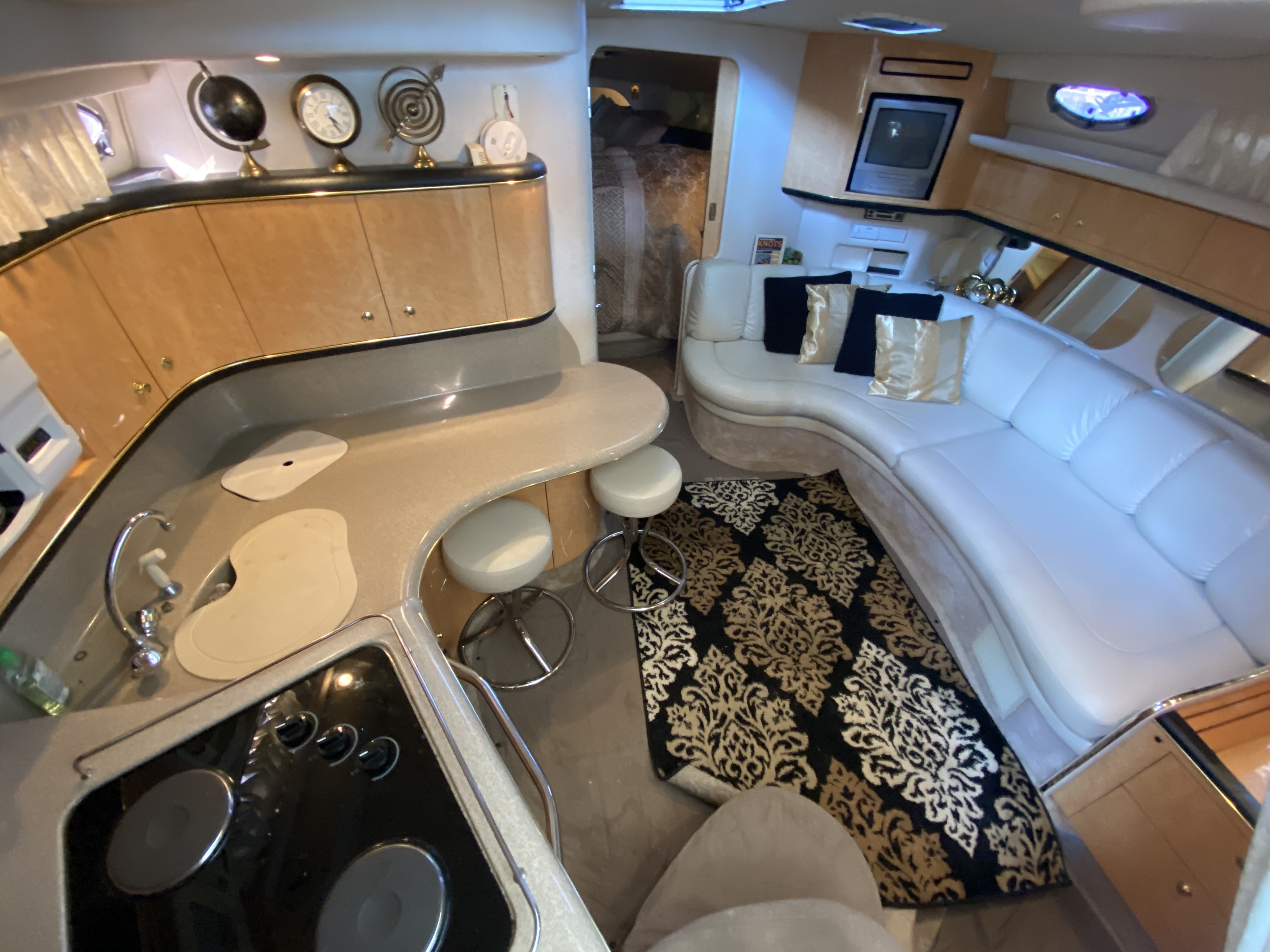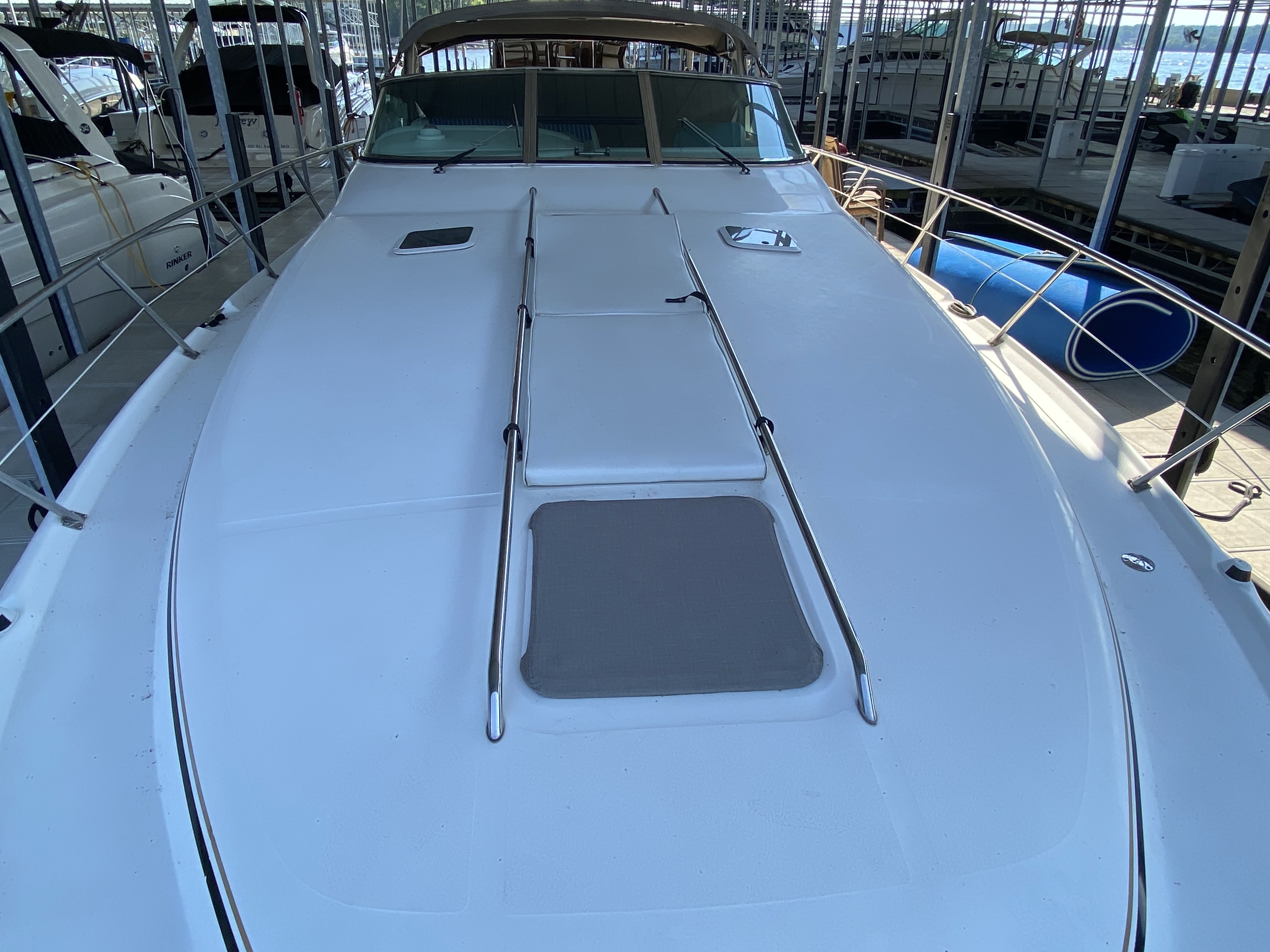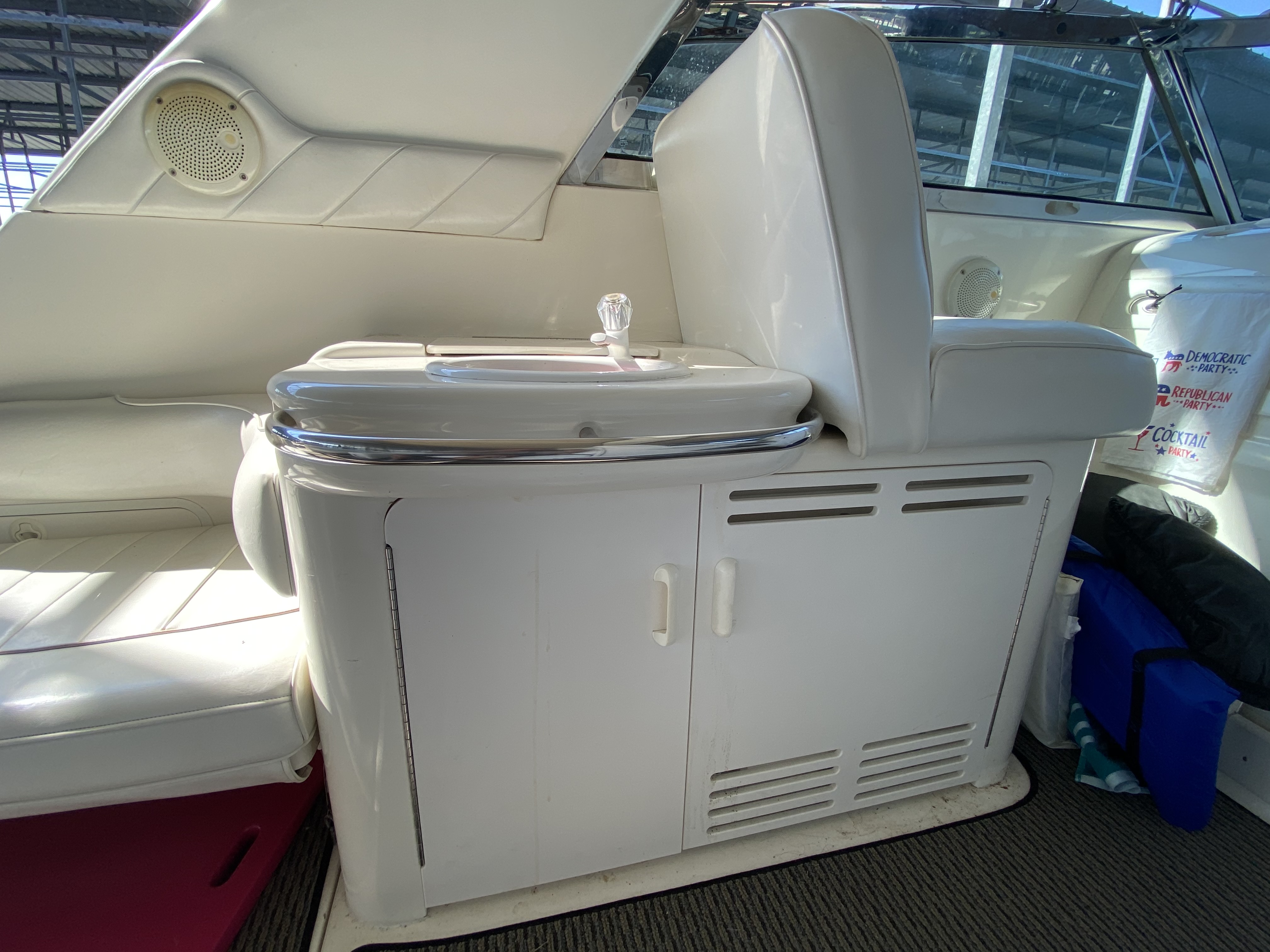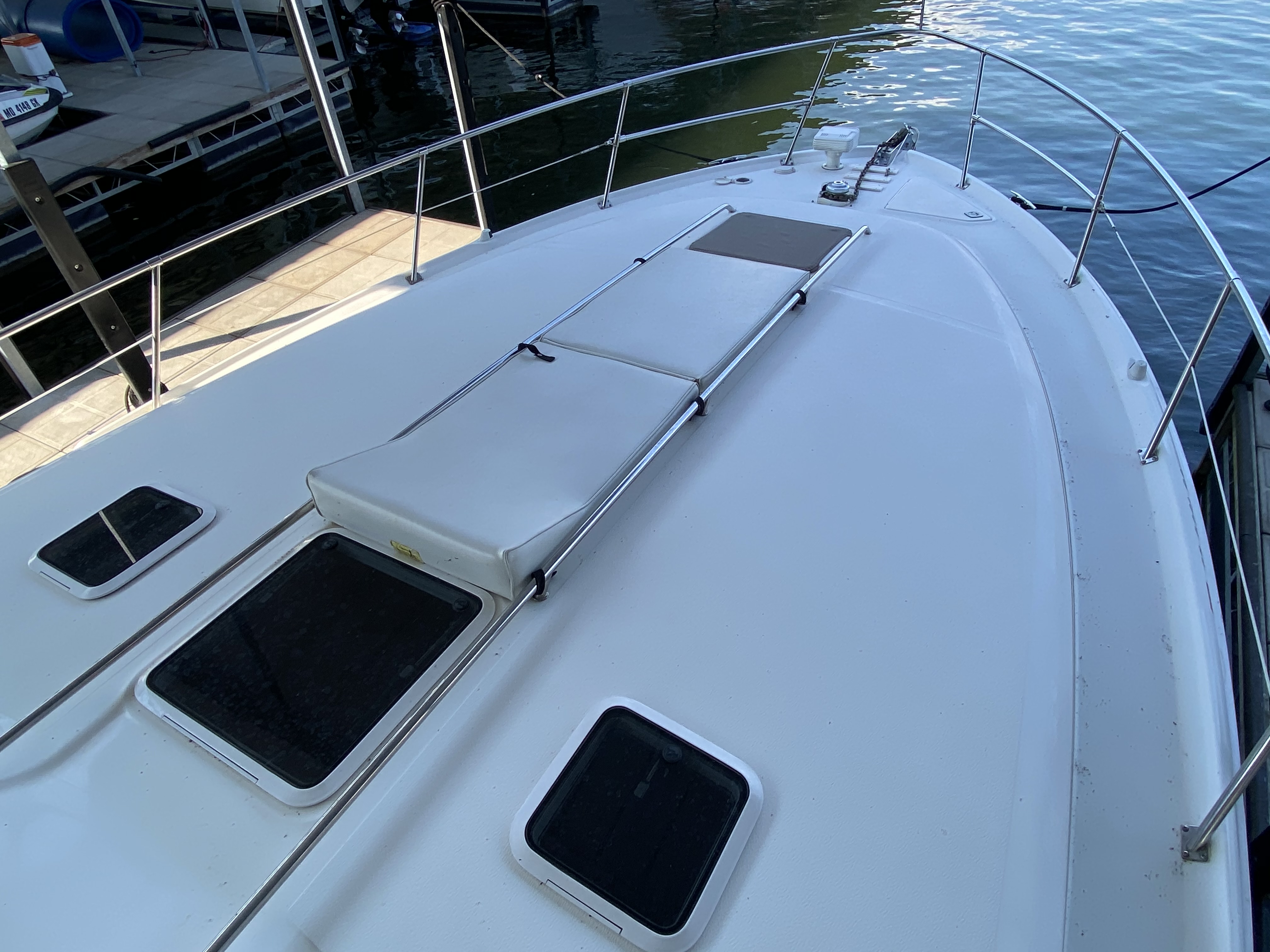 Deck/Hull: Pulpit/anchor, compass, dock power, swim platform, transom storage, spotlight, wet bar with ice maker and sink. Bimini top, full enclosure, cockpit cover, and forward sunpad.