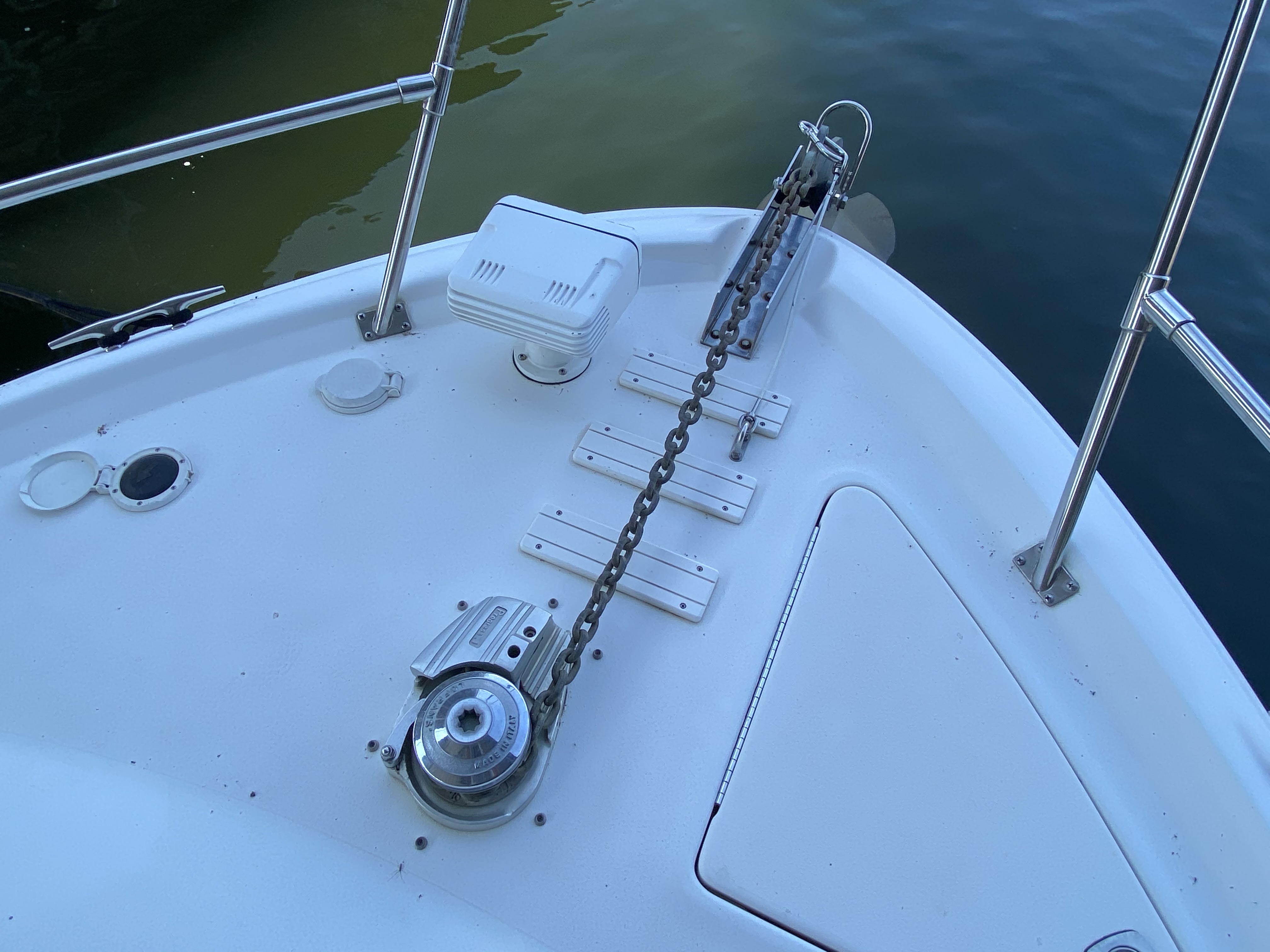 Elec/Mech: 2 A/C-heat, anchor windlass, Raytheon R41XX radar, VHF, depthfinder, synchronizer, trim tabs, halon, closed cooling, water heater, and battery charger.