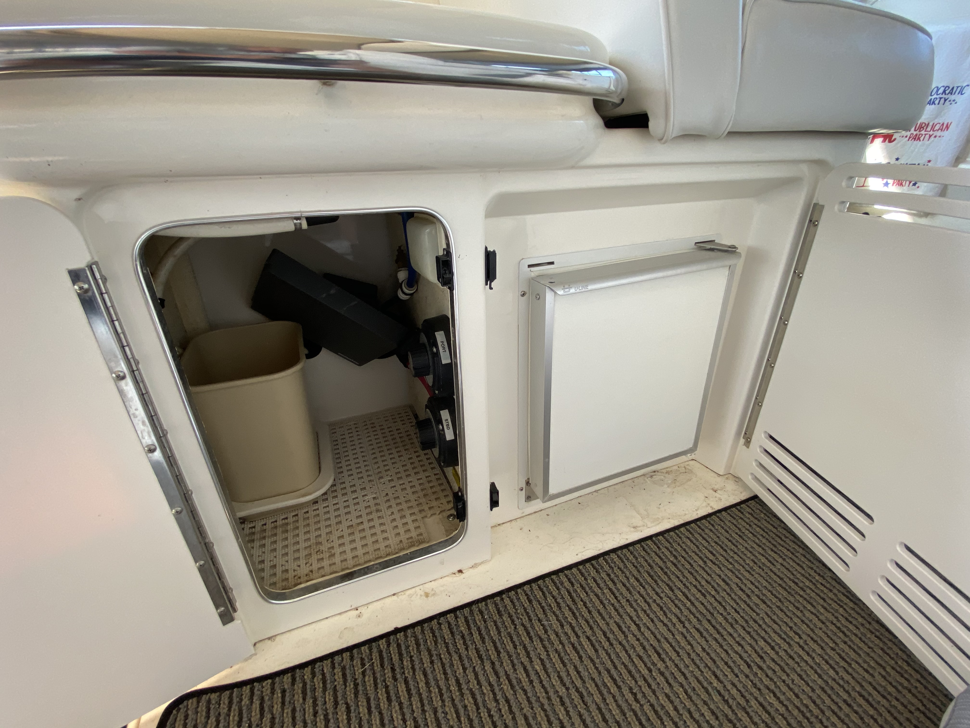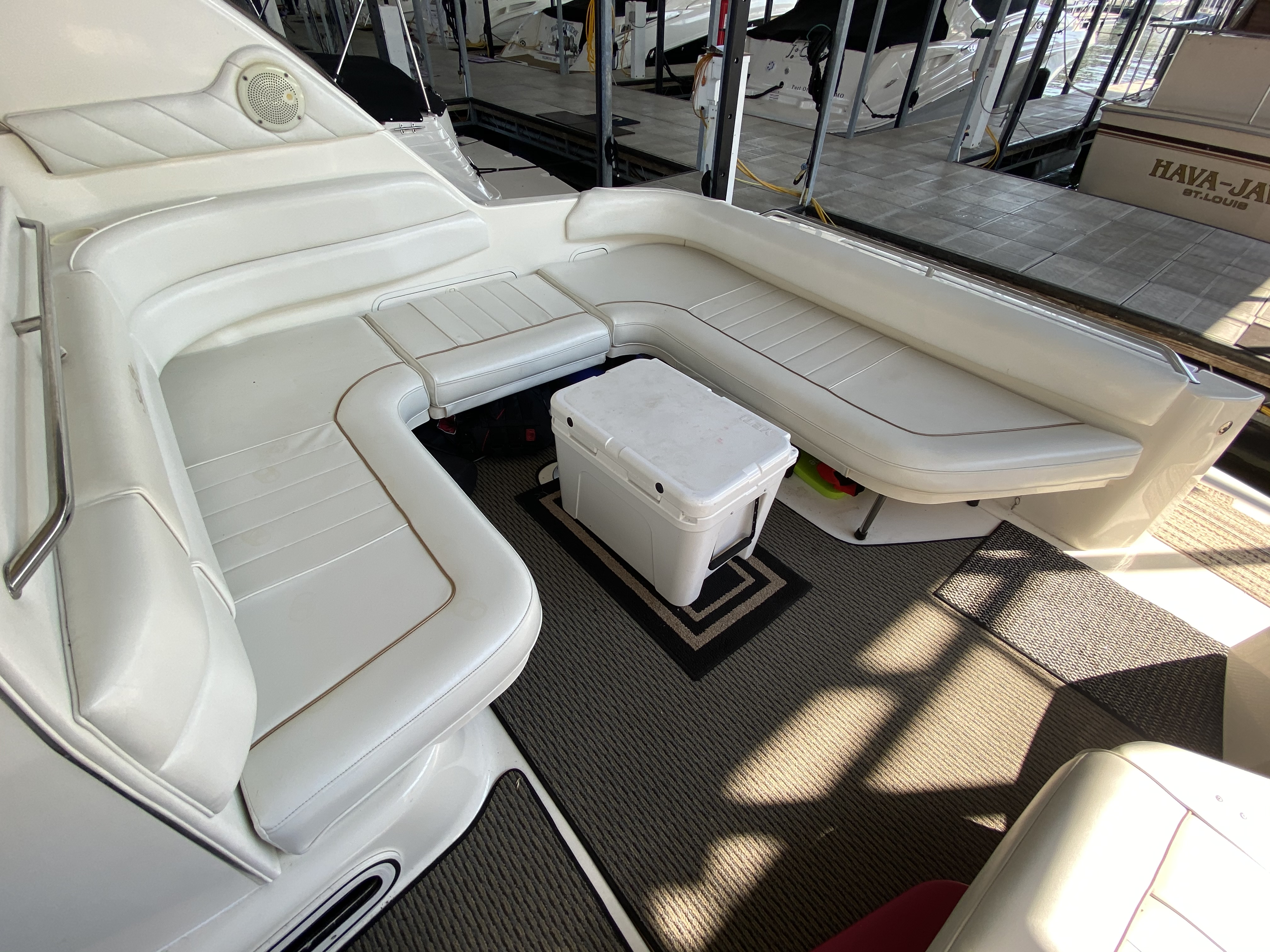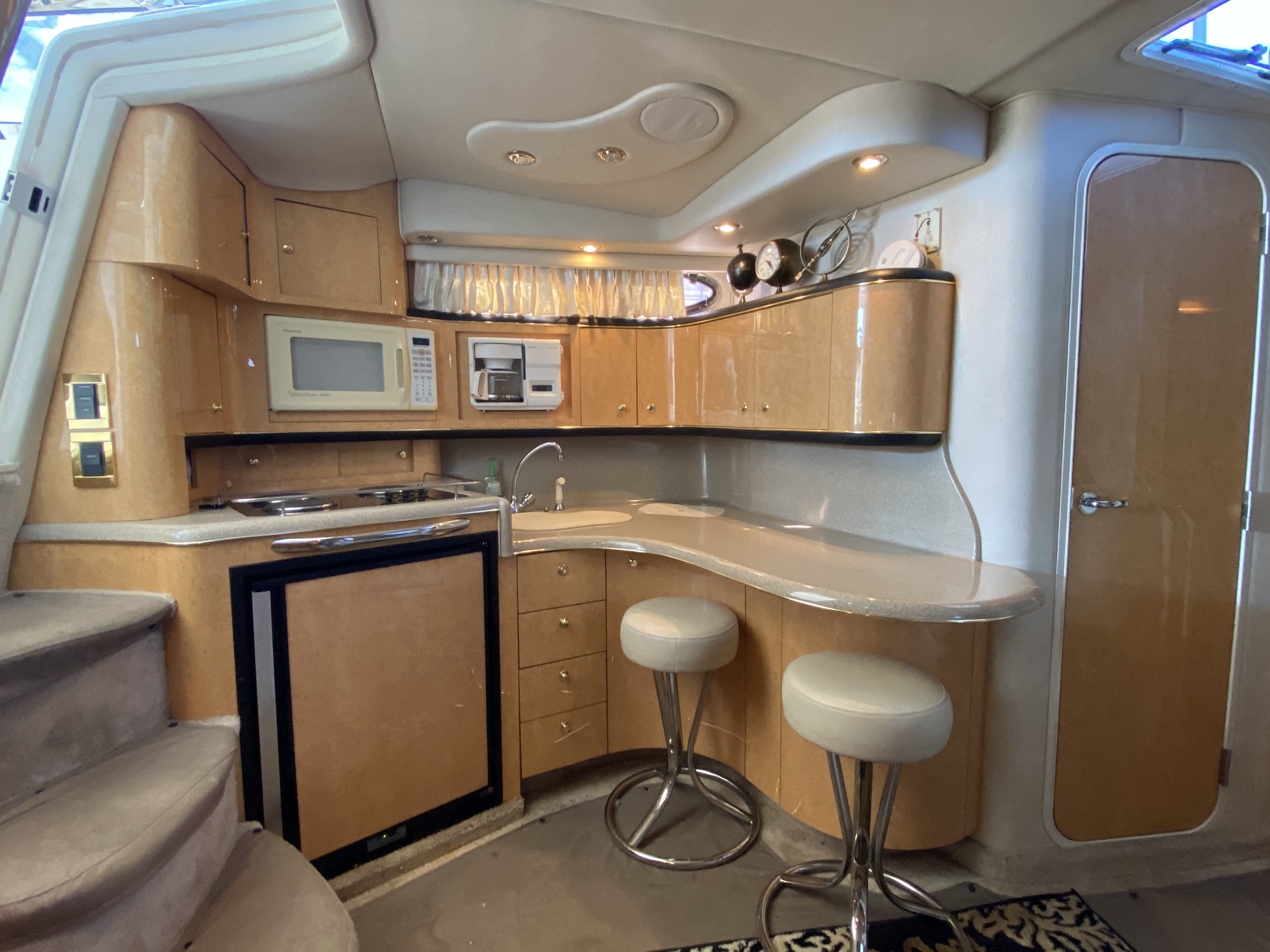 Stylish cruiser that offers style, space, and comfort. Roomy cockpit and sleeping for 6 in cabin with a privacy door for forward stateroom. Beautiful maple cabinets, fuel injected engines, and only 500 hours makes this boat the complete package.