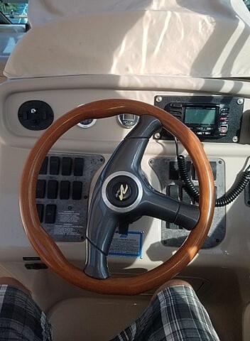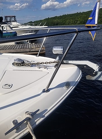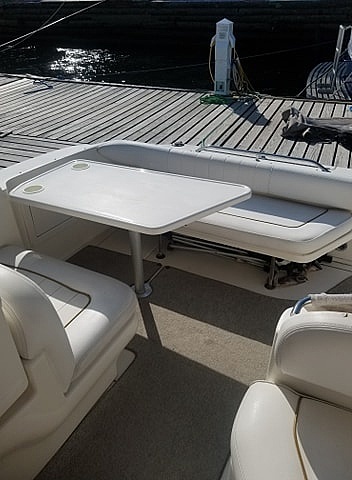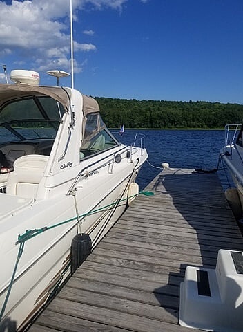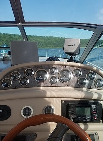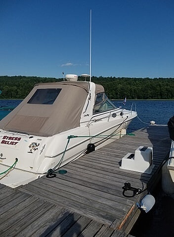 This boat is located in Gardiner, Maine and is in good condition. She is also equipped with twin Mercruiser engines that have 585 hours.