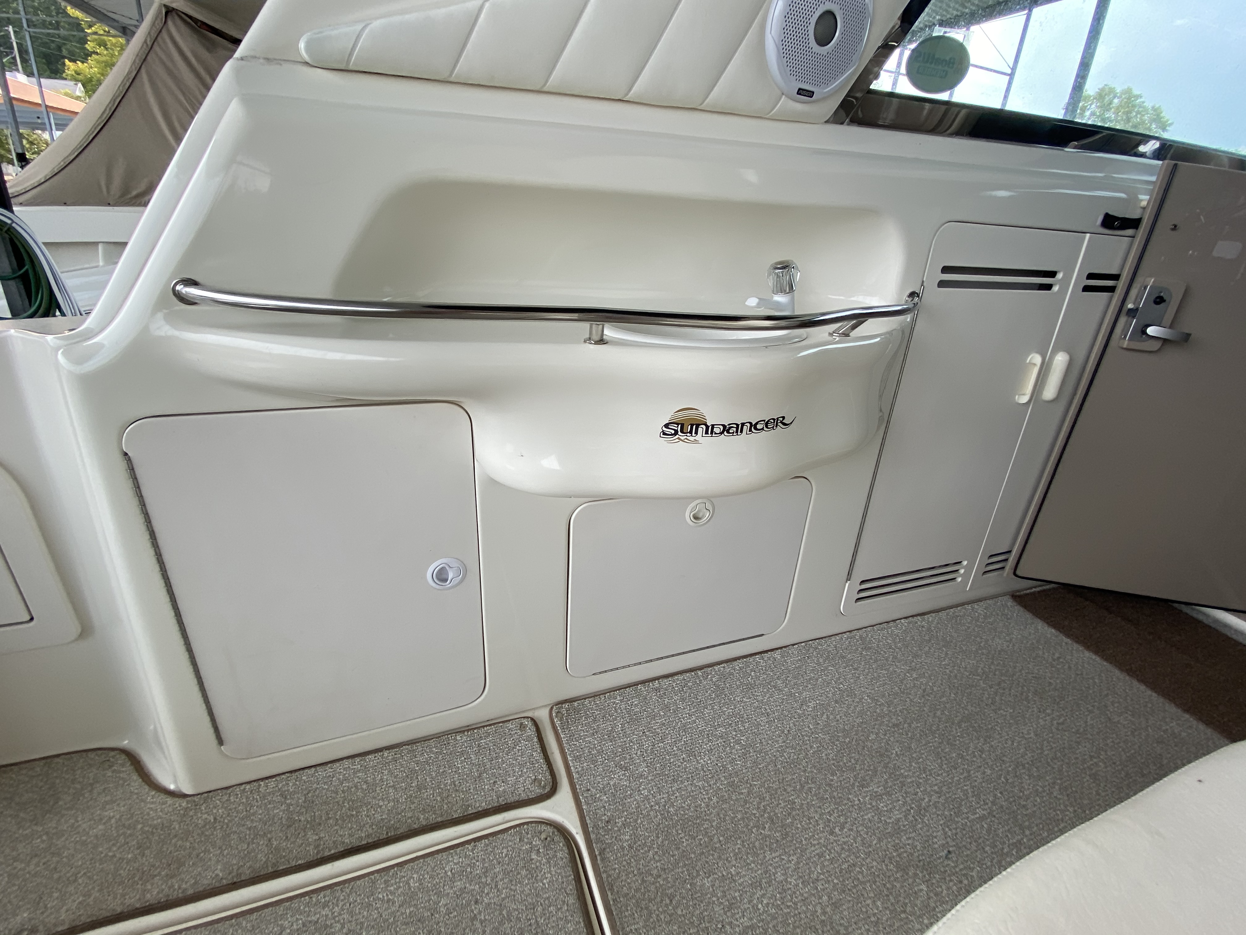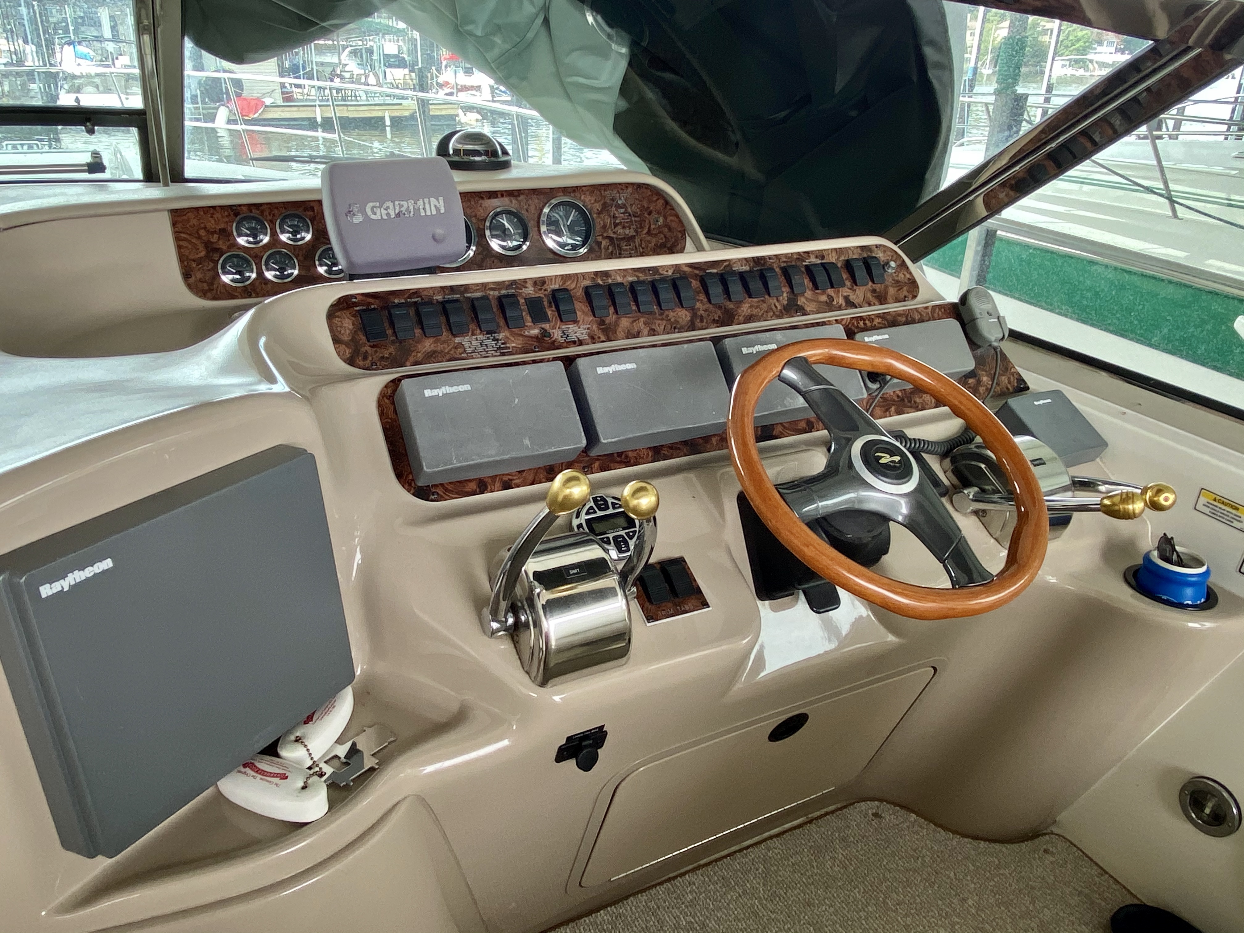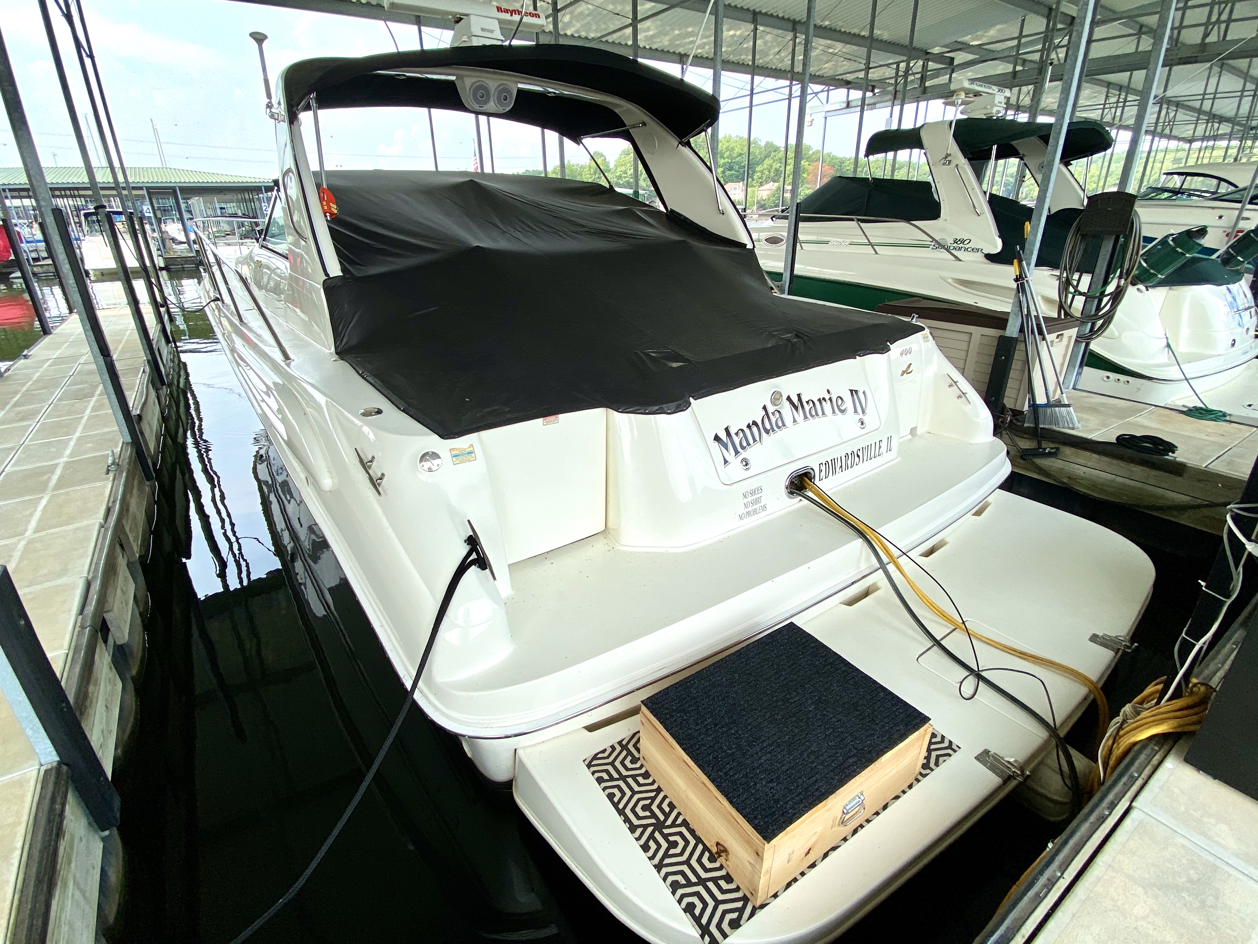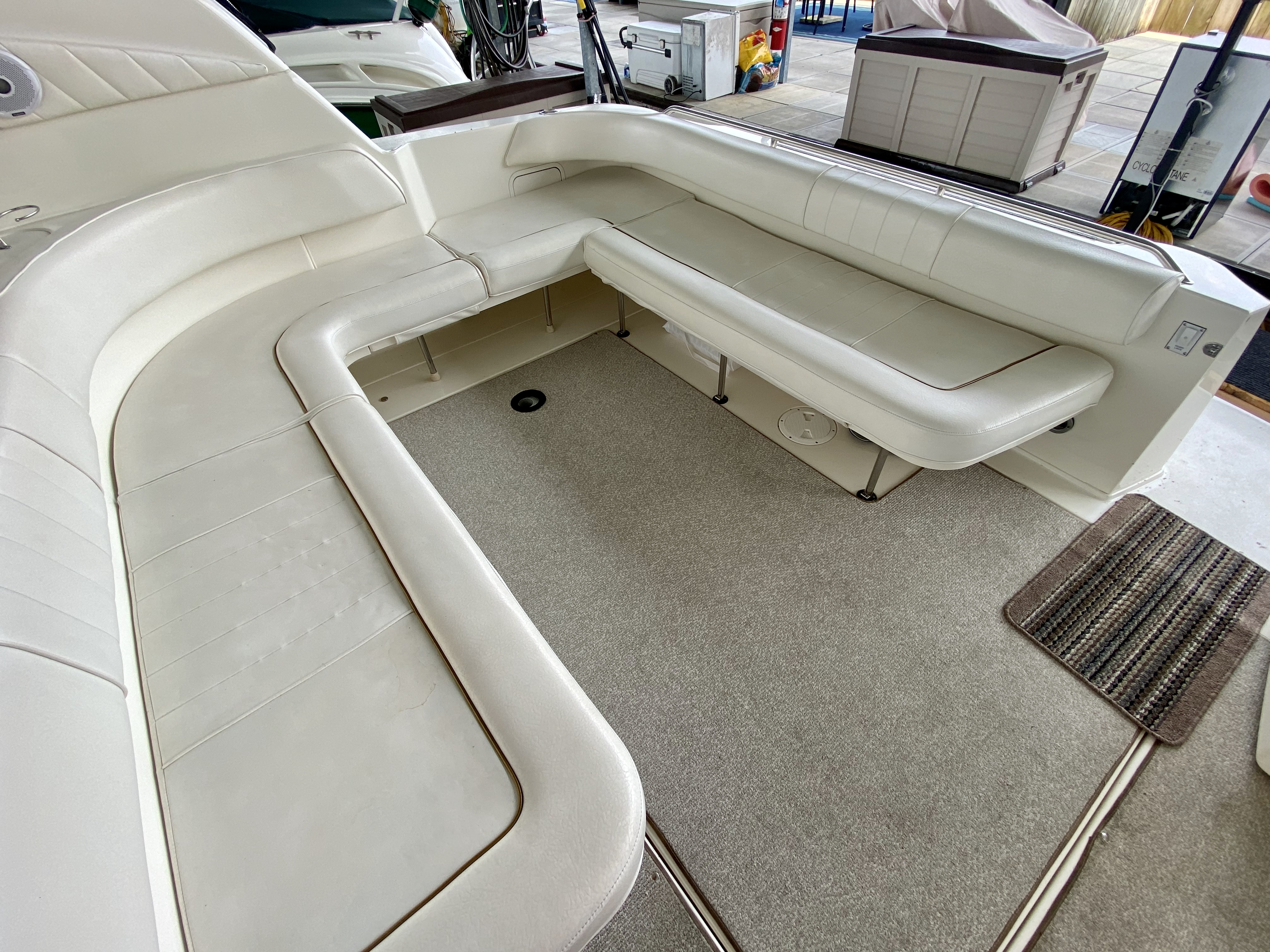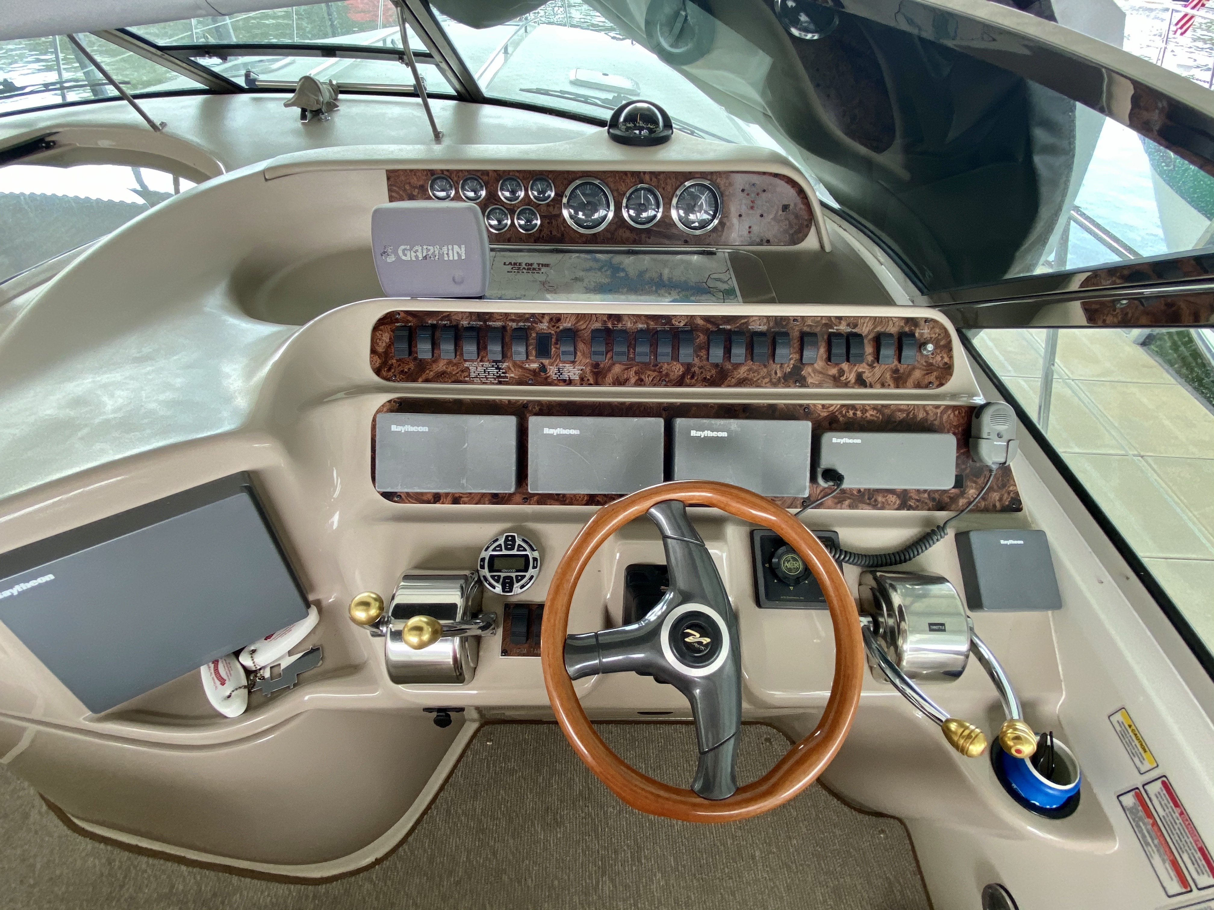 Deck/Hull: Anchor, Shore Power, Compass, Transom Shower with hot and cold water, Transom Storage, Spotlight, Windshield Wipers, Shore Water, Wet Bar w/ Sink, Large Swim Platform, Radar Arch, and Cockpit Carpet.