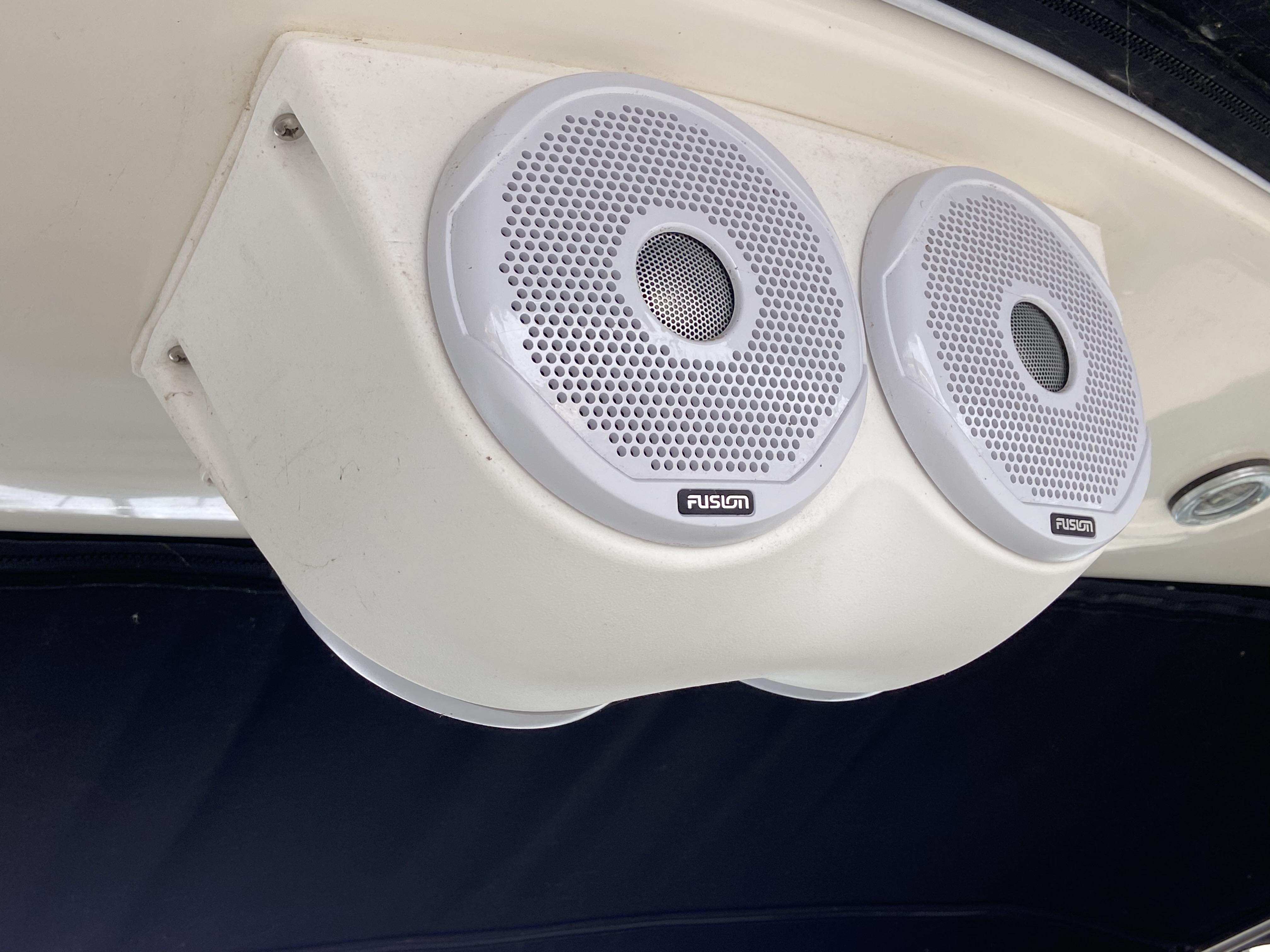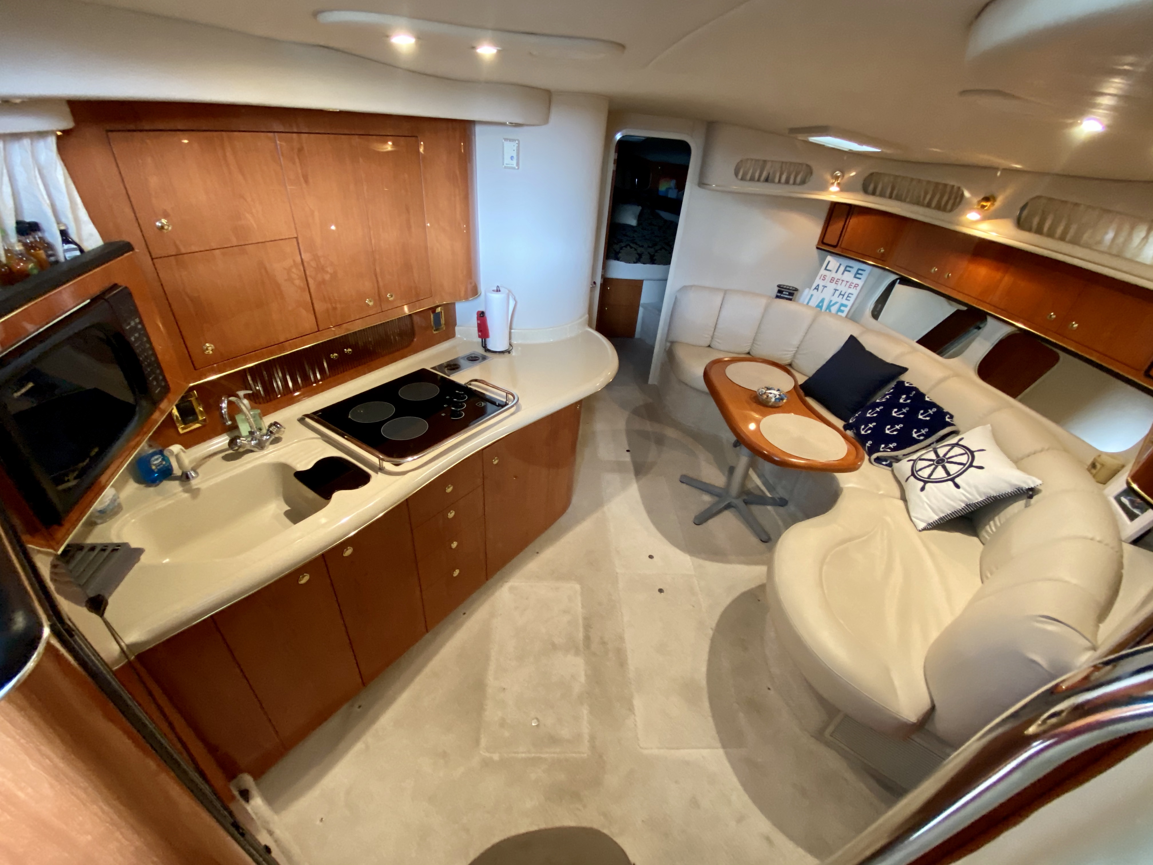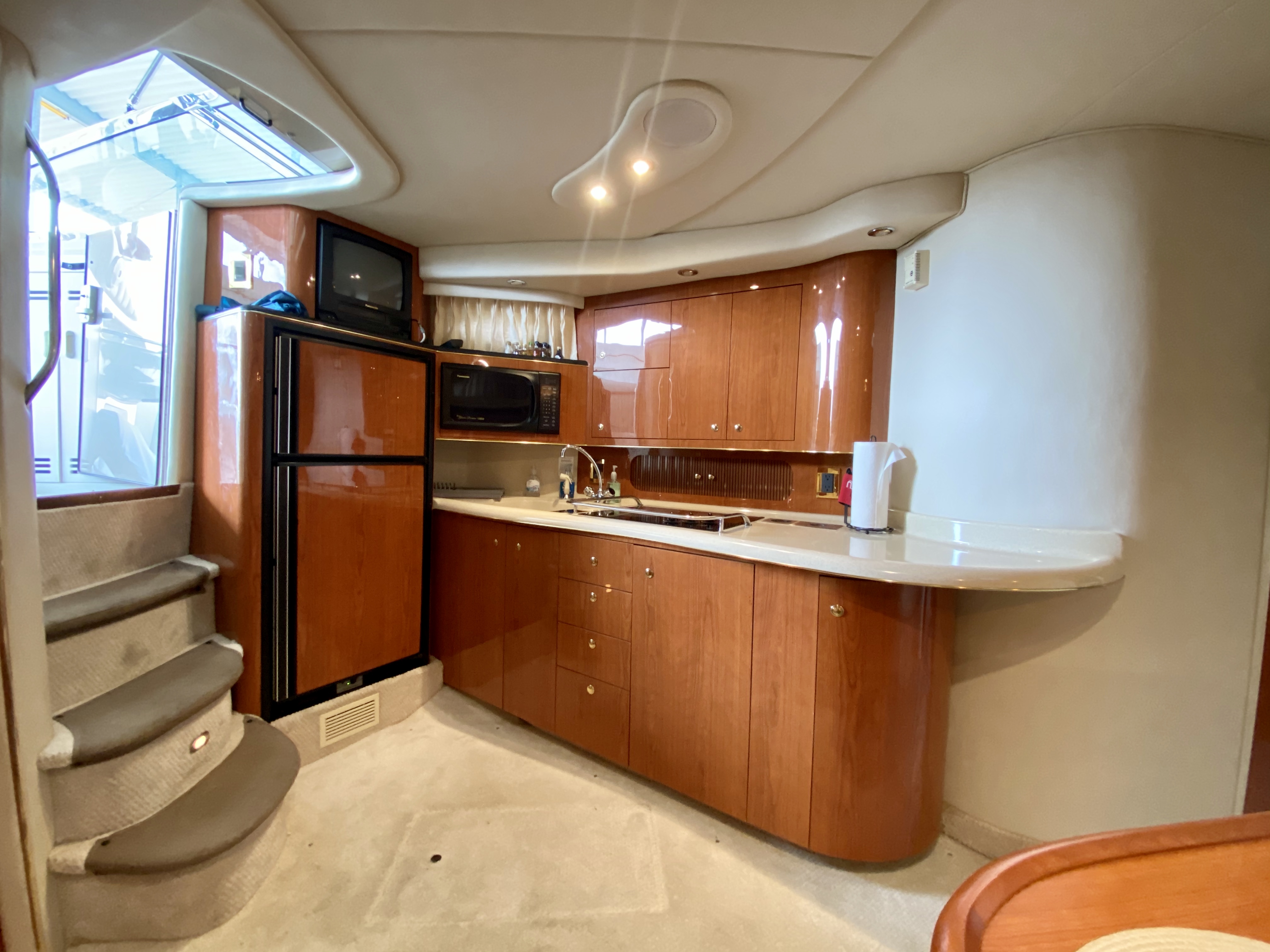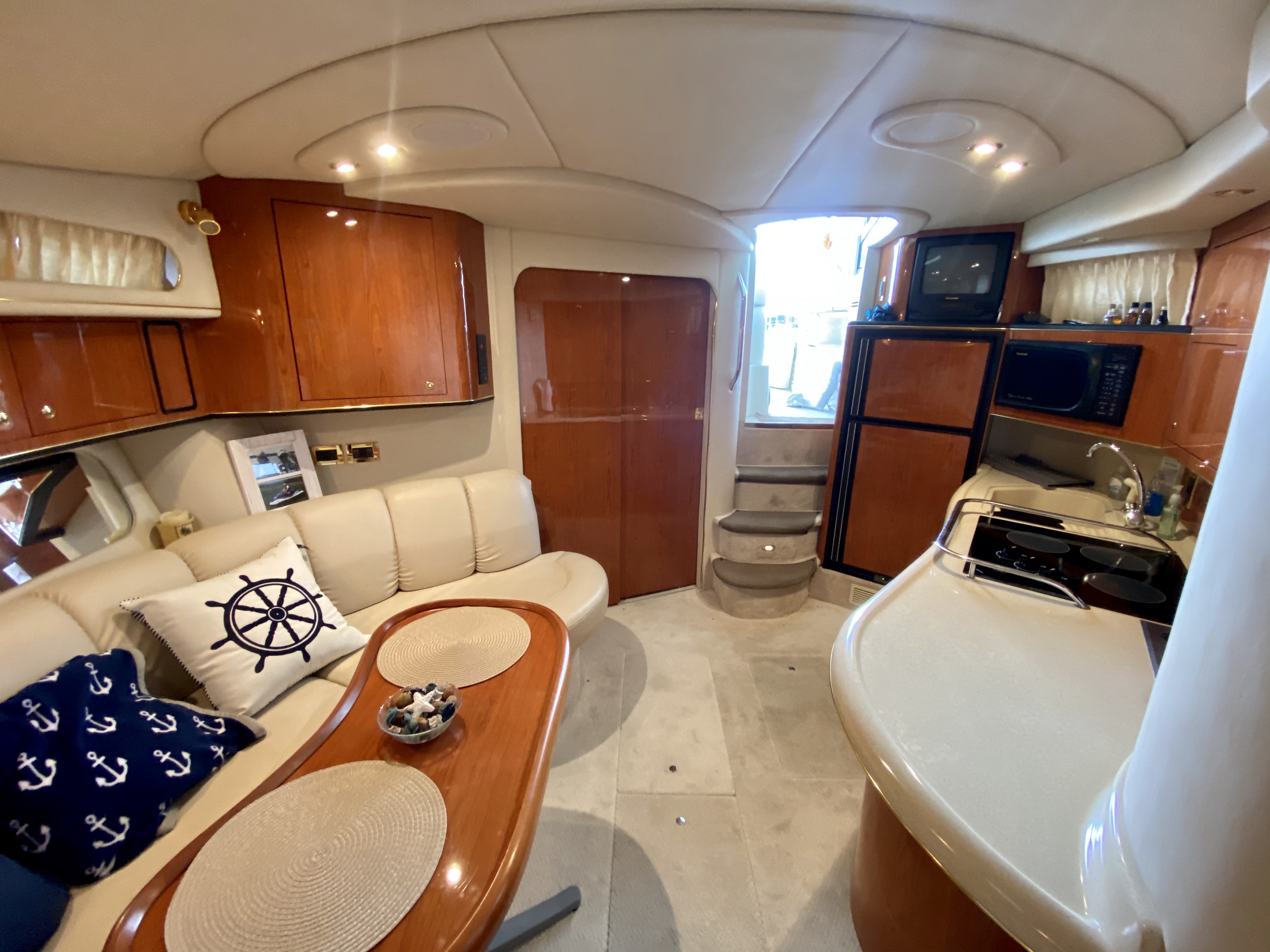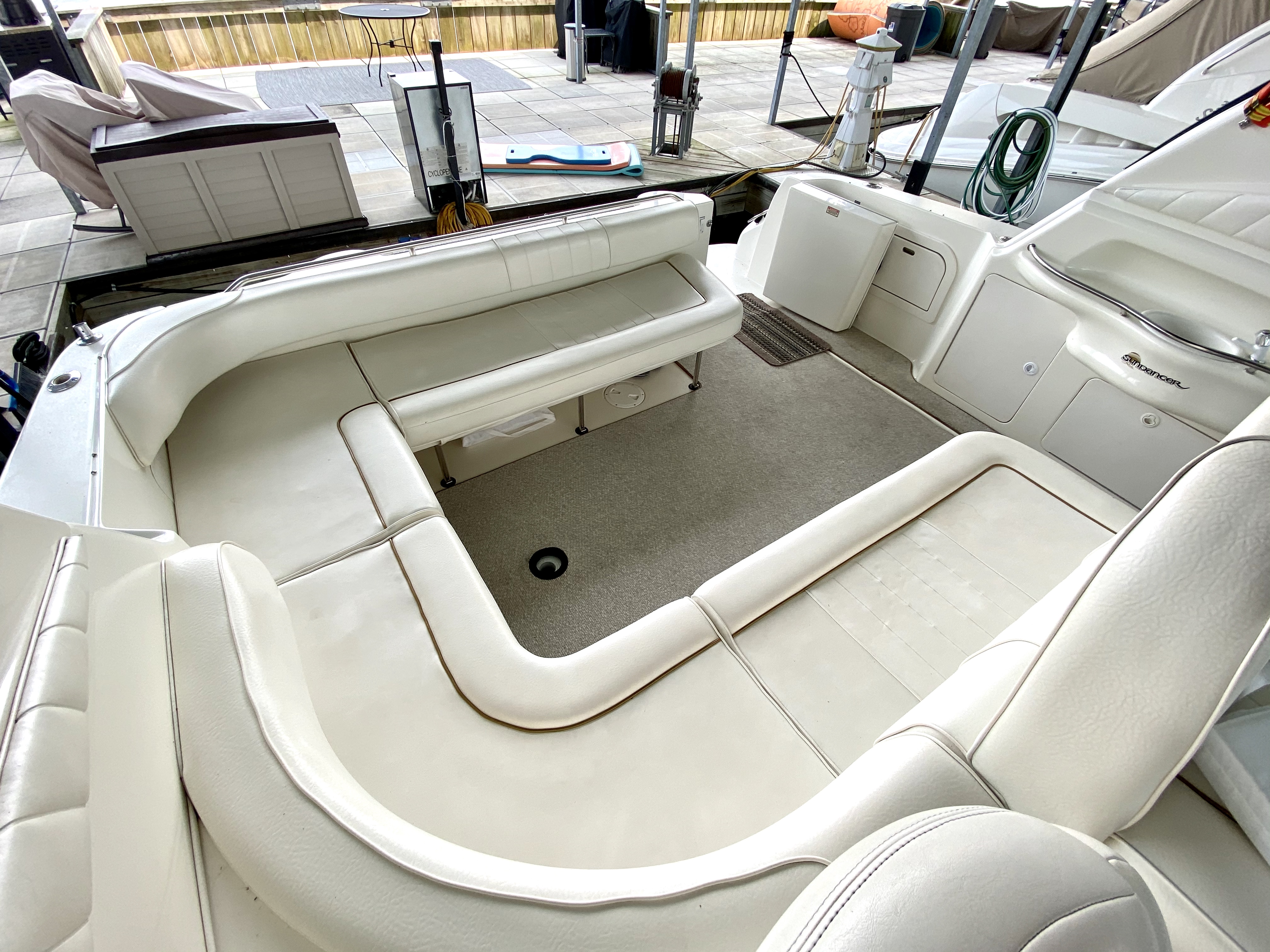 Deck/Hull: Anchor, Shore Power, Compass, Transom Shower with hot and cold water, Transom Storage, Spotlight, Windshield Wipers, Shore Water, Wet Bar w/ Sink, Large Swim Platform, Radar Arch, and Cockpit Carpet.