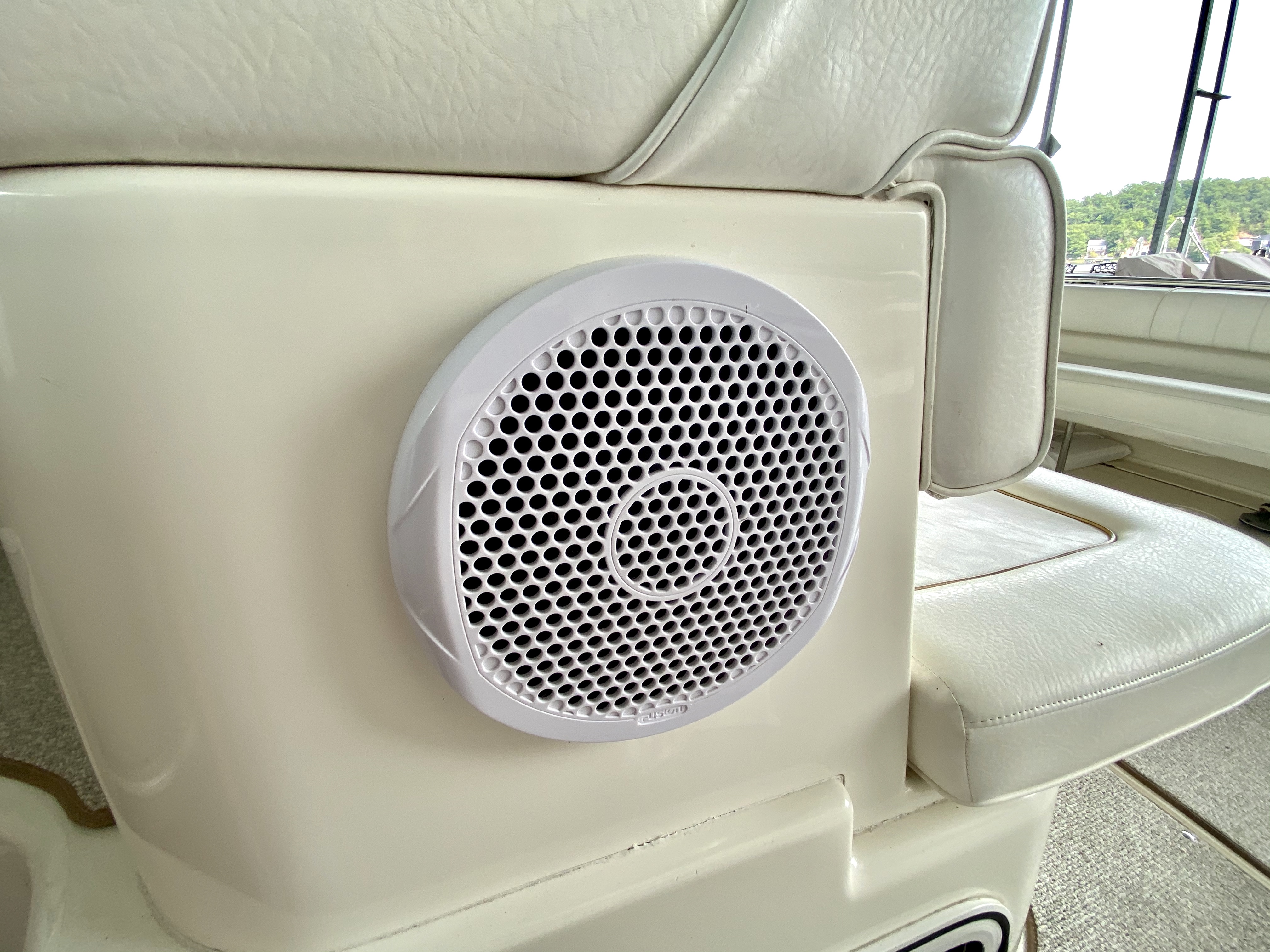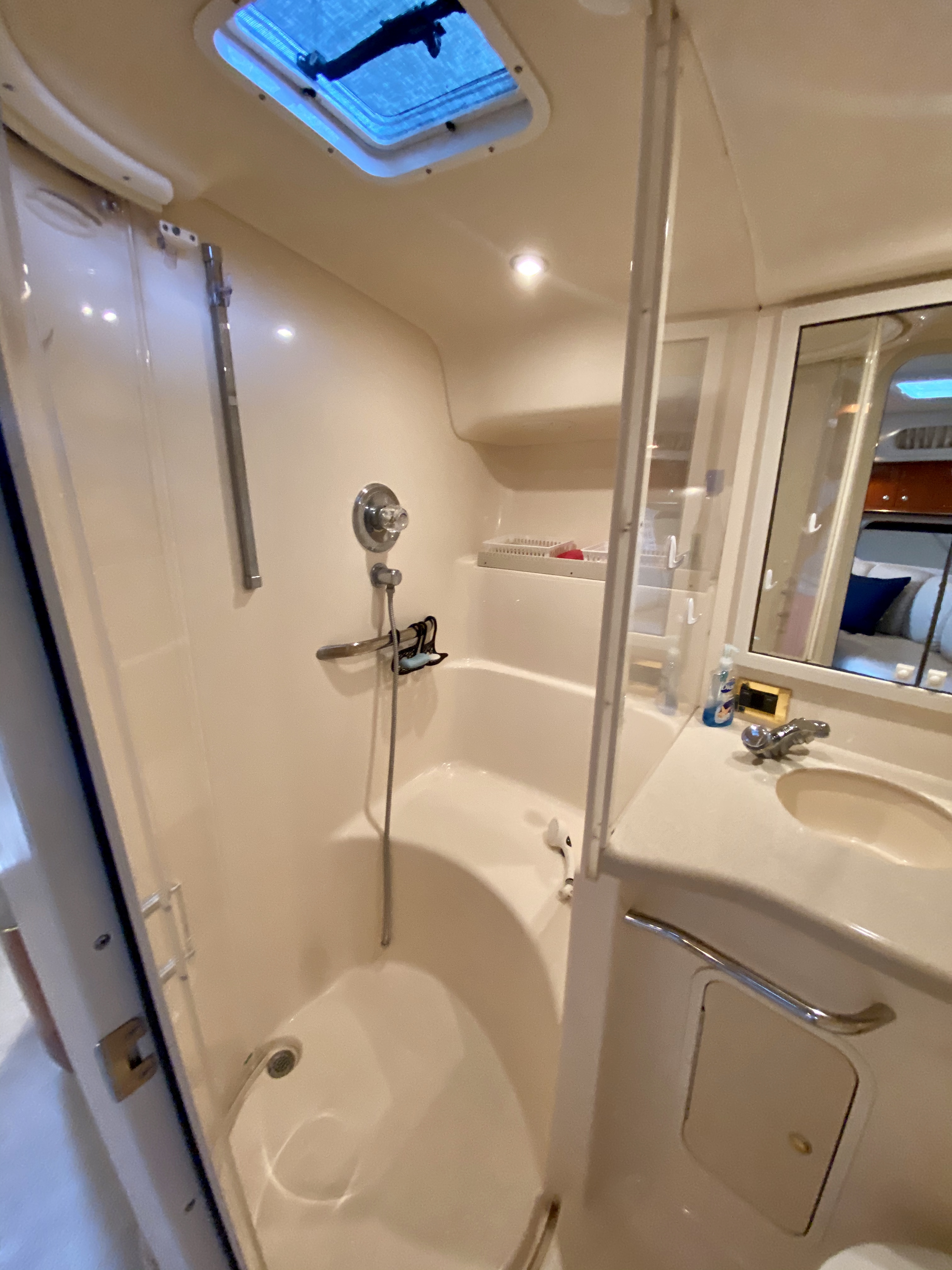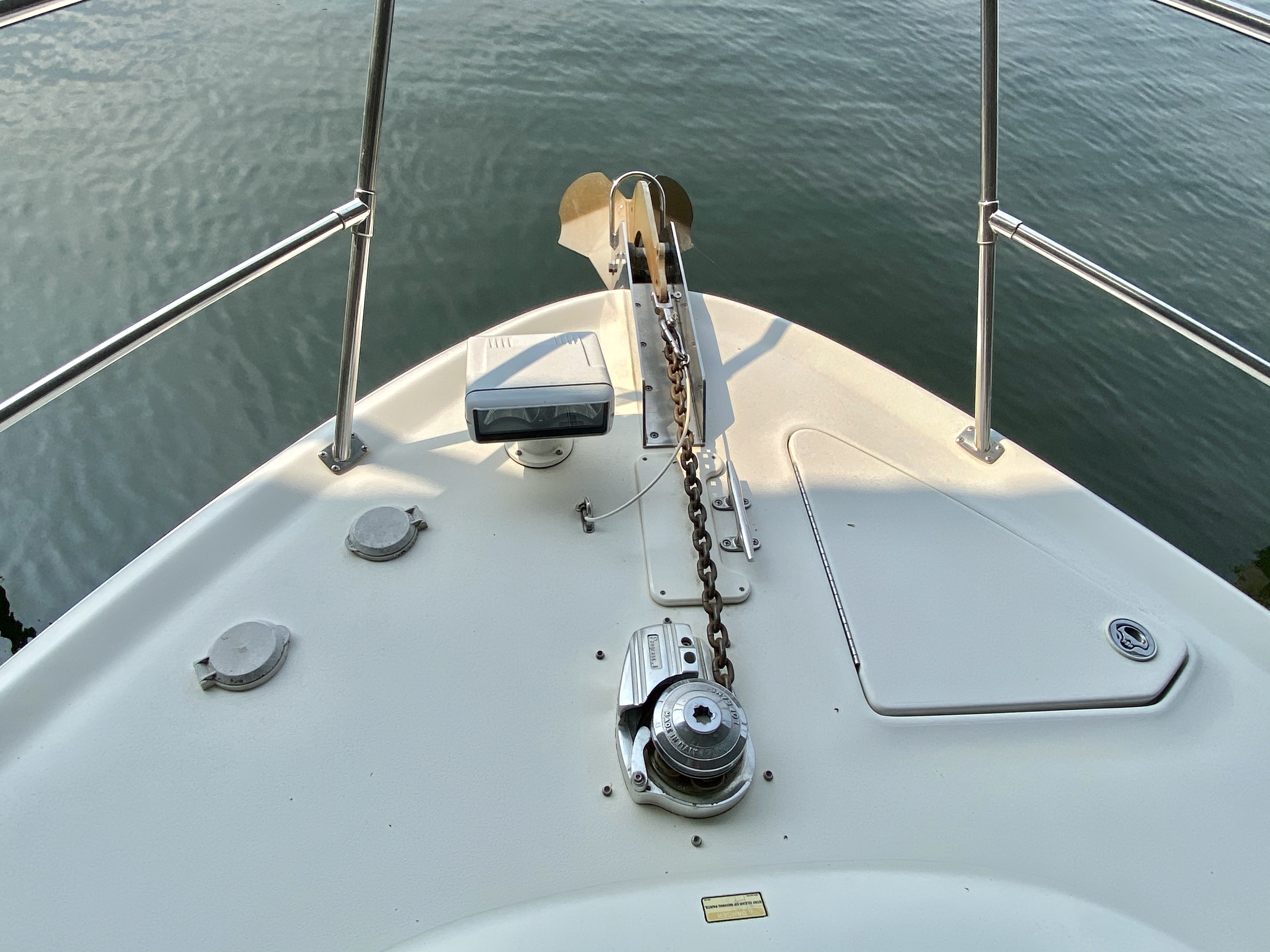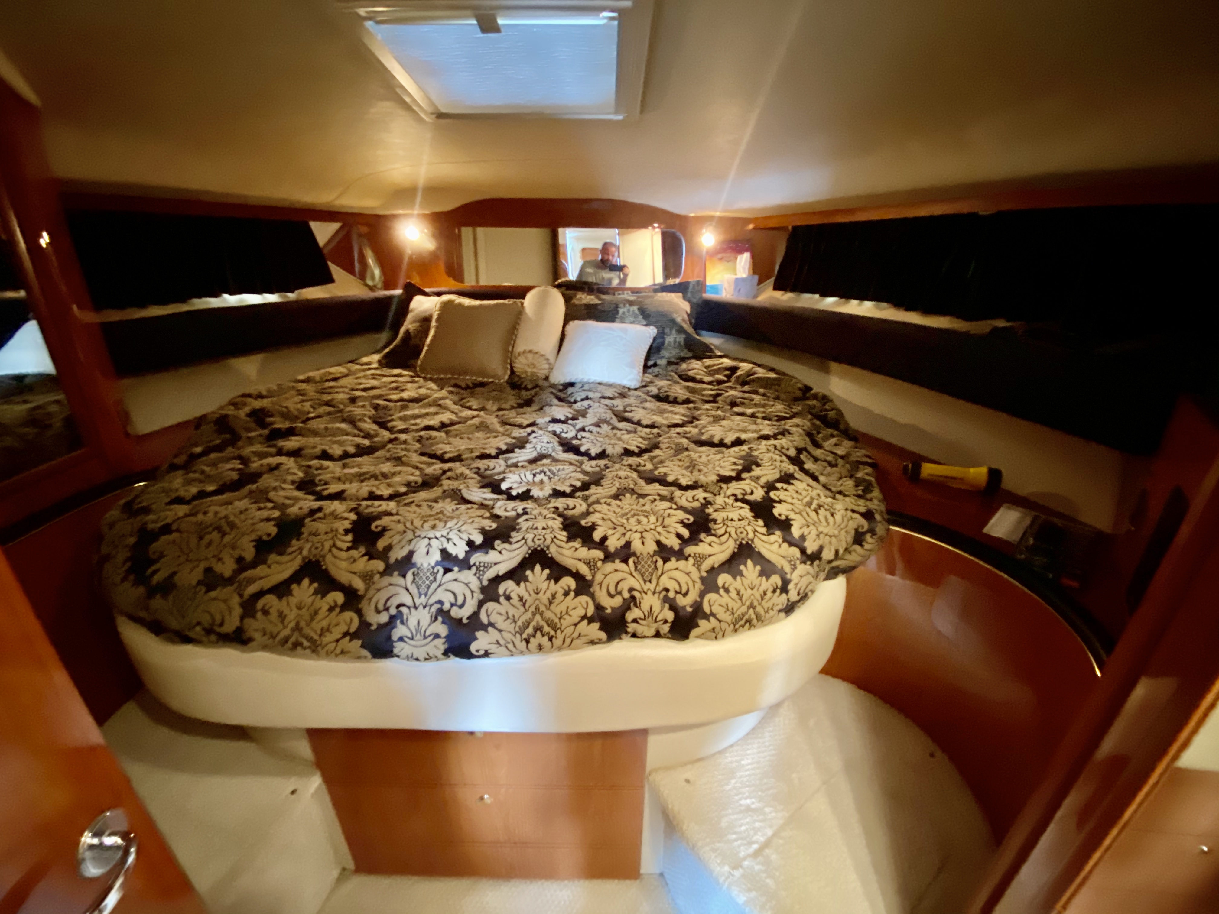 Accommodations: Queen bed in forward stateroom, queen bed in midcabin, vacuflush head and separate shower, 2nd head in midcabin, 2 Panasonic TVs, Upgraded Kenwood CD player with aux hook-up and Fusion speakers in cockpit.