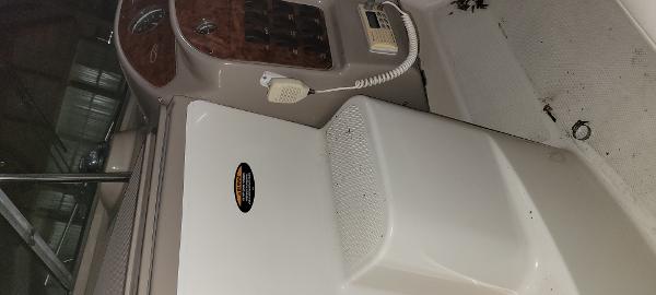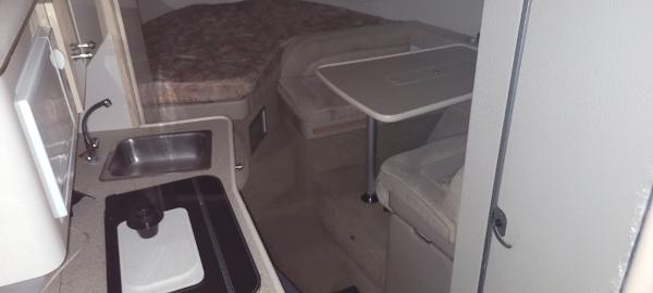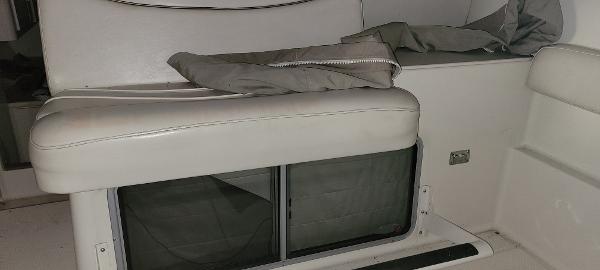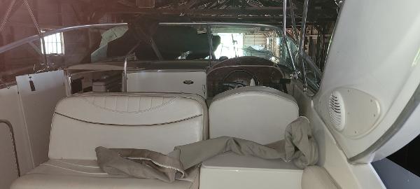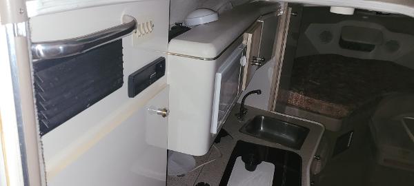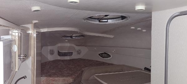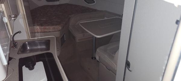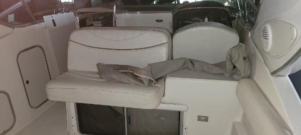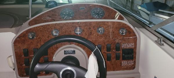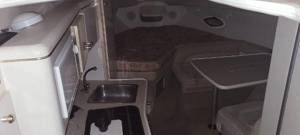 The Maxum 2800 SCR helm includes a burl grain instrument panel, a VHF radio, a depth finder, and a Danforth compass. The cockpit lounge features a cooler and a removable table, while distinctive elliptical portlights invite the sun and breezes into the main cabin. Molded cabin entry with sliding cap provides easy access to the bright and airy cabin. The radar arch adds function to style with lighting and sound system speakers built in. Galley appliances are selected with quality, ease of use, and efficient operation in mind. The galley offers a two-burner stove and a Norcold refrigerator. The head was planned to provide optimum lighting and maximum space. Stereo speakers are placed for ultimate sound quality.