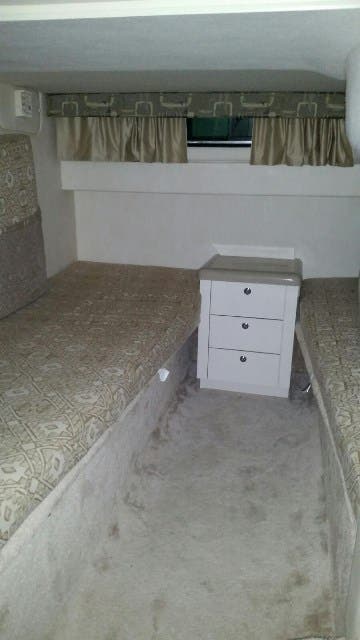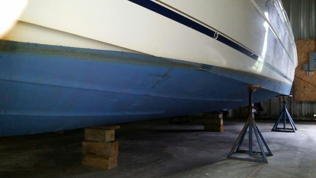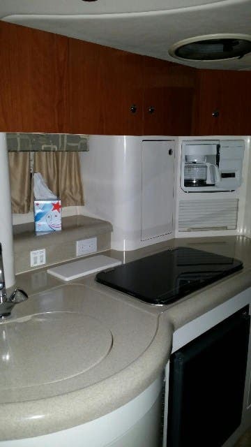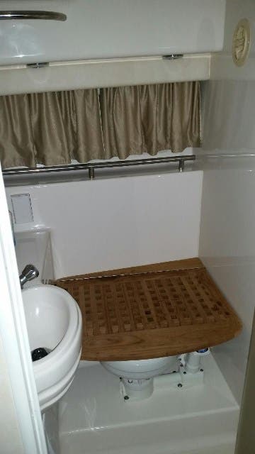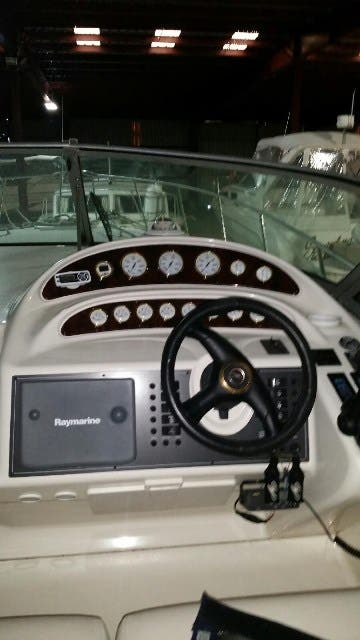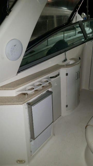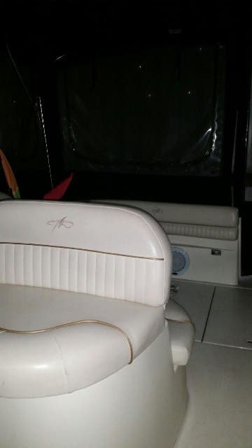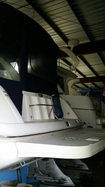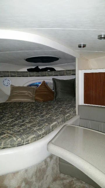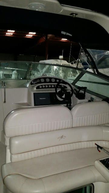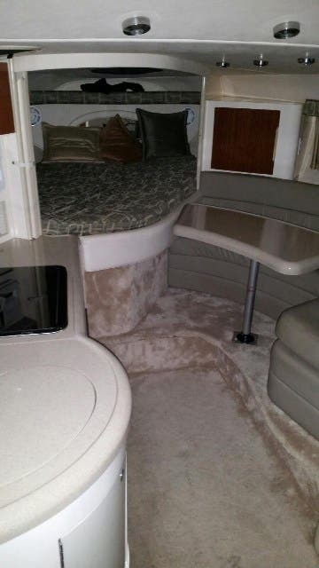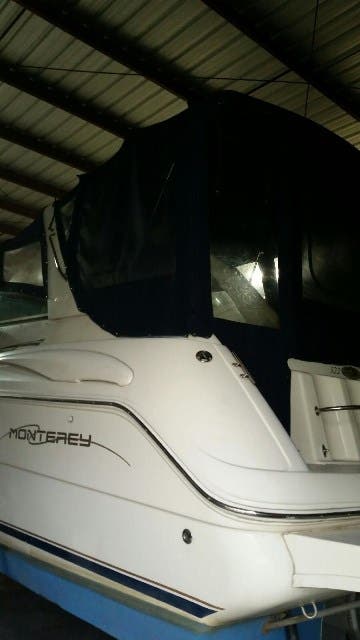 This Montery 322 Cruisers is a well executed blend of crisp styling, solid construction, and good open-water performance. The mid cabin is very roomy. It does have air- heat, plus a walk through windshield.