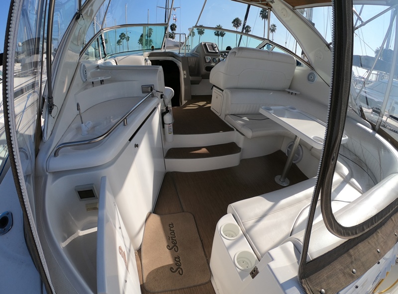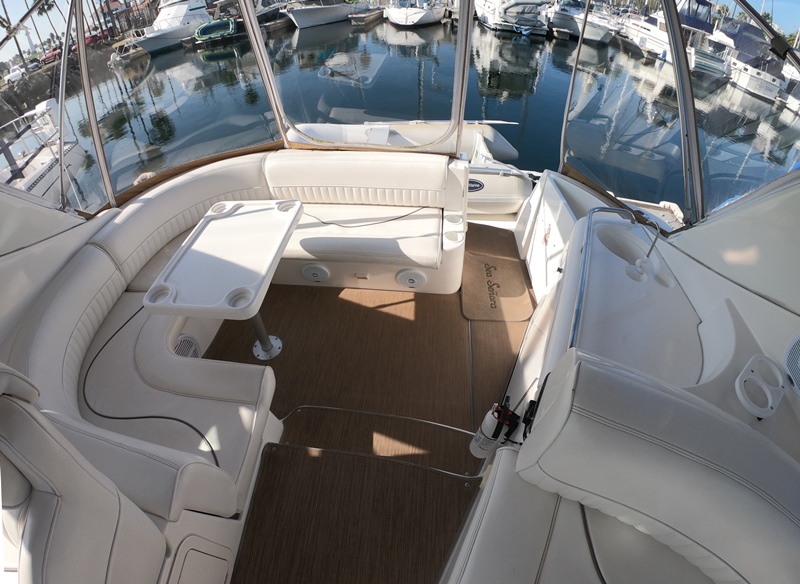 Bruce style anchor & 5/16"chain; Remote Spotlight; Full Camper Back Enclosure; Forward Screen Window Covering; Tundra Fridge/freezer in cockpit Wet Bar; 110 V Outlets, Sea Rail; Cockpit Table, Converts to Sun-pad; U shaped Lounger w Storage Underneath; Cockpit Carpeting; Like New Upholstery;