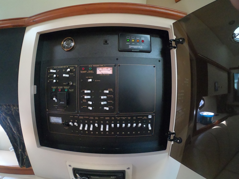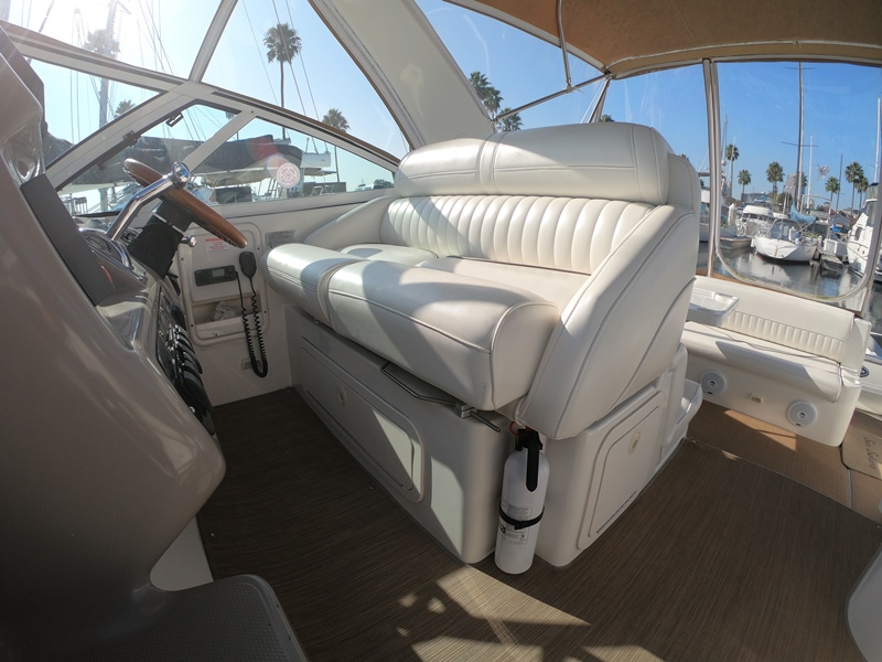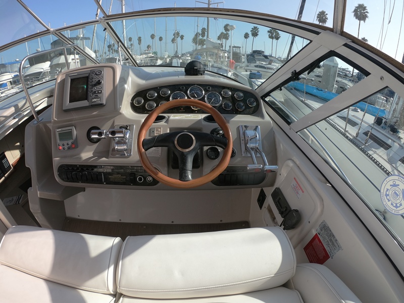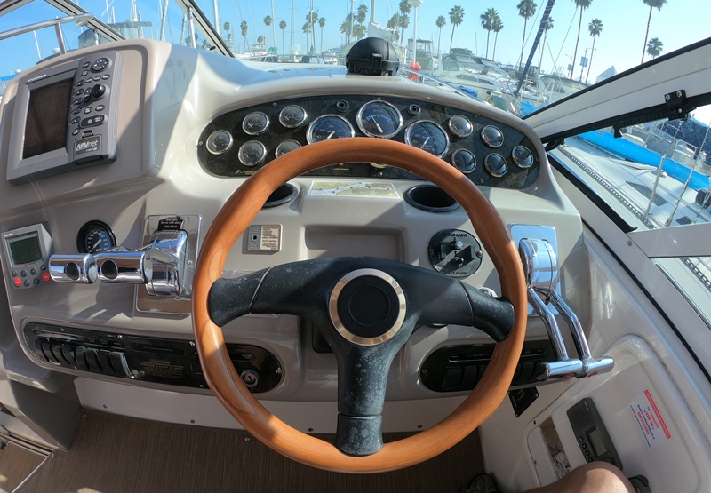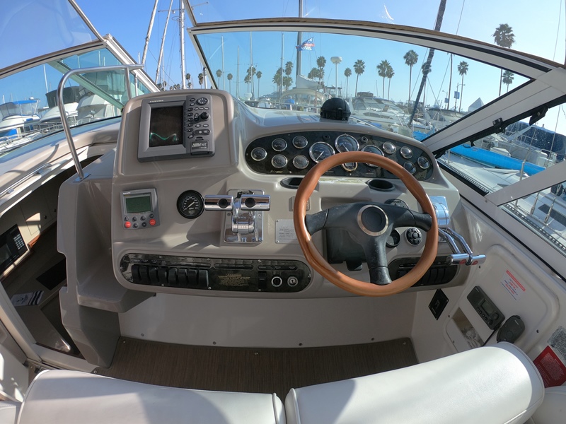 HELM & ELECTRONICS: Raised Helm w Companion Seat, Storage Underneath; Tan Dash Gel Coat to Reduce Glare; Separate Shift & Throttles; Tilt Power Steering; Classic Wooden Steering Wheel; Opening Wing Windows; Full Dual Engine Gauge Package; Engine Sync; Lowrance depth sounder; Flo scan fuel meter to Monitor Fuel; Cup Holders; Compass; Furuno GPS/ Chart-plotter/Radar; Raymarine 5000 autopilot; Raytheon Ray53 DSC VHF Radio w Antenna; Clarion AM/FM/CD; Blu-tooth AM/FM/CD/MP 3 w/cockpit control.