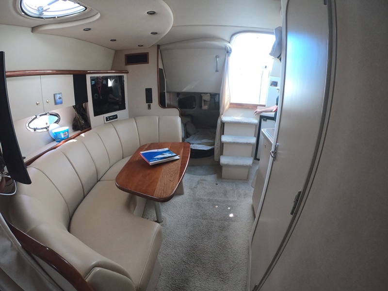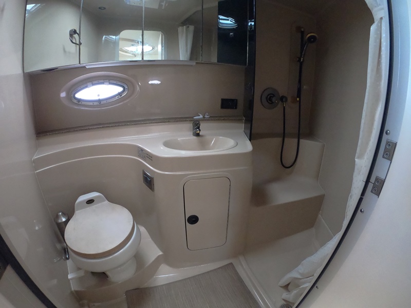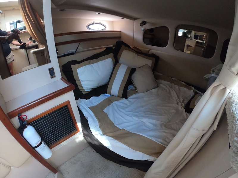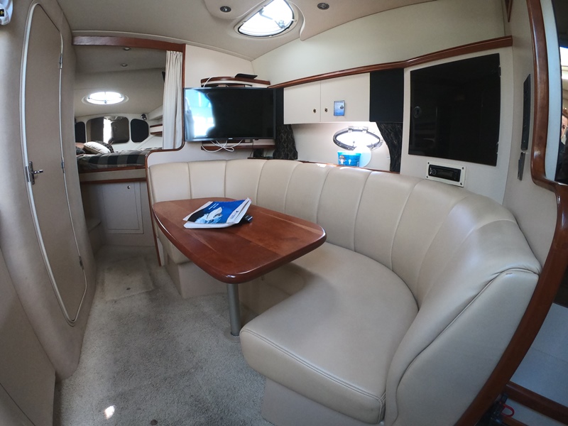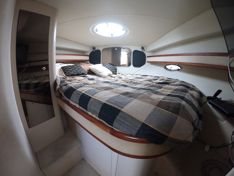 ACCOMMODATIONS: Fully Air Conditioned Cabin; Reverse cycle A/C and heat; Forward Full Sized Bed w Step Up; Hanging Locker; Over Head Hatch & Port Lights; Under Bed Storage & Gunwale Storage; Privacy Curtain & Personal TV; Mid Cabin Sleeper w Privacy Curtain & Storage; Wood Dinette Table, Converts to Sleeper w Storage Underneath; Gunwale Cabinets; TV; Fully Lined Fiberglass Facility; Mirrored Medicine Cabinet; Vanity Storage Underneath; Separate Full Size Shower Stall w Seating; Vac u-flush Head w Tank Monitor; Mascerator.