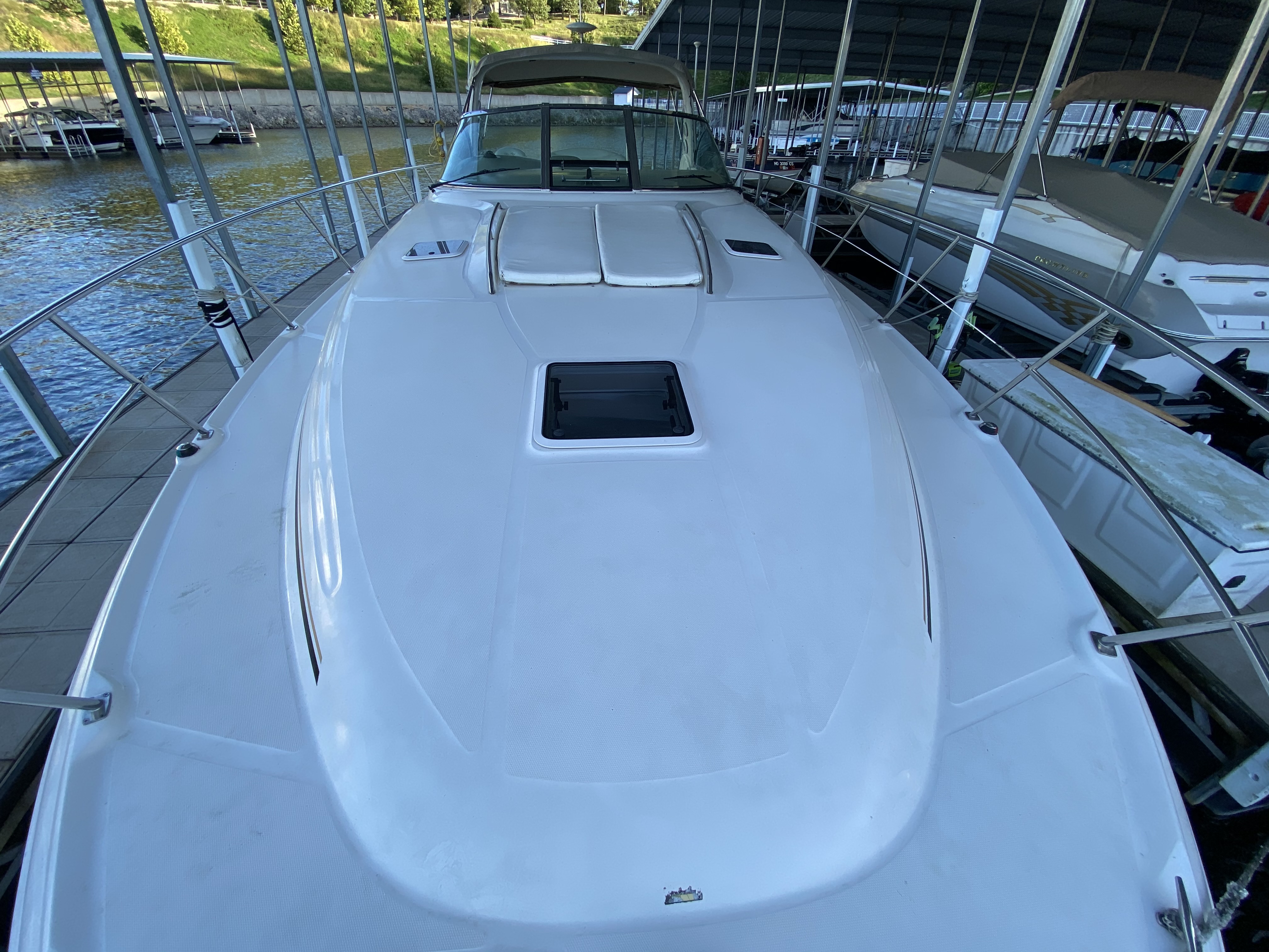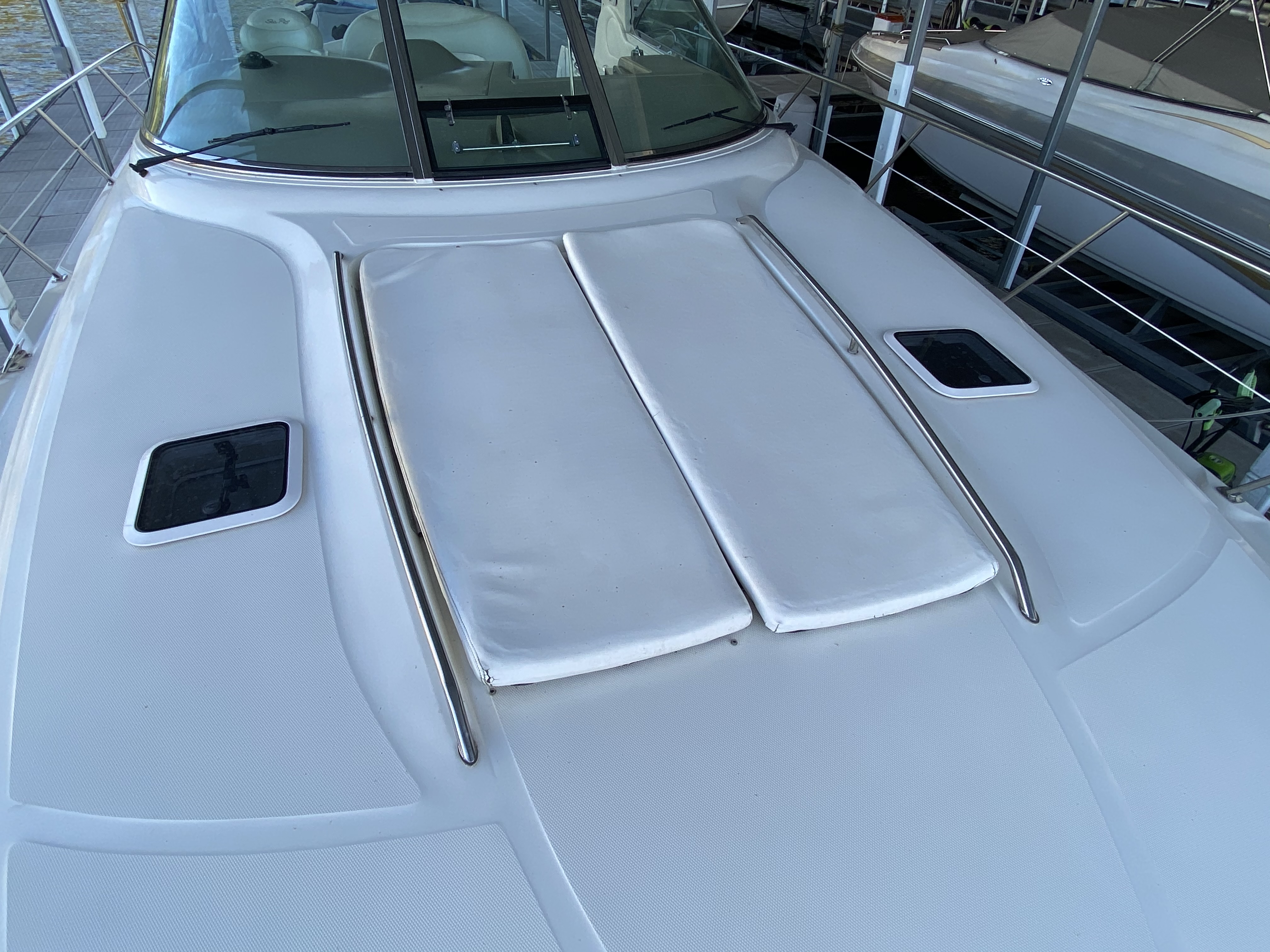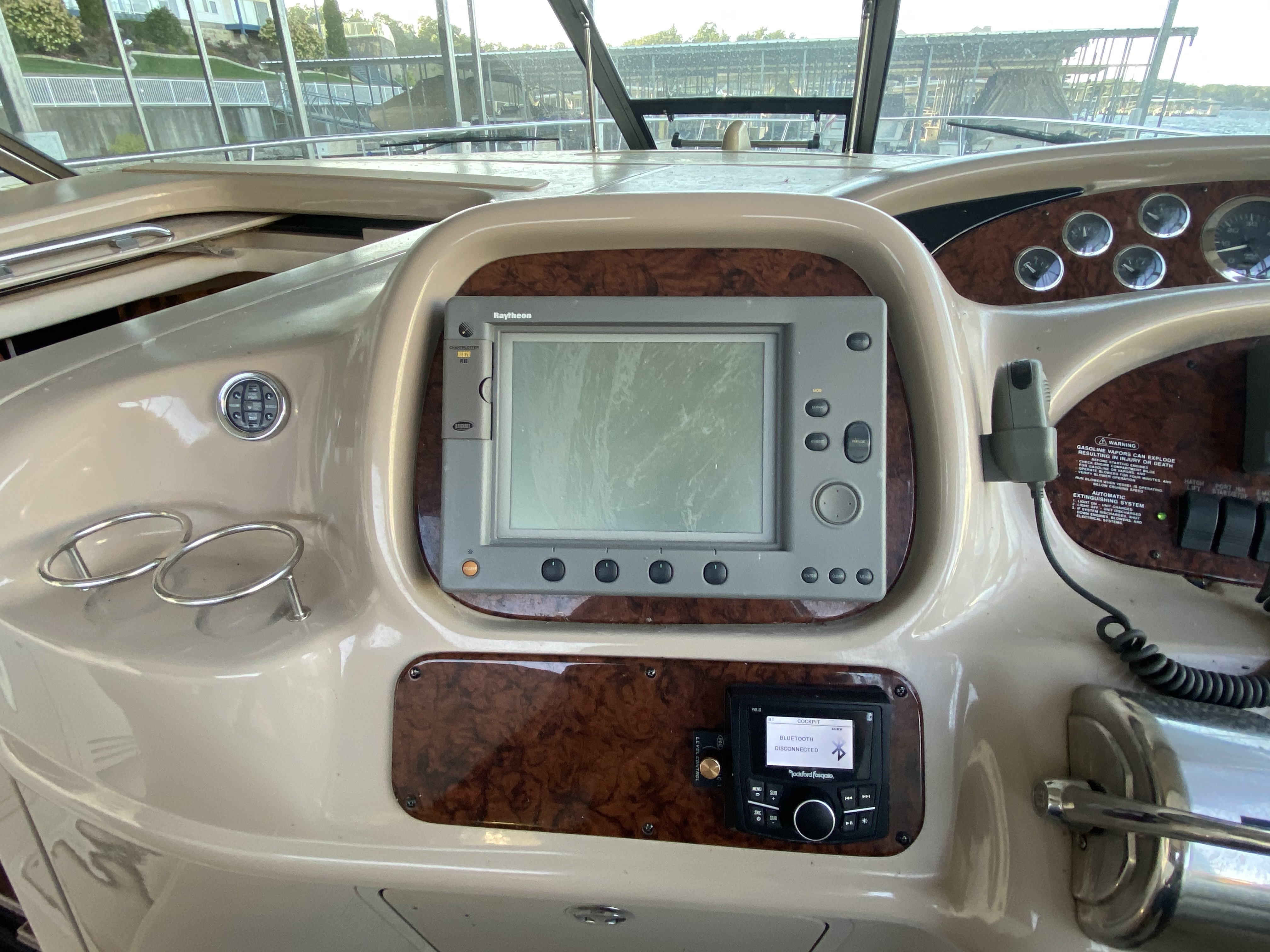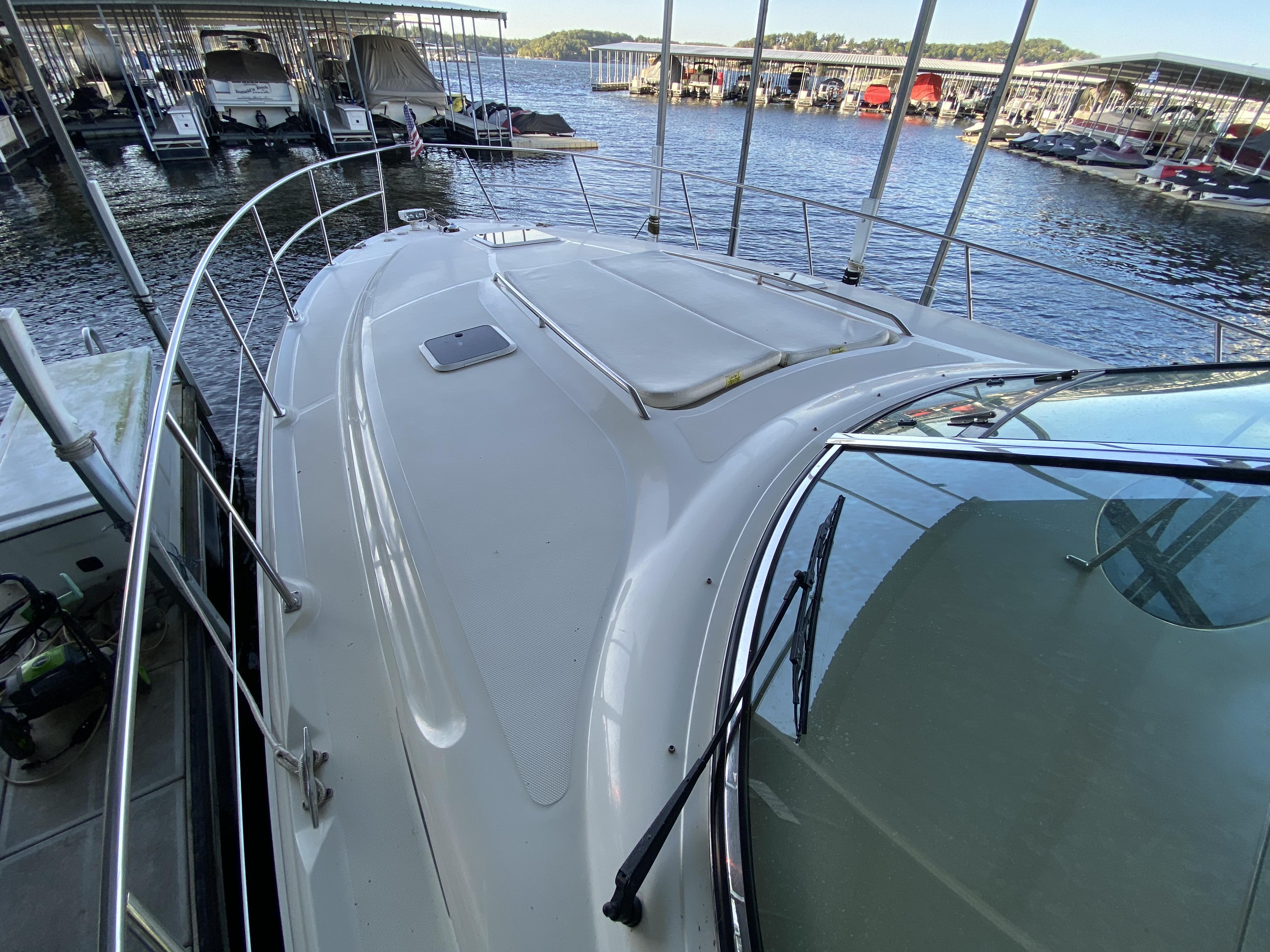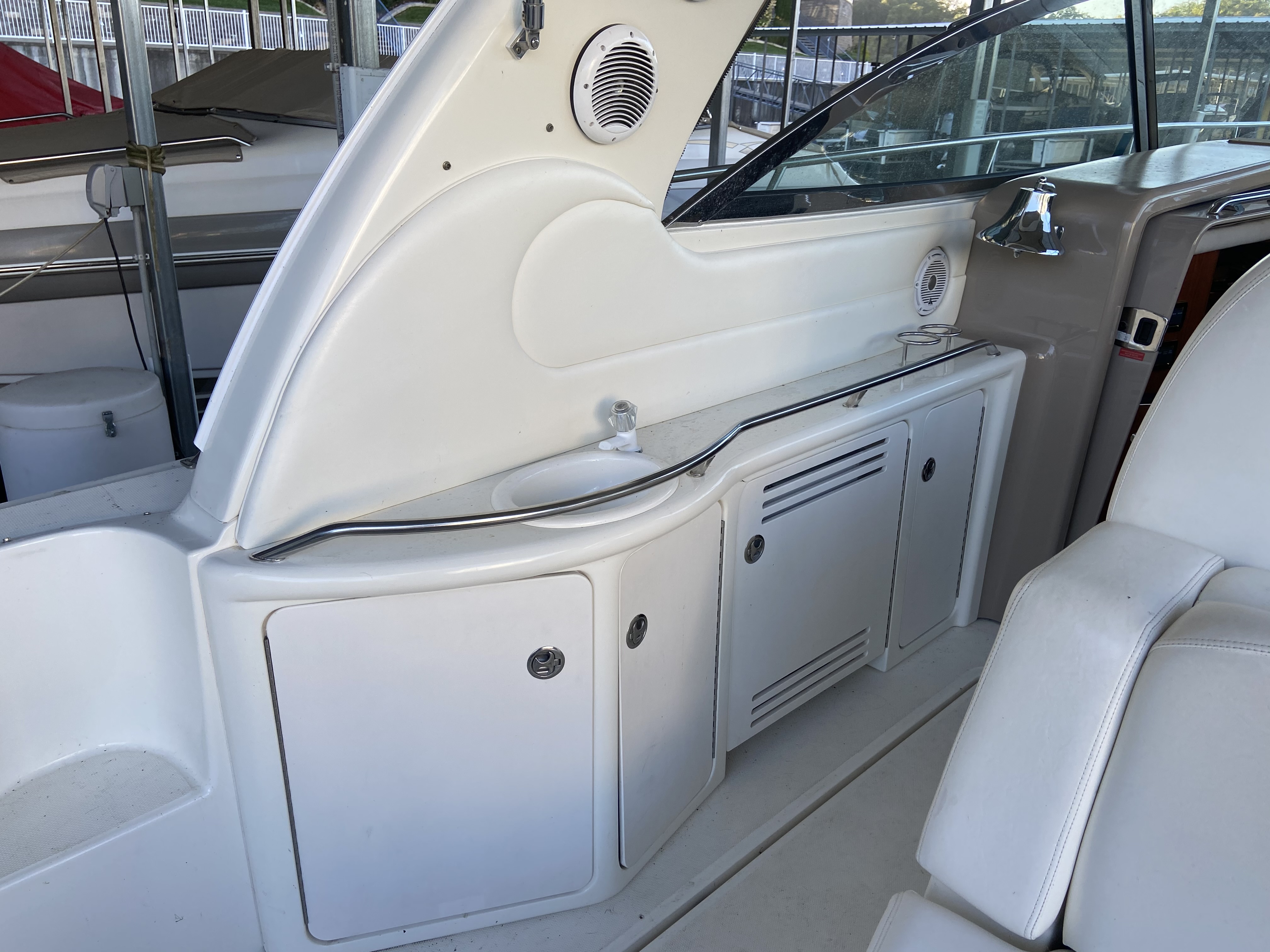 Deck/Hull: Anchor, pulpit, dock power, compass, fenders, spotlight, windshield wipers, shore water, wet bar with sink & ice maker, sunpad, swim platform, transom shower, arch, bimini top, and full cover.