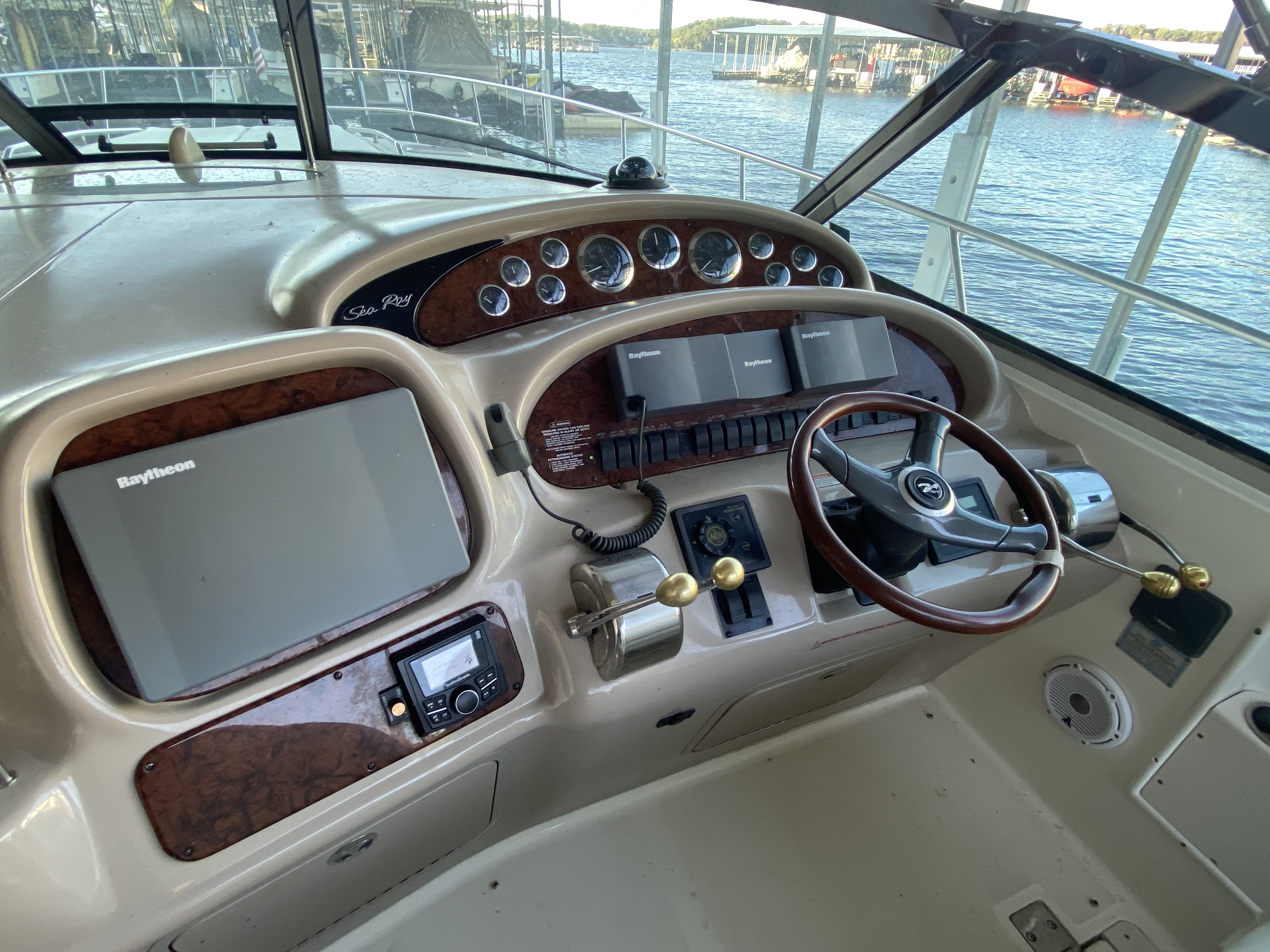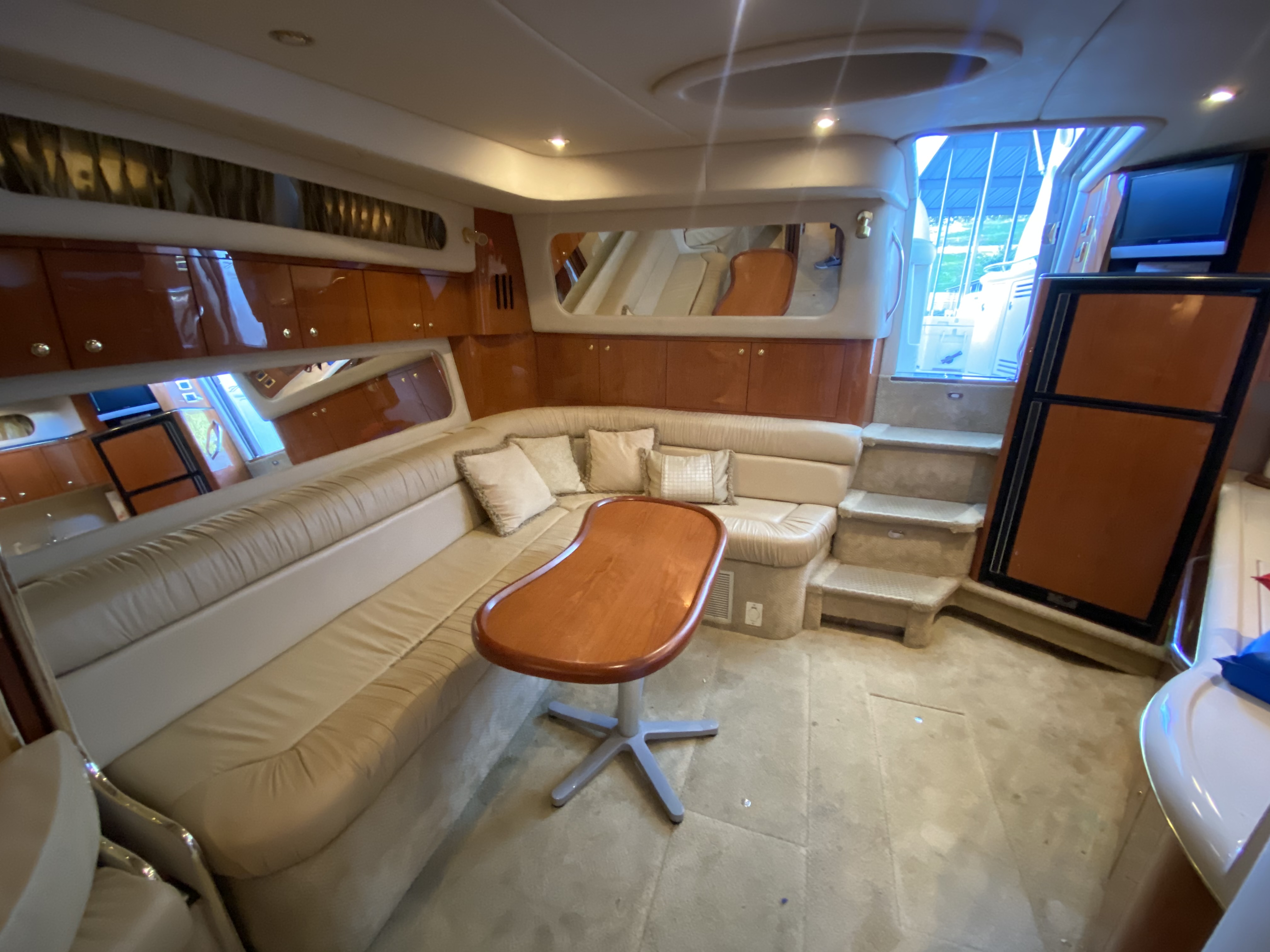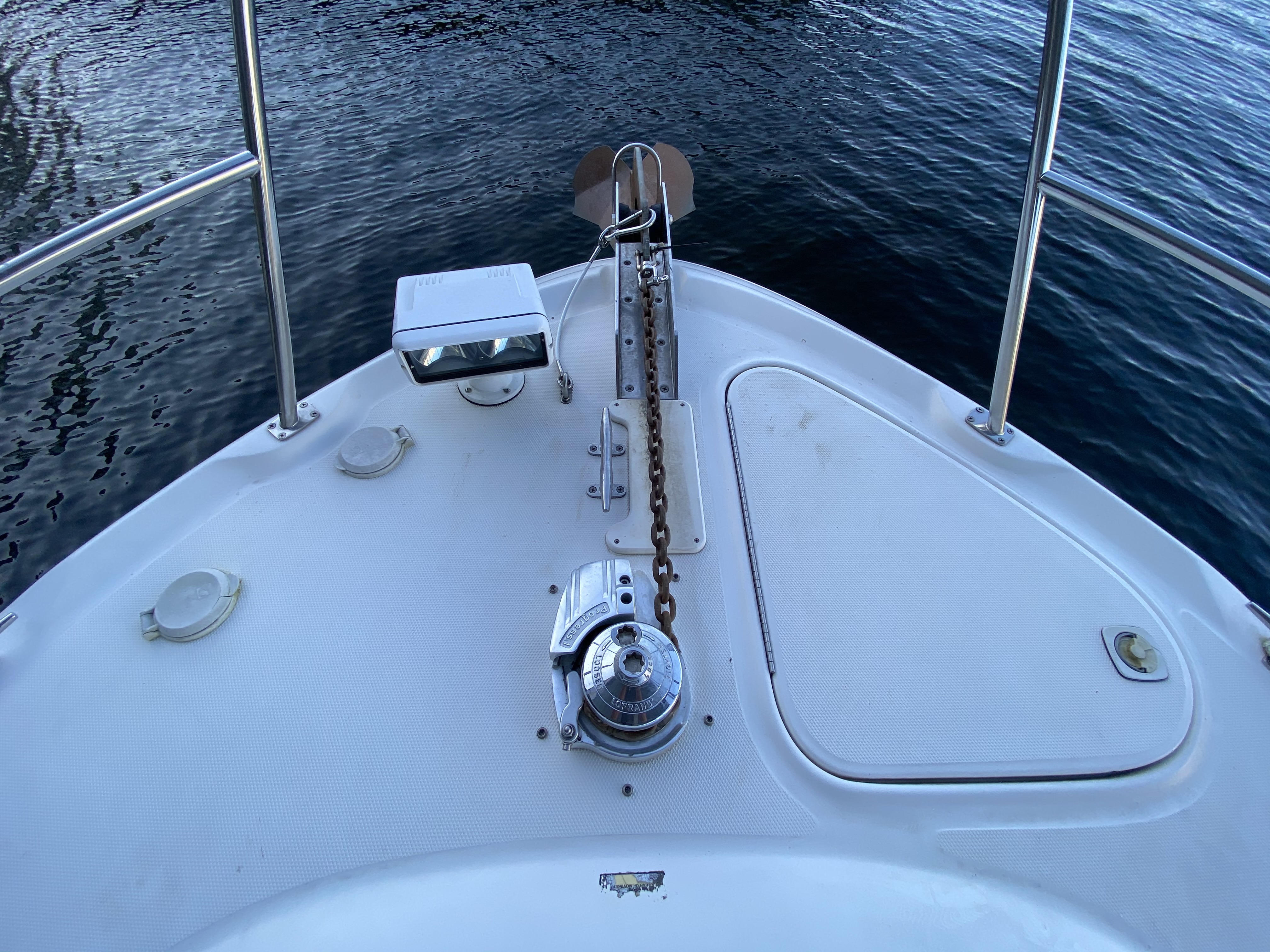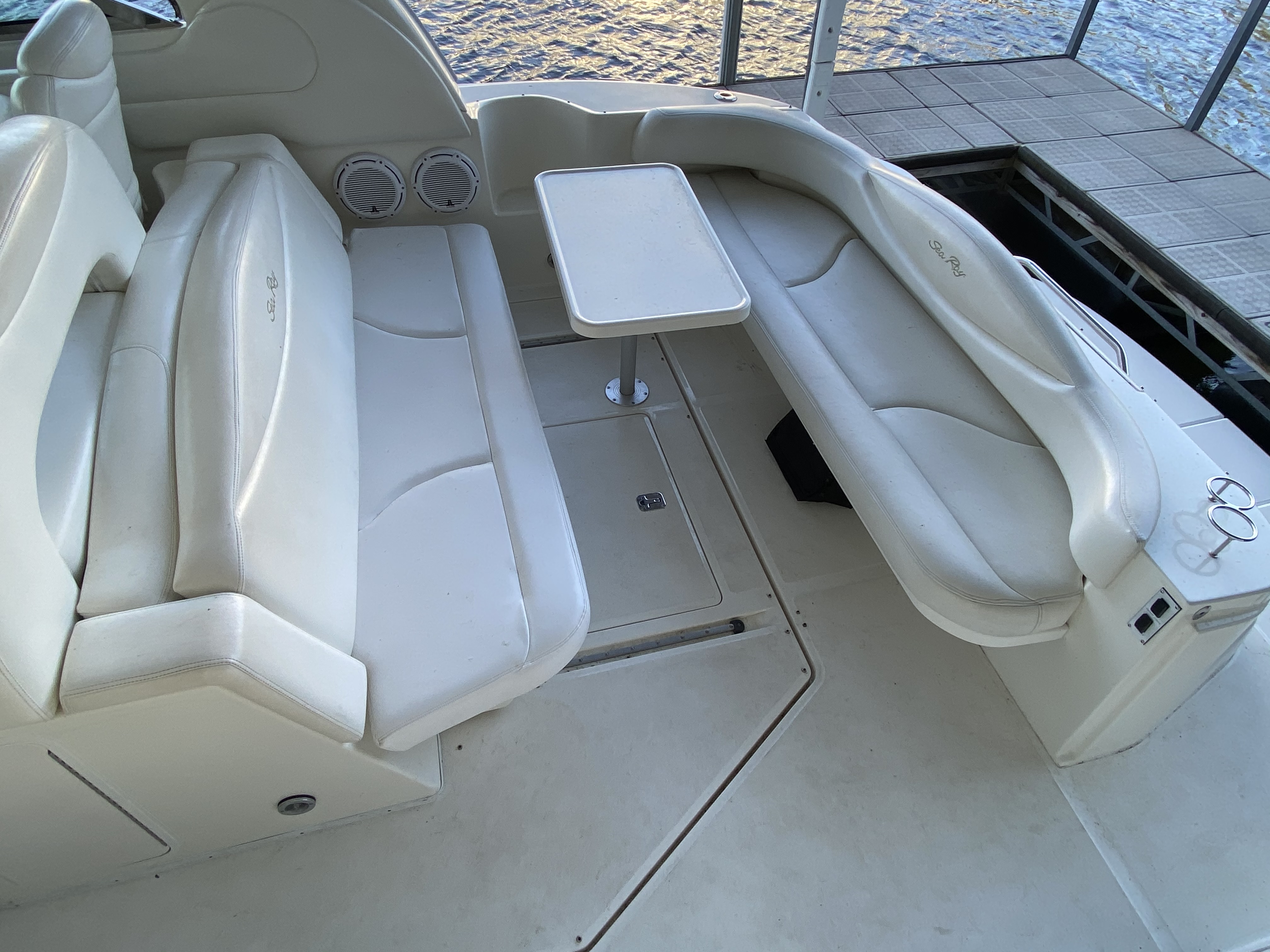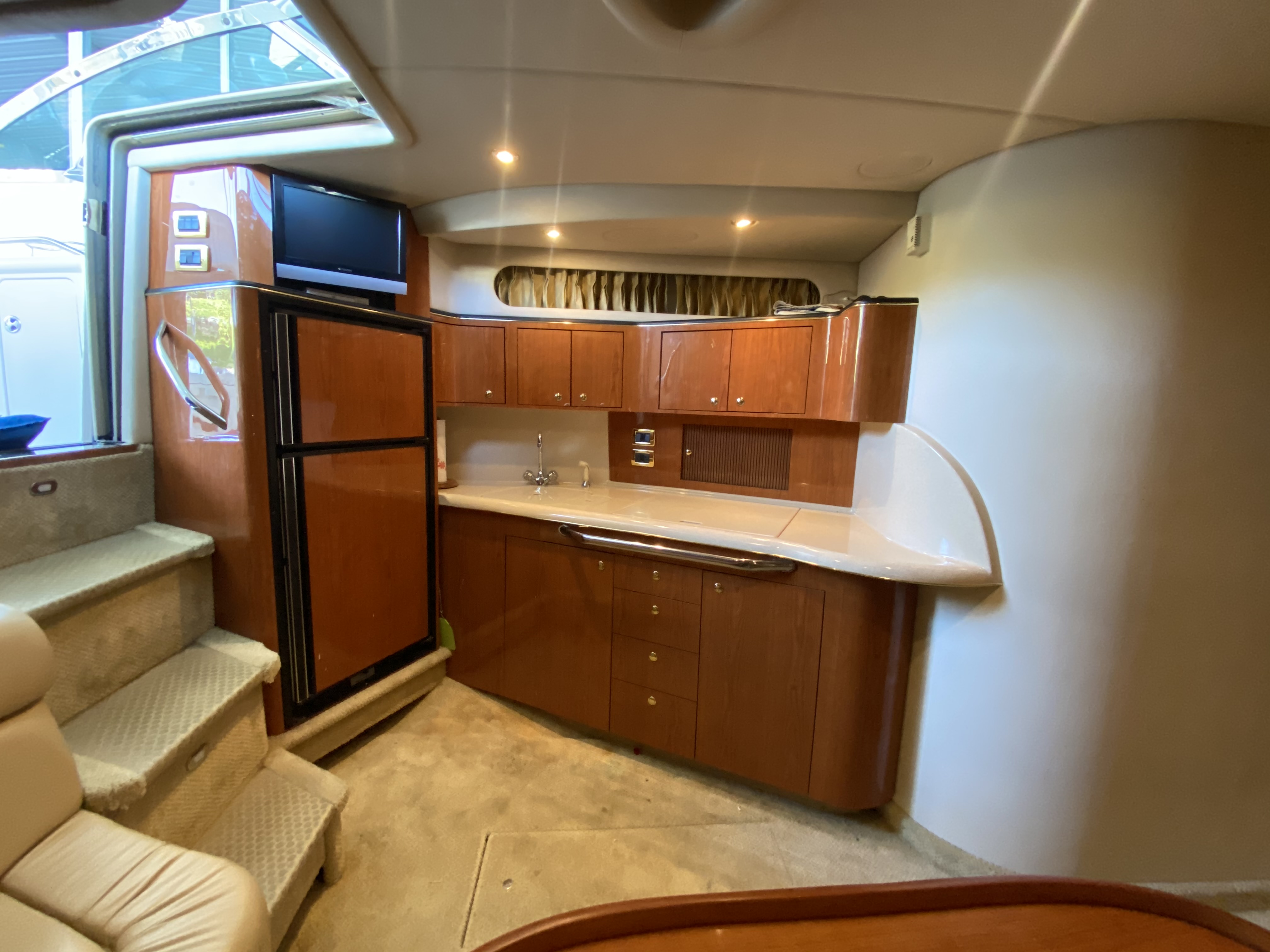 Deck/Hull: Anchor, pulpit, dock power, compass, fenders, spotlight, windshield wipers, shore water, wet bar with sink & ice maker, sunpad, swim platform, transom shower, arch, bimini top, and full cover.