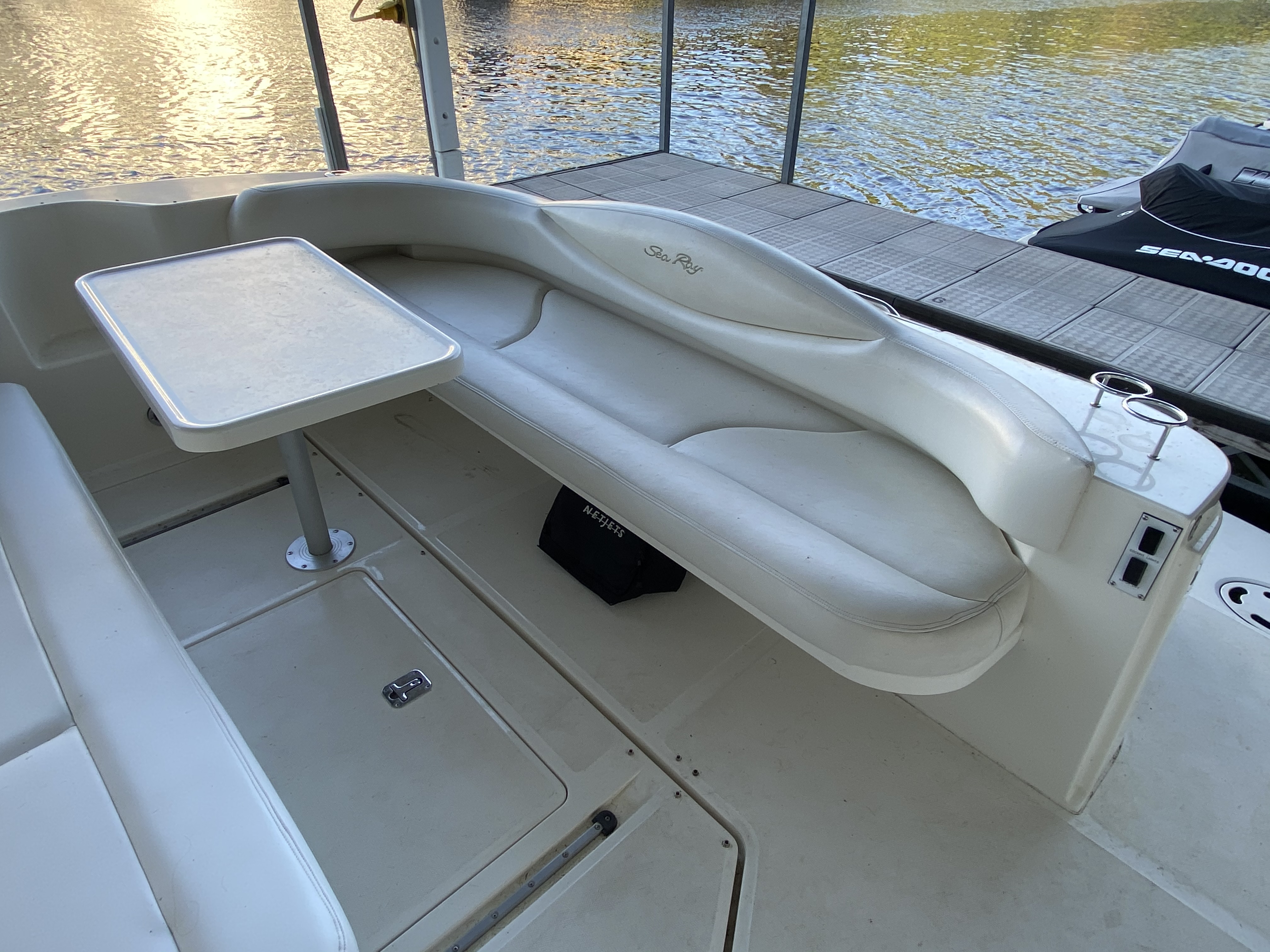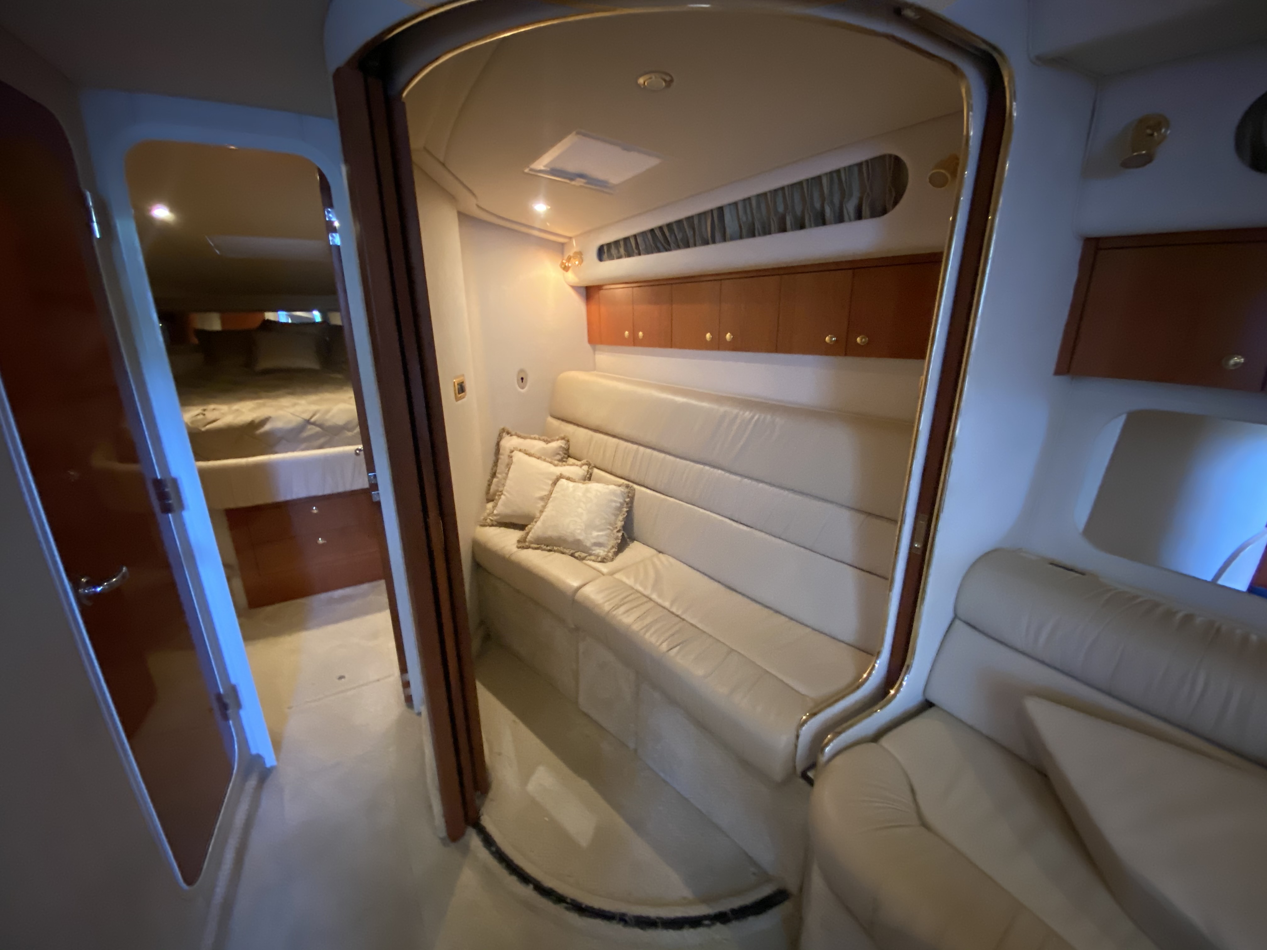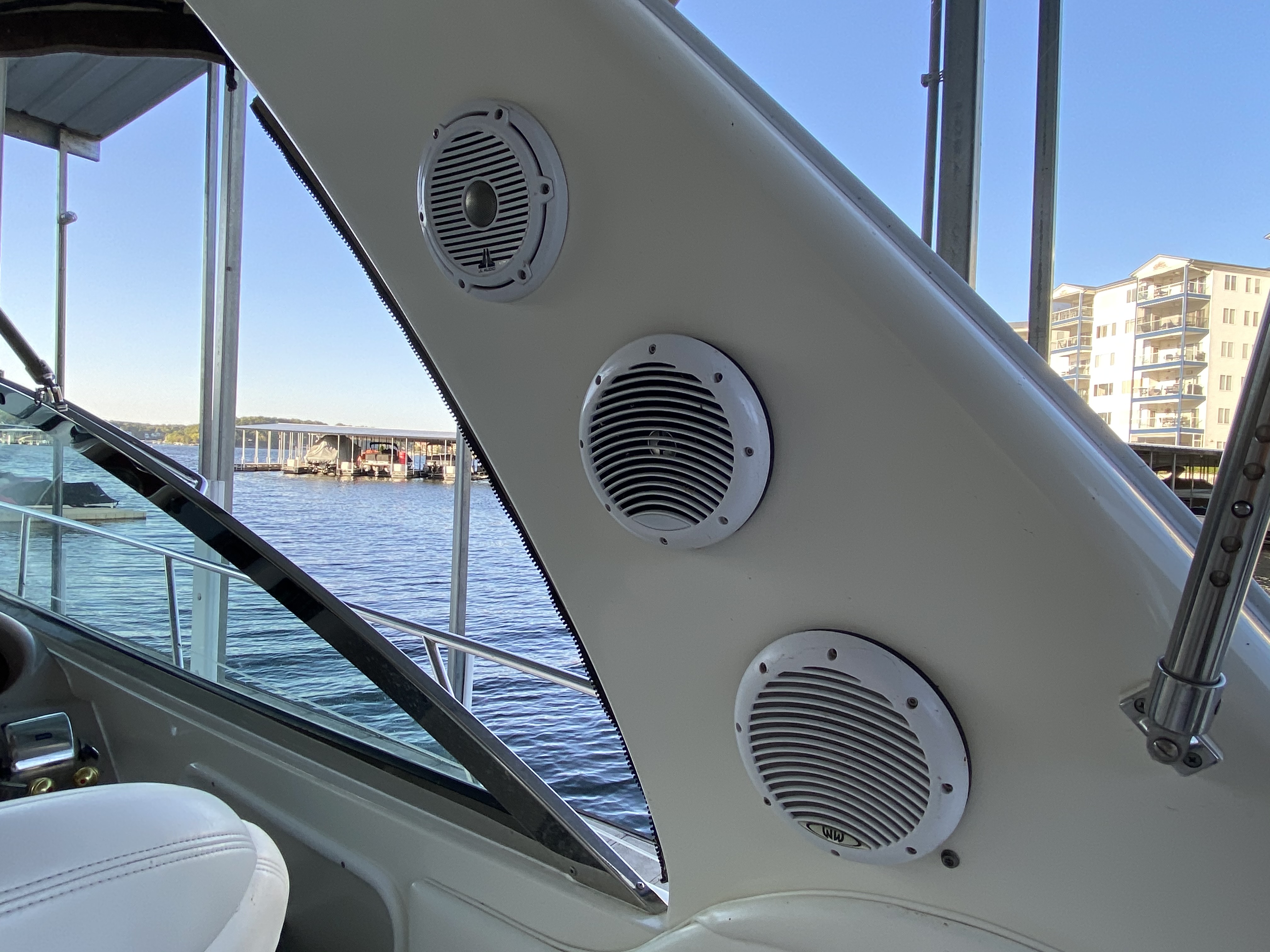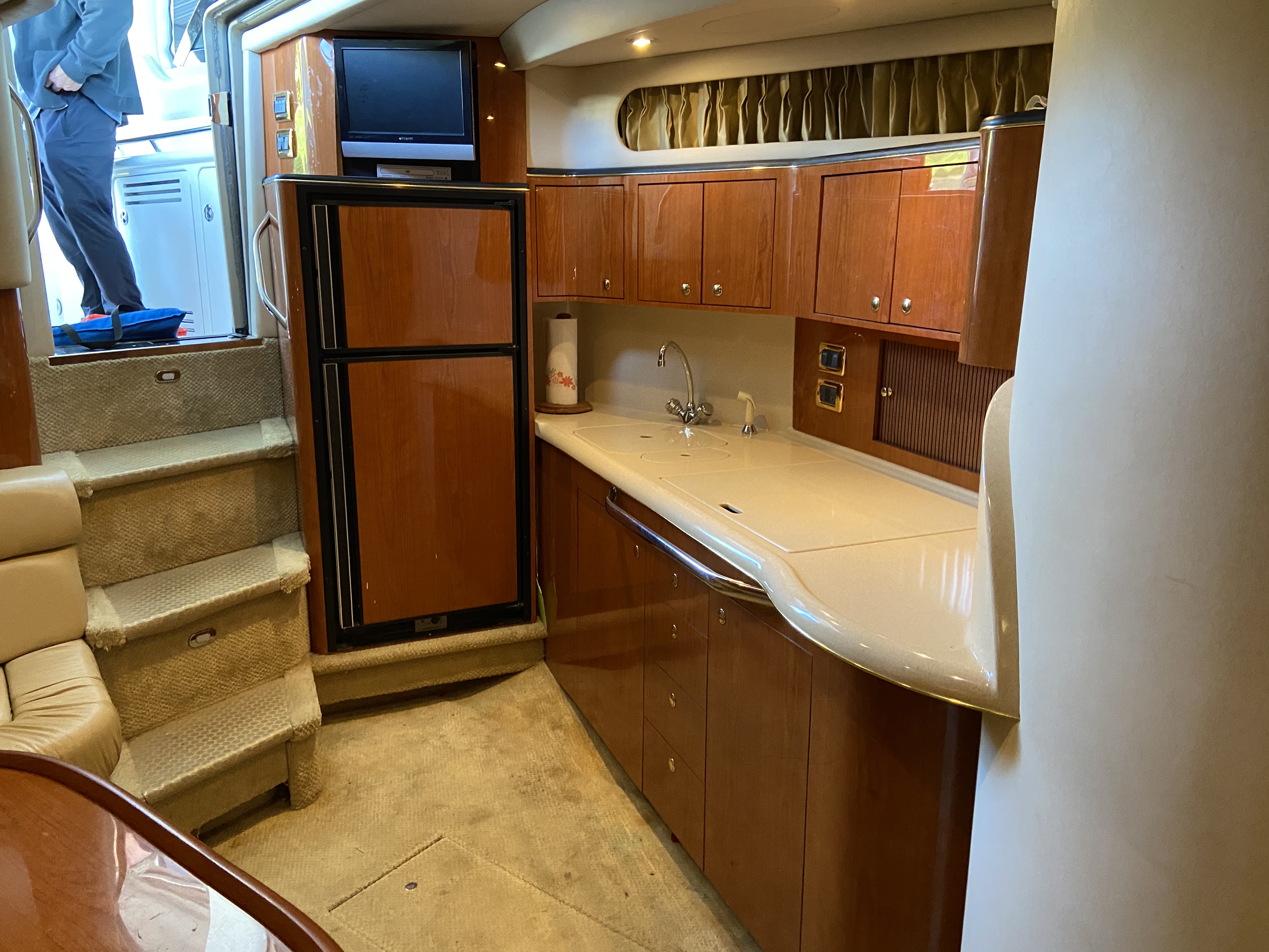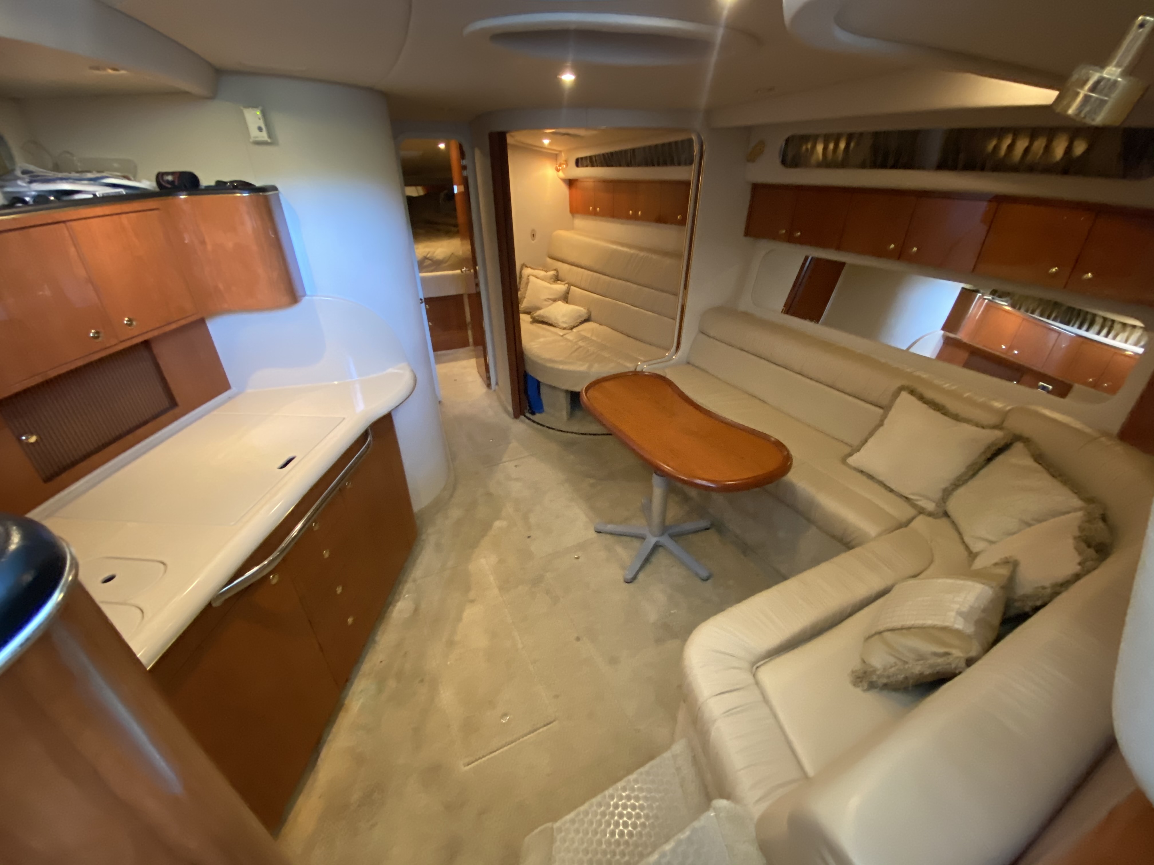Deck/Hull: Anchor, pulpit, dock power, compass, fenders, spotlight, windshield wipers, shore water, wet bar with sink & ice maker, sunpad, swim platform, transom shower, arch, bimini top, and full cover.