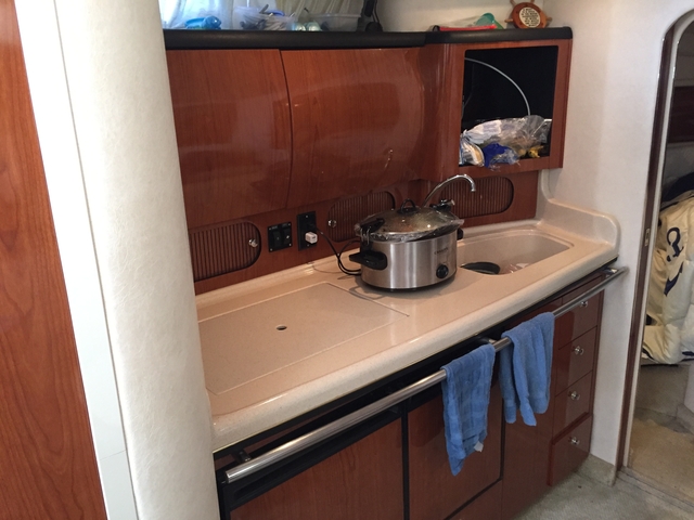Helm Refrigerator, Separate Galley Freezer, Refrigerator, Stove, and Microwave.