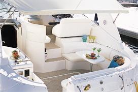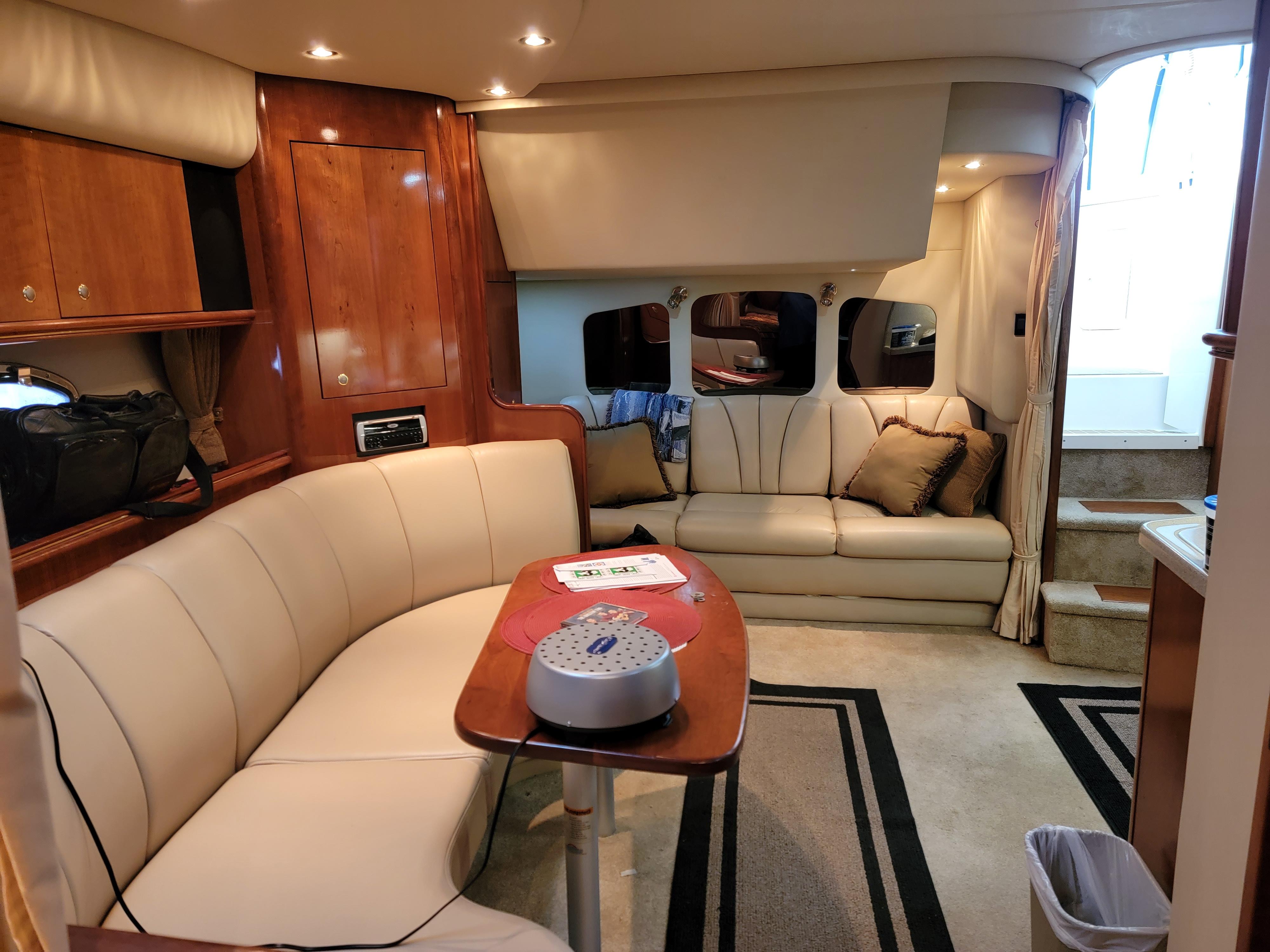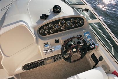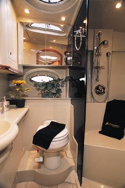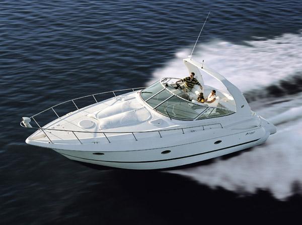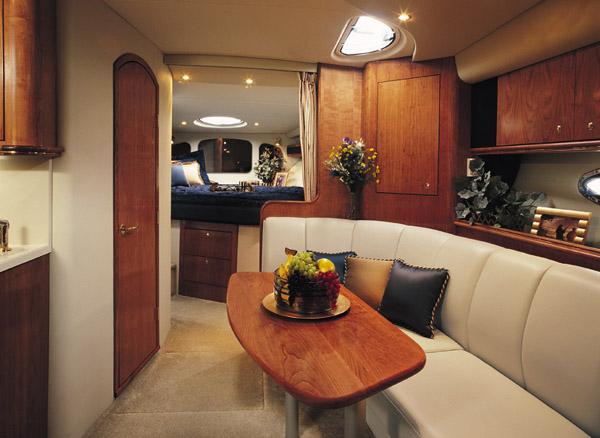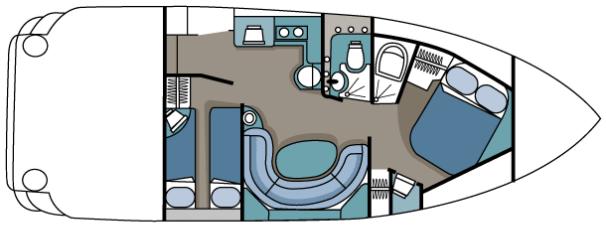 The Cruisers 370 Express features a sleek express exterior with plenty of cockpit space and a well-thought-out layout, effectively combining abovedeck comfort with a sweet, performance-driven profile. Most importantly, owners can select from two interior layouts. With the single stateroom layout, the 370 achieves a wide-open feel. The airy salon is one continuous living space from the forward stateroom to the comfortable aft settee. The double stateroom layout offers a midcabin stateroom with twin berths instead of the settee. In either case, the 370 is able to comfortably provide sleeping accommodations for five people and has a generous 6-foot, 6-inch headroom. Another benefit of the 370 is a galley layout that positions the refrigerator conveniently at eye level, which also allows for more storage in the galley. This arrangement is located in close proximity to the cockpit for additional convenience when entertaining or relaxing topside. The forward stateroom, which can be closed off by either a standard privacy curtain or an optional bulkhead and door, boasts a large double bed that is easily accessible for maximum convenience. Additionally, the main head features a separate shower stall, in keeping with the idea of maximizing privacy, comfort and ease of use for those living aboard.