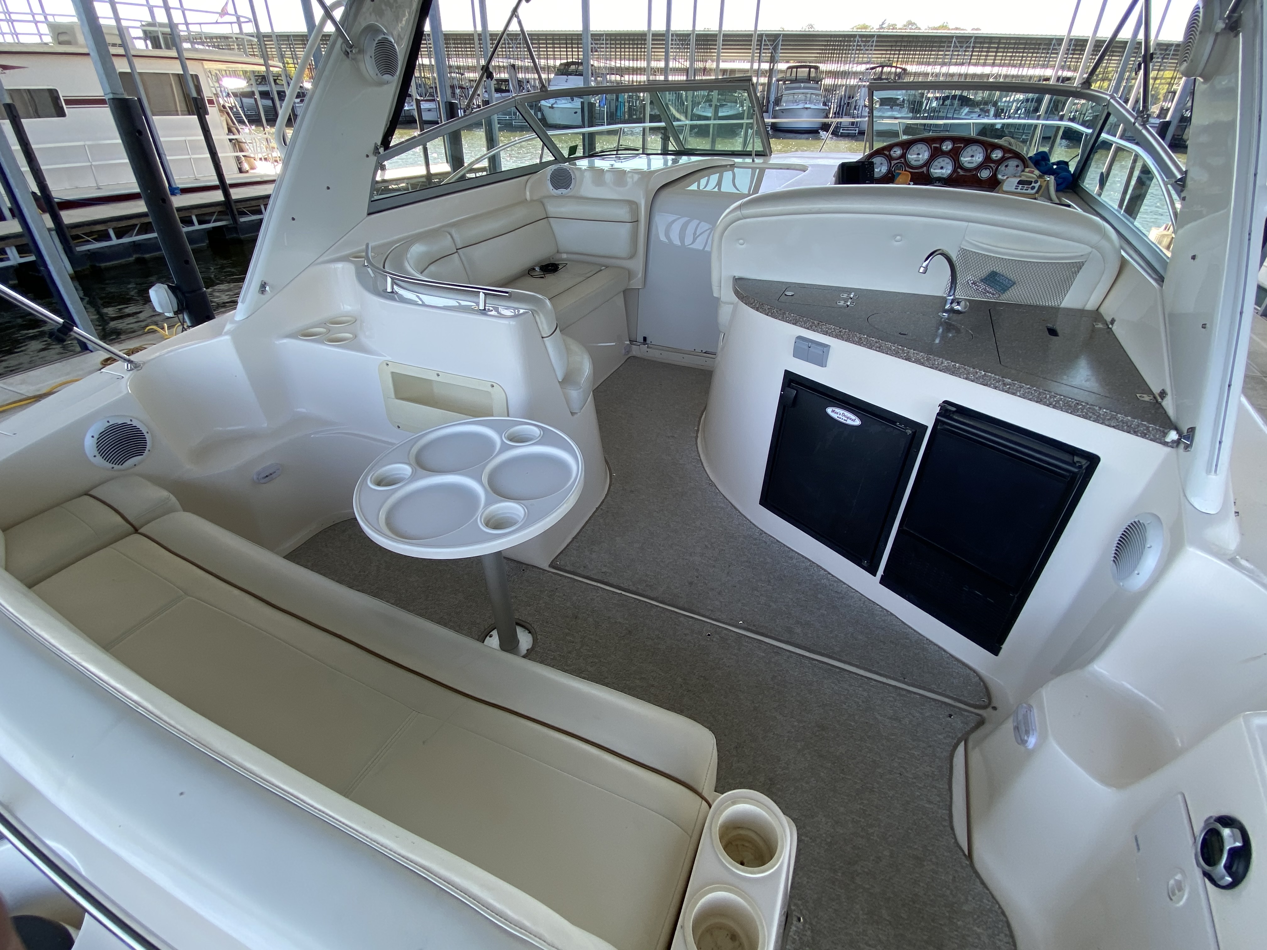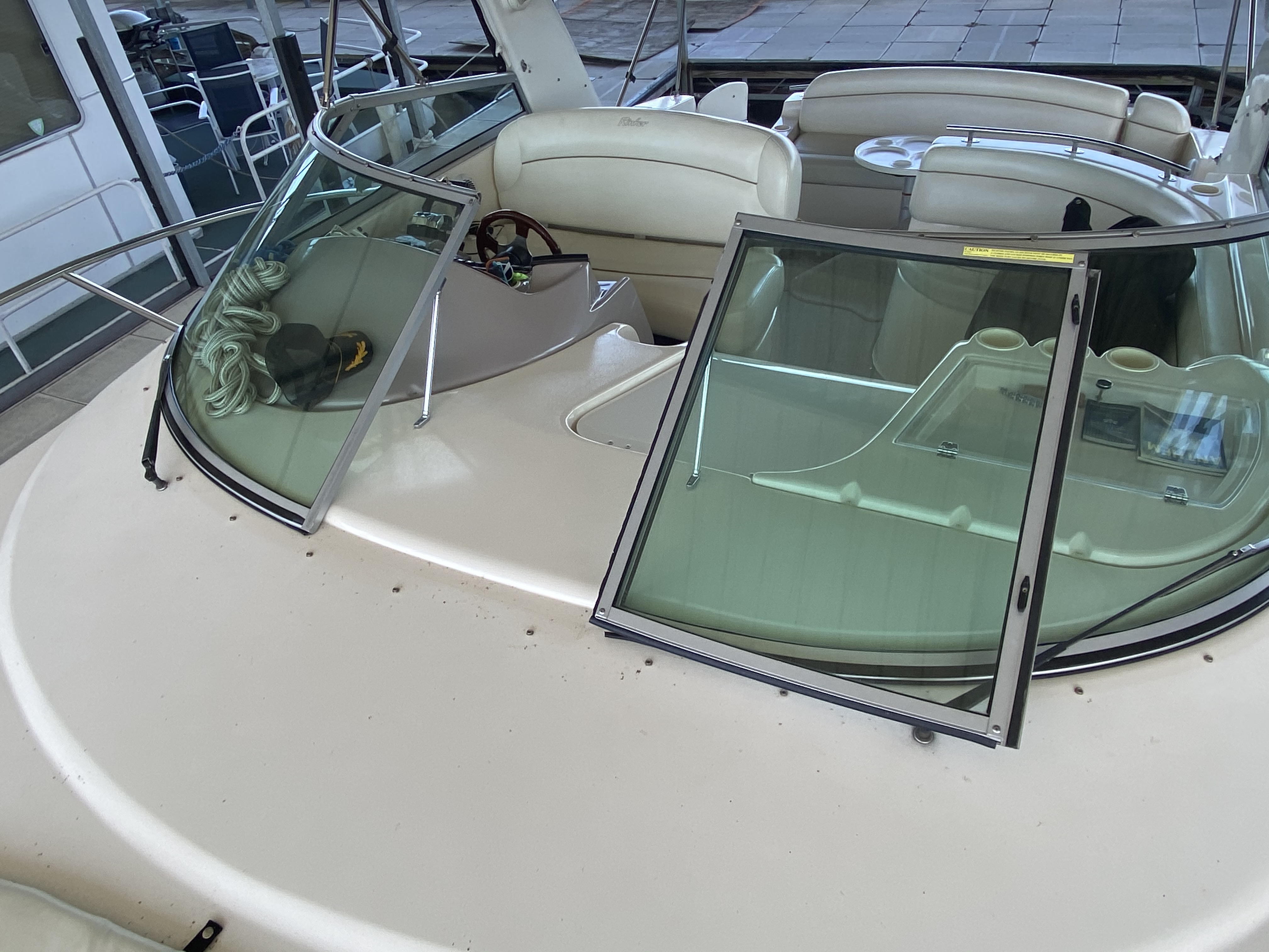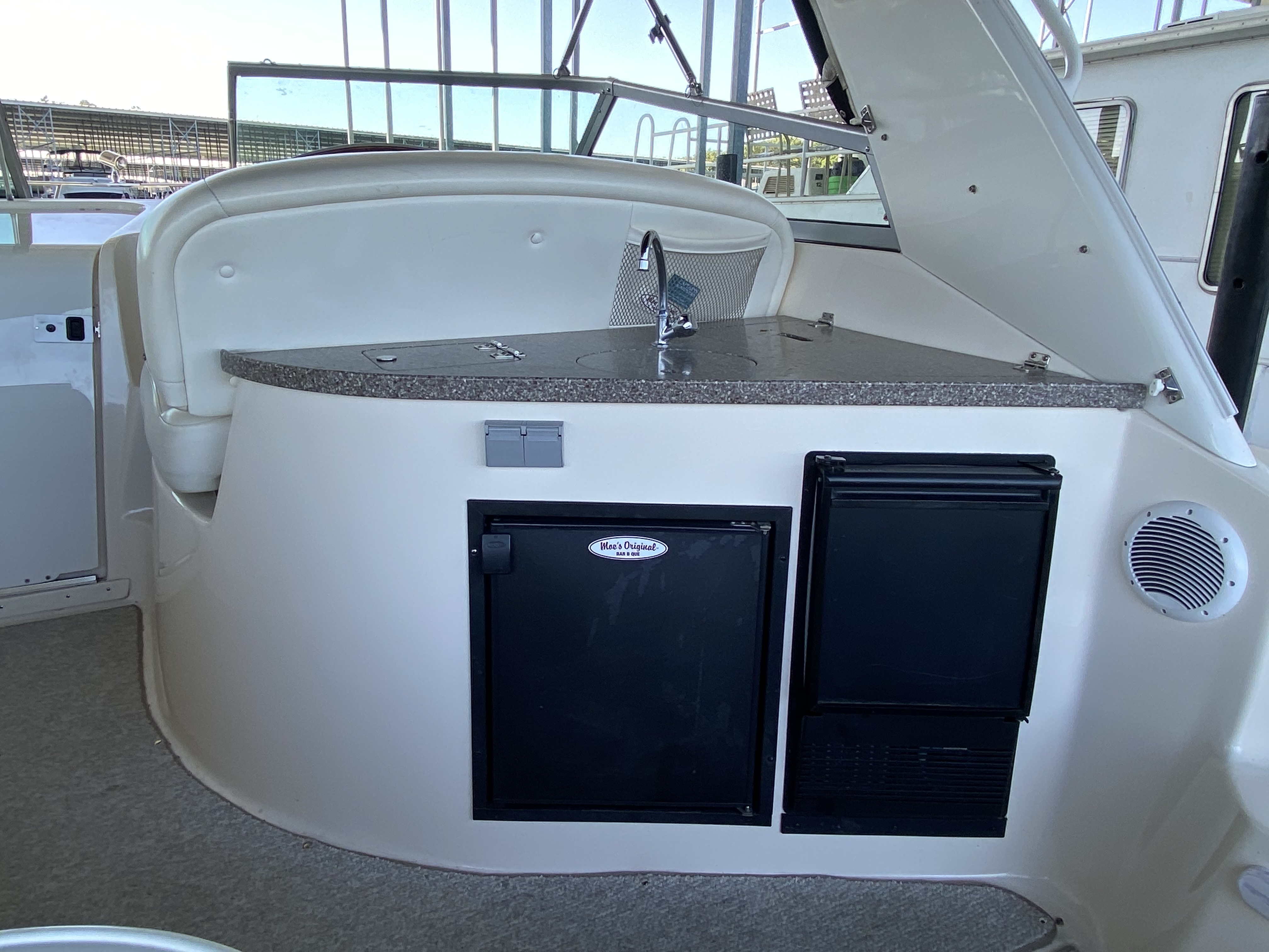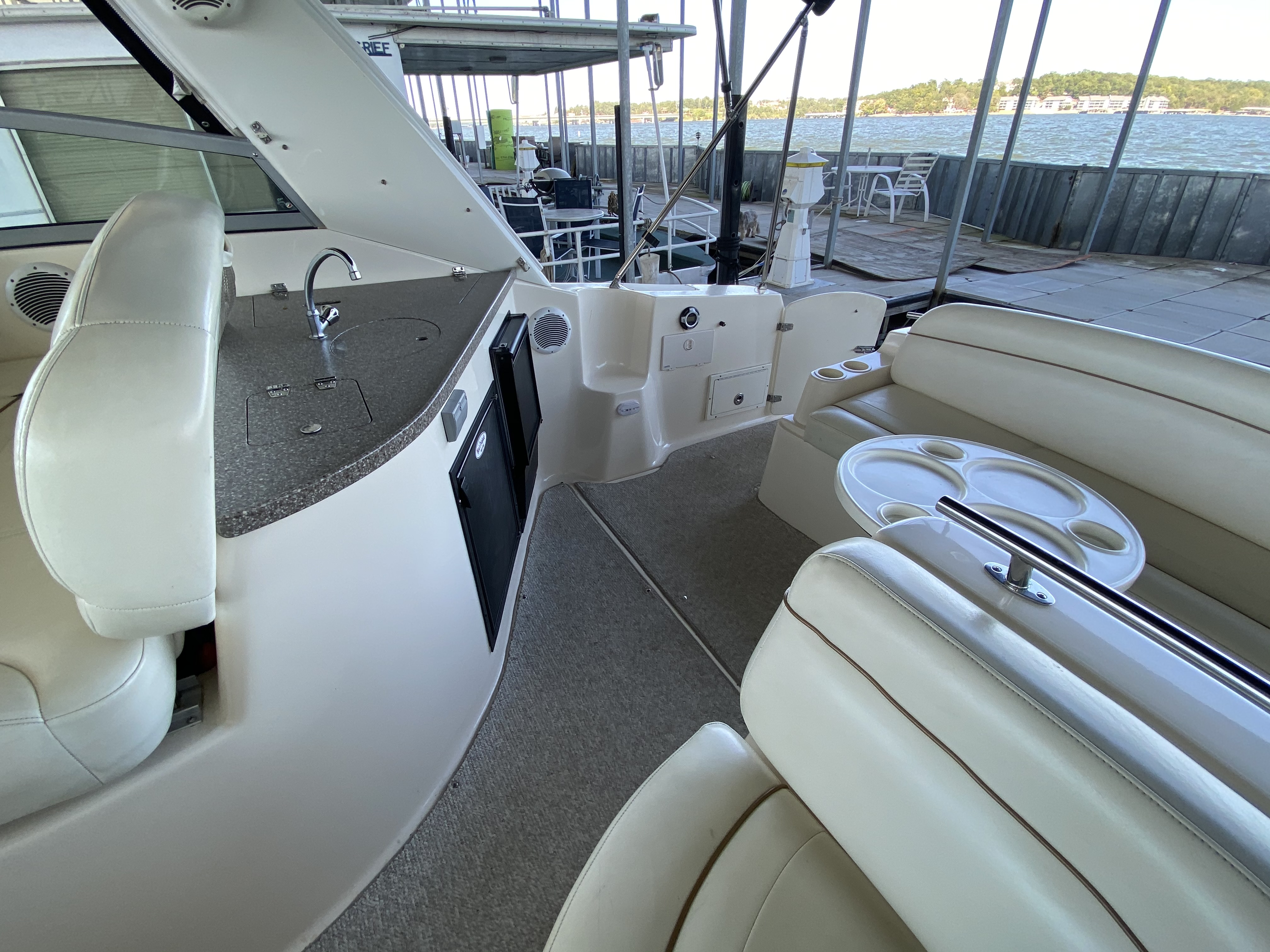 Deck/Hull: Anchor, Pulpit, Dock Power, Compass, Fenders with designated Storage, Spotlight, Windshield Wipers, Shore Water, Wet Bar w/ Sink, Icemaker, and Blender, Sunpad, Swim Platform, Transom Shower w/Hot & Cold Water, Arch