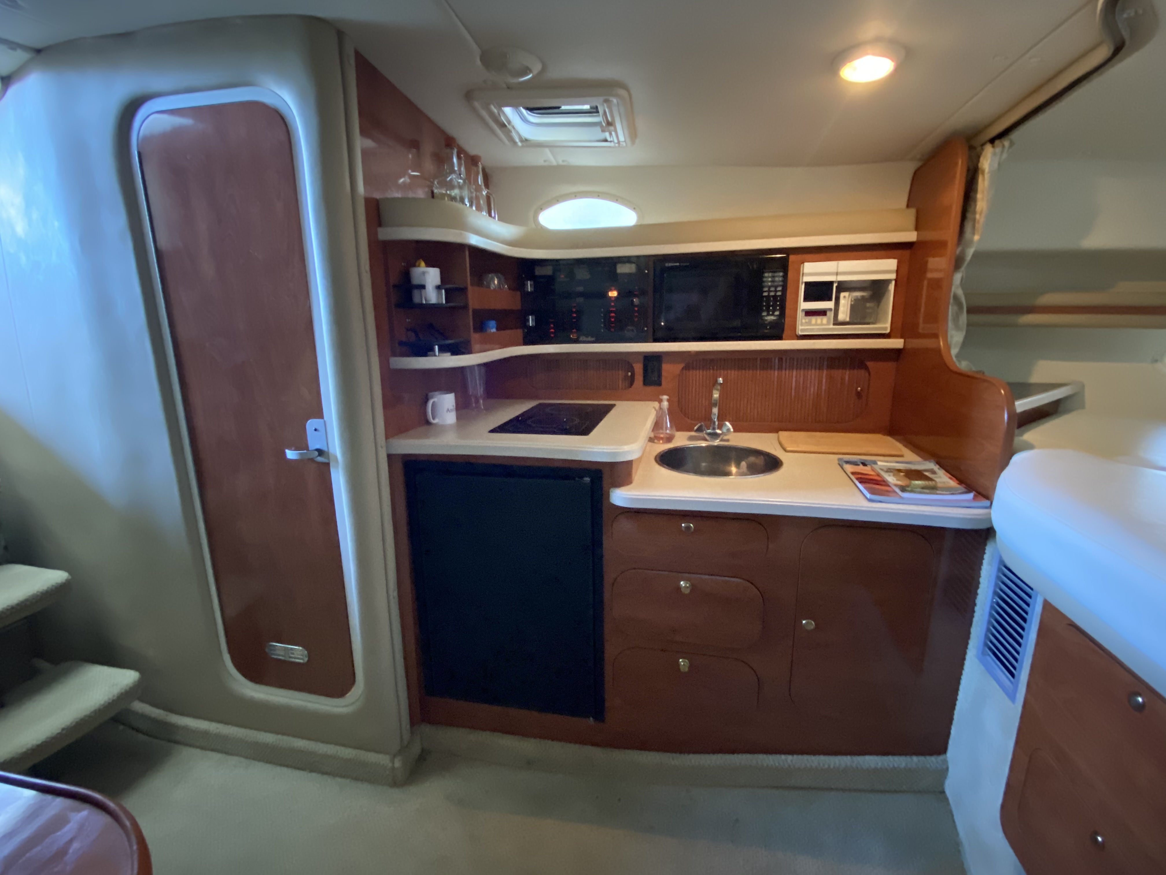 Galley: 2 Burner Electric Range, Microwave, Refrigerator, Coffee Maker, Sink, Dinette folds in Sleeping Berth,