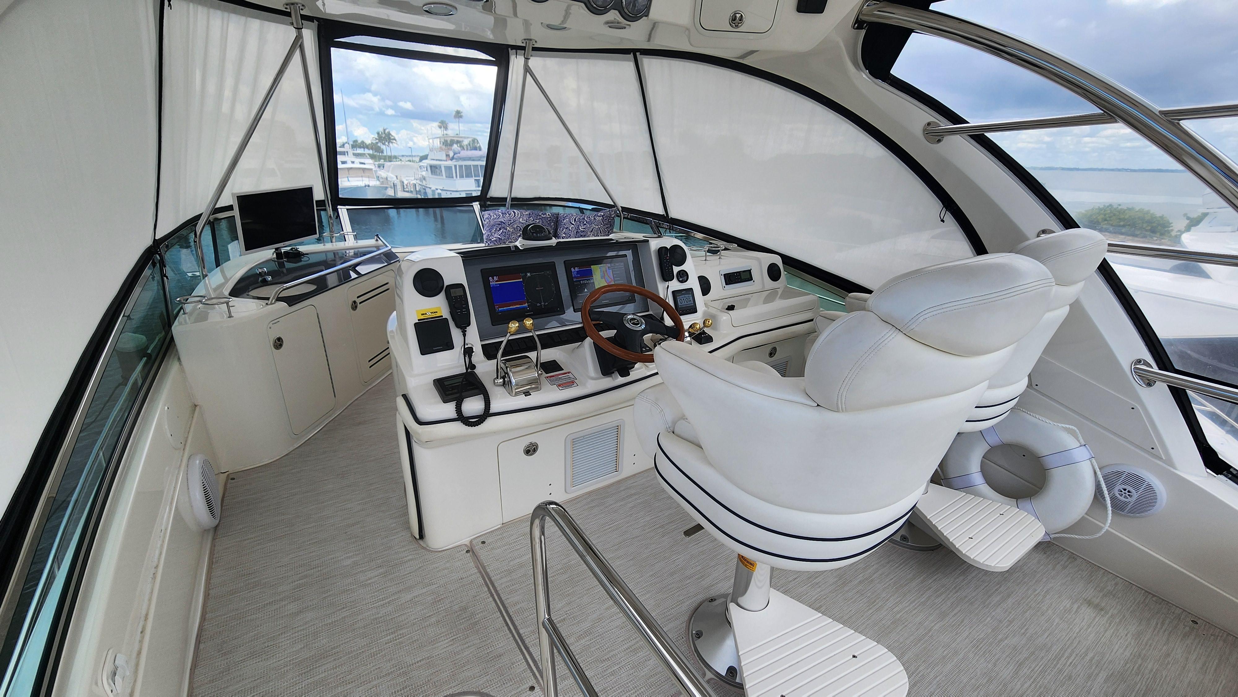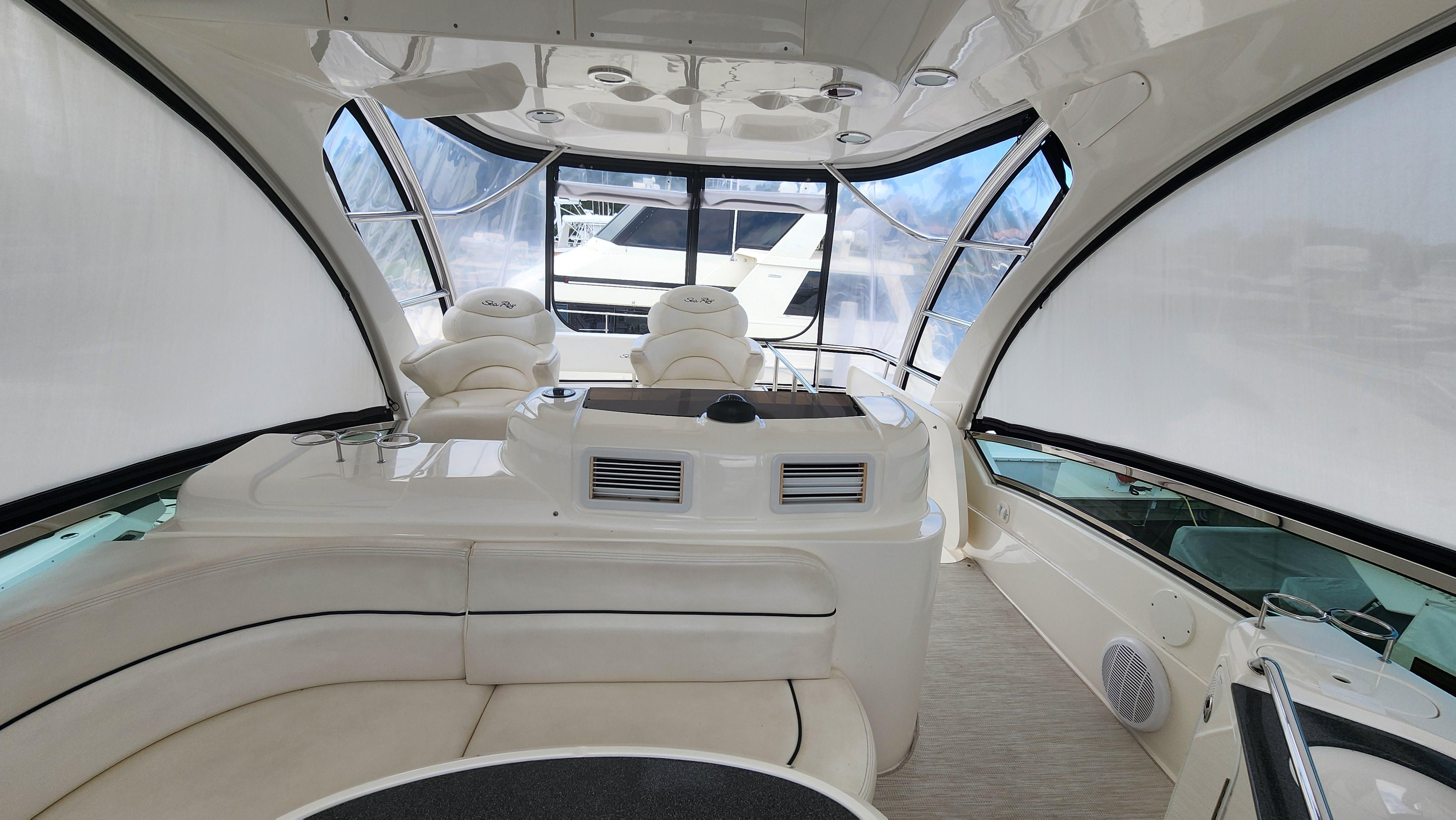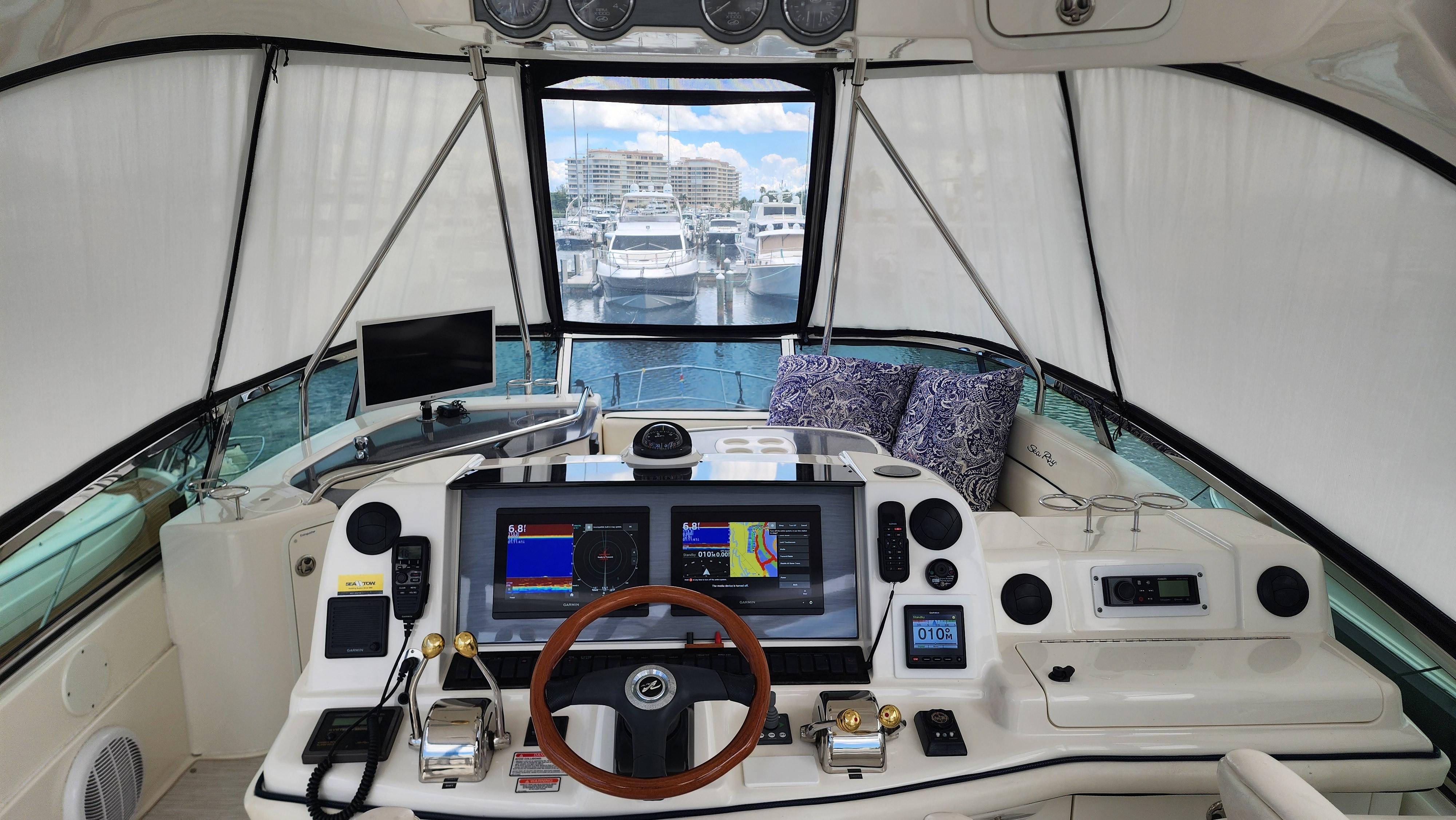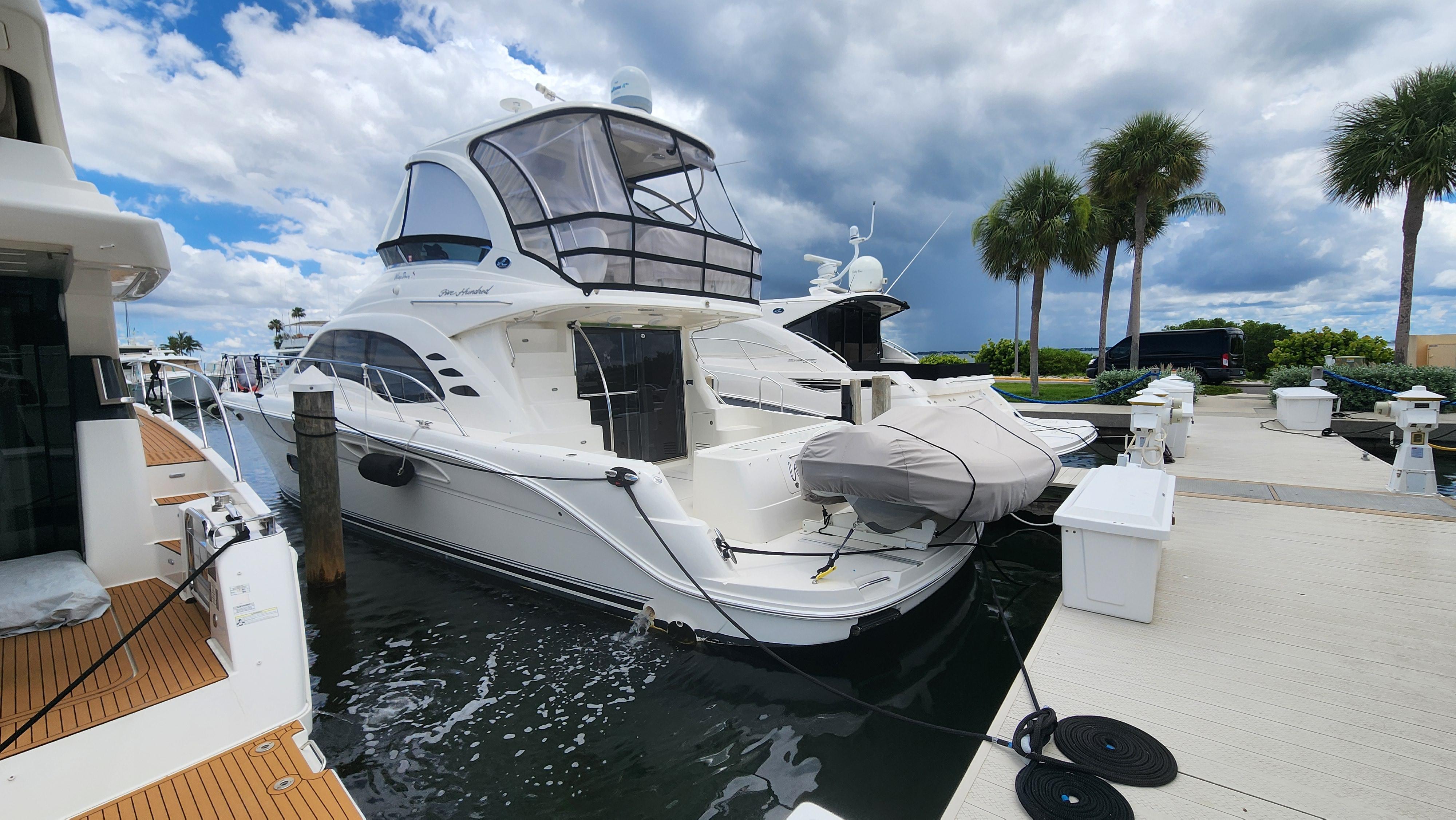 The Wine Down spent most of her life in fresh water. She was brought to Sarasota about three years ago. The Wine Down is a perfect example of Sea Rays best build years in the larger yachts. The Gel coat, Stainless steel, and overall build quality is Excellent. There have been many upgrades to the Wine Down including new Garmin electronics, two new integrated fusion stereo systems, all new led lights on the bridge level with changing colors from red, white, or blue. All the interior lights have been upgraded to led. The alternators, belts, batteries, and battery charger have recently been replaced. The Sea Star power steering ram was recently removed and completely rebuilt. The Marquipt davit was stripped, and powder coated. The main engines large exhaust collector tubes have been replaced. Some other recent upgrades include aft deck awning with stainless steel support poles, bridge and aft deck carpet, front window covers in white and black, new helm and upper lounge area covers, aft deck bench cover, and zip in sunshades for the forward bridge area. The boat also comes with spare propellers. The owner has had the boat professionally maintained. It has had regular maintenance checks, washdowns, polishing/waxing, and dive services. She is ready for cruising.