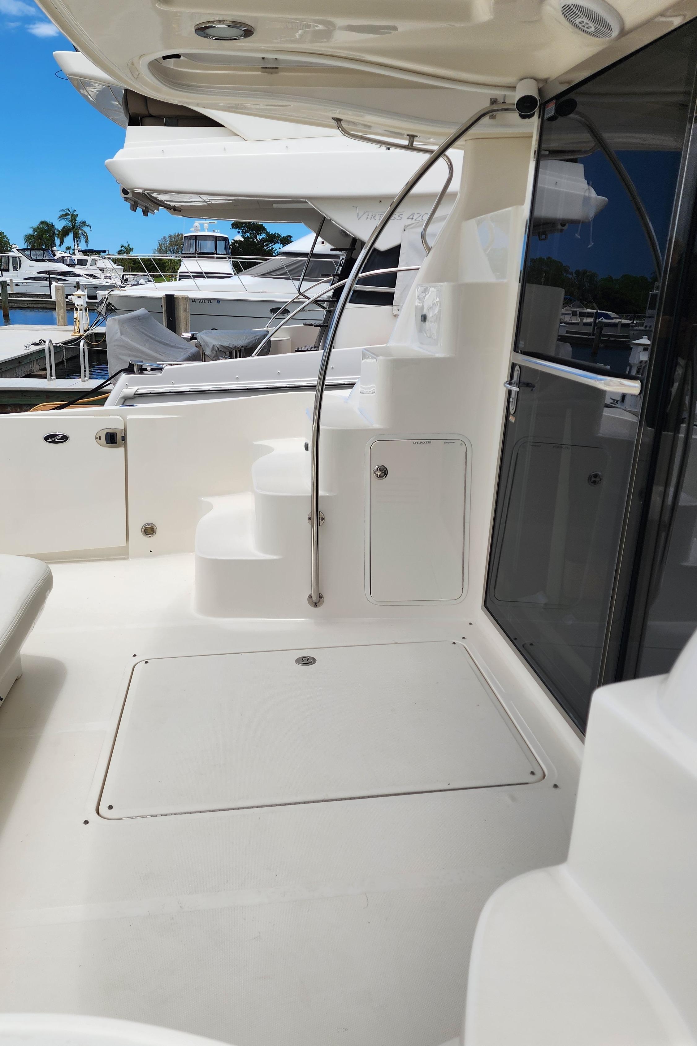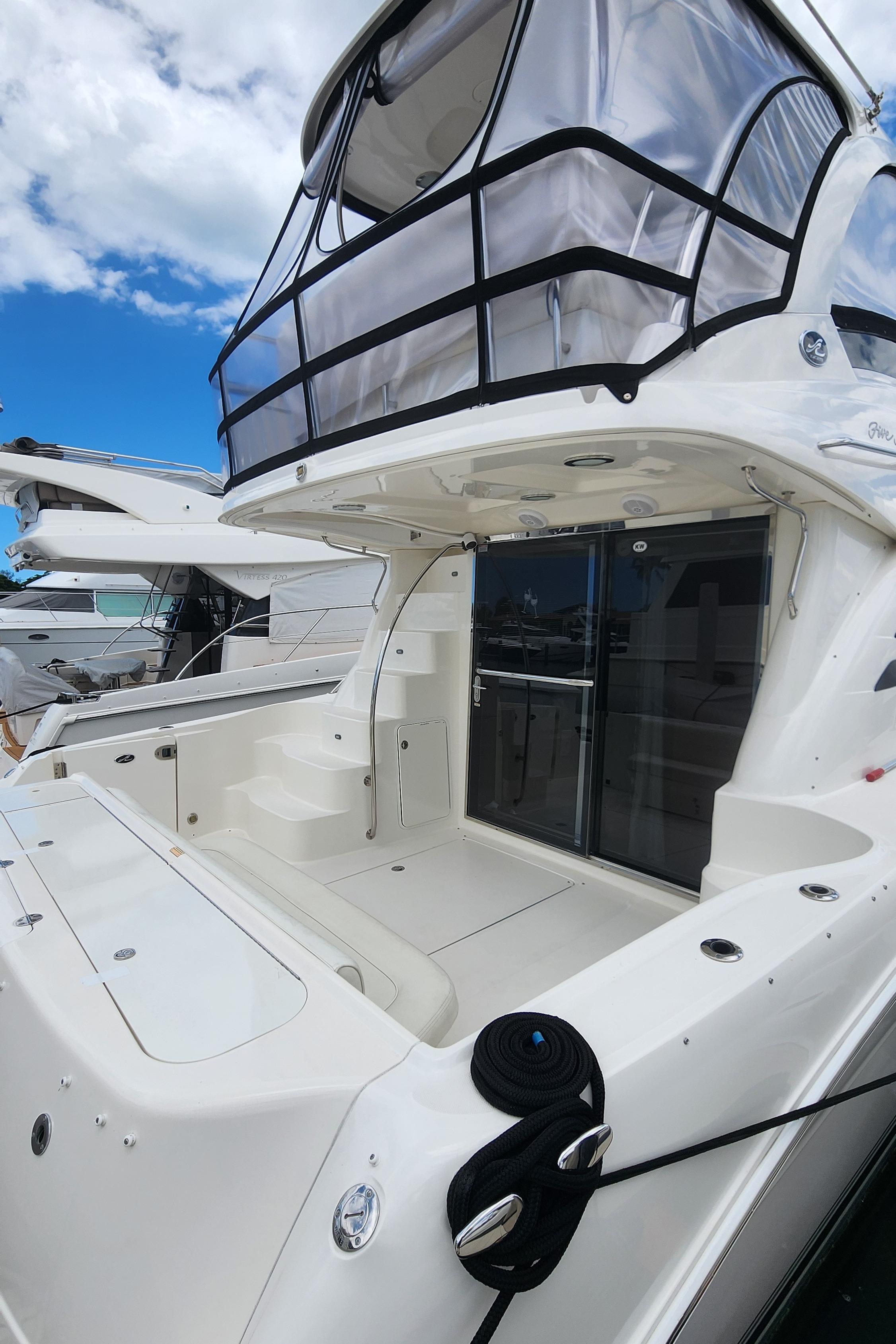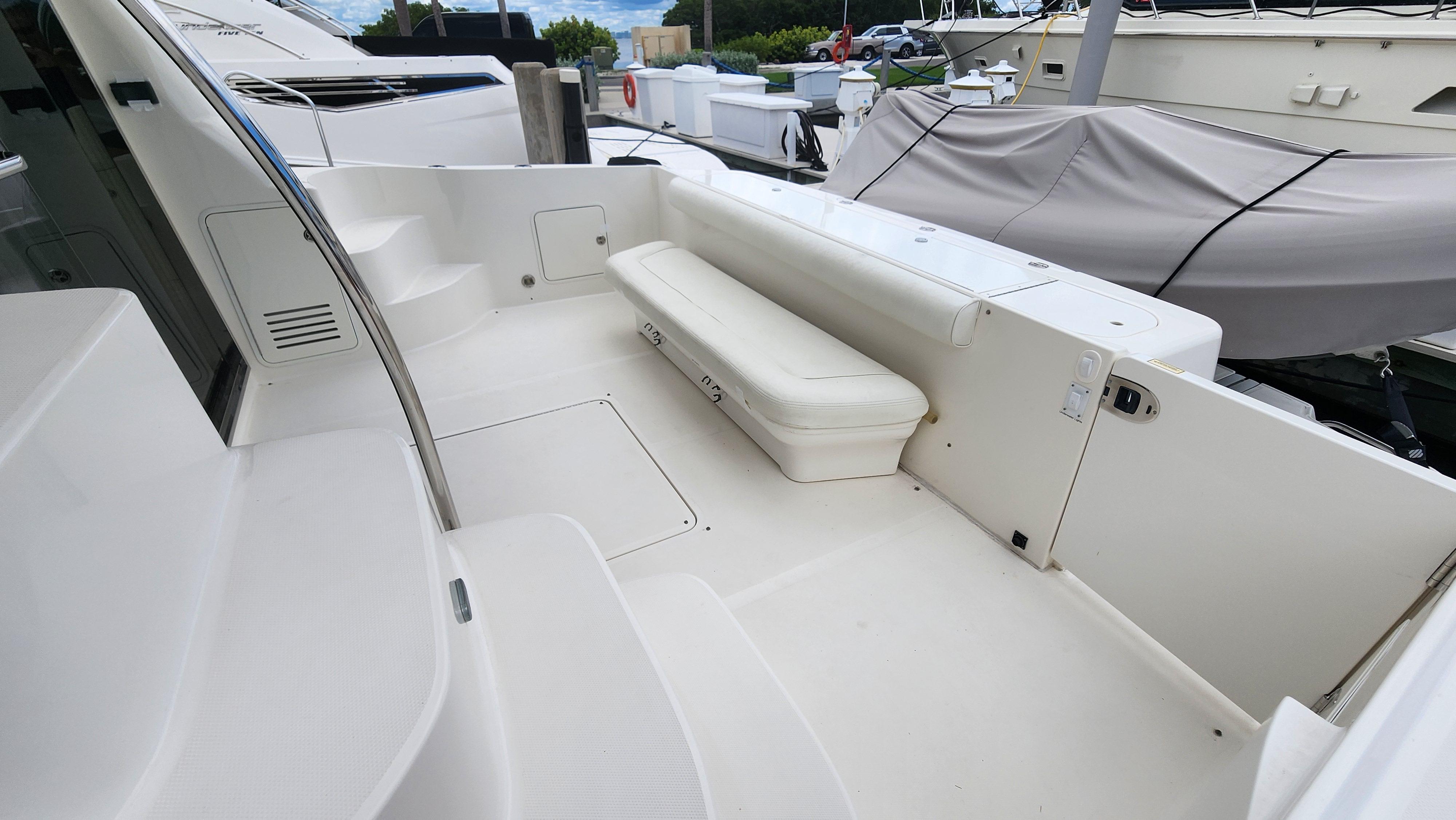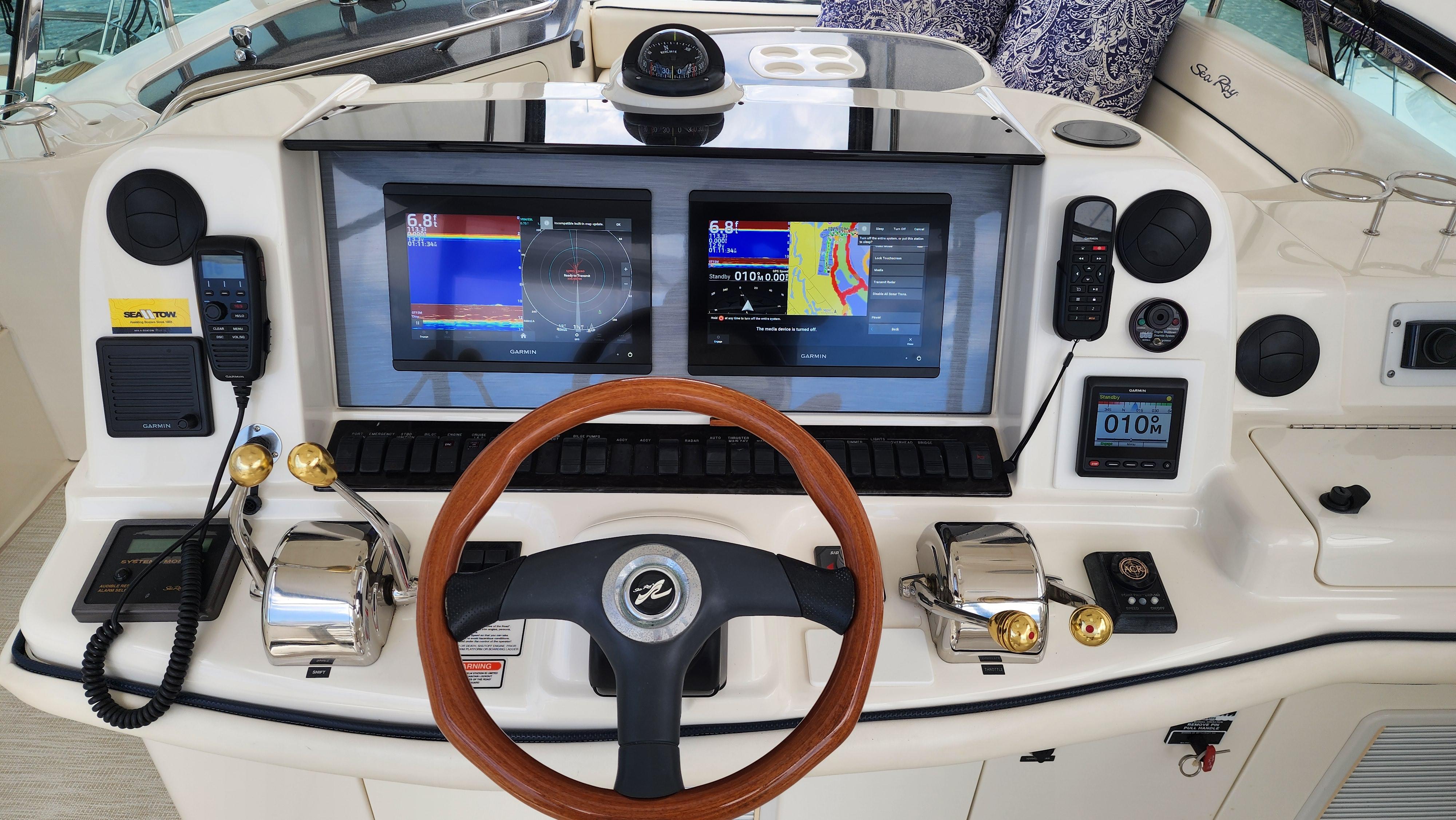 The Wine Down spent most of her life in fresh water. She was brought to Sarasota about three years ago. The Wine Down is a perfect example of Sea Rays best build years in the larger yachts. The Gel coat, Stainless steel, and overall build quality is Excellent. There have been many upgrades to the Wine Down including new Garmin electronics, two new integrated fusion stereo systems, all new led lights on the bridge level with changing colors from red, white, or blue. All the interior lights have been upgraded to led. The alternators, belts, batteries, and battery charger have recently been replaced. The Sea Star power steering ram was recently removed and completely rebuilt. The Marquipt davit was stripped, and powder coated. The main engines large exhaust collector tubes have been replaced. Some other recent upgrades include aft deck awning with stainless steel support poles, bridge and aft deck carpet, front window covers in white and black, new helm and upper lounge area covers, aft deck bench cover, and zip in sunshades for the forward bridge area. The boat also comes with spare propellers. The owner has had the boat professionally maintained. It has had regular maintenance checks, washdowns, polishing/waxing, and dive services. She is ready for cruising.