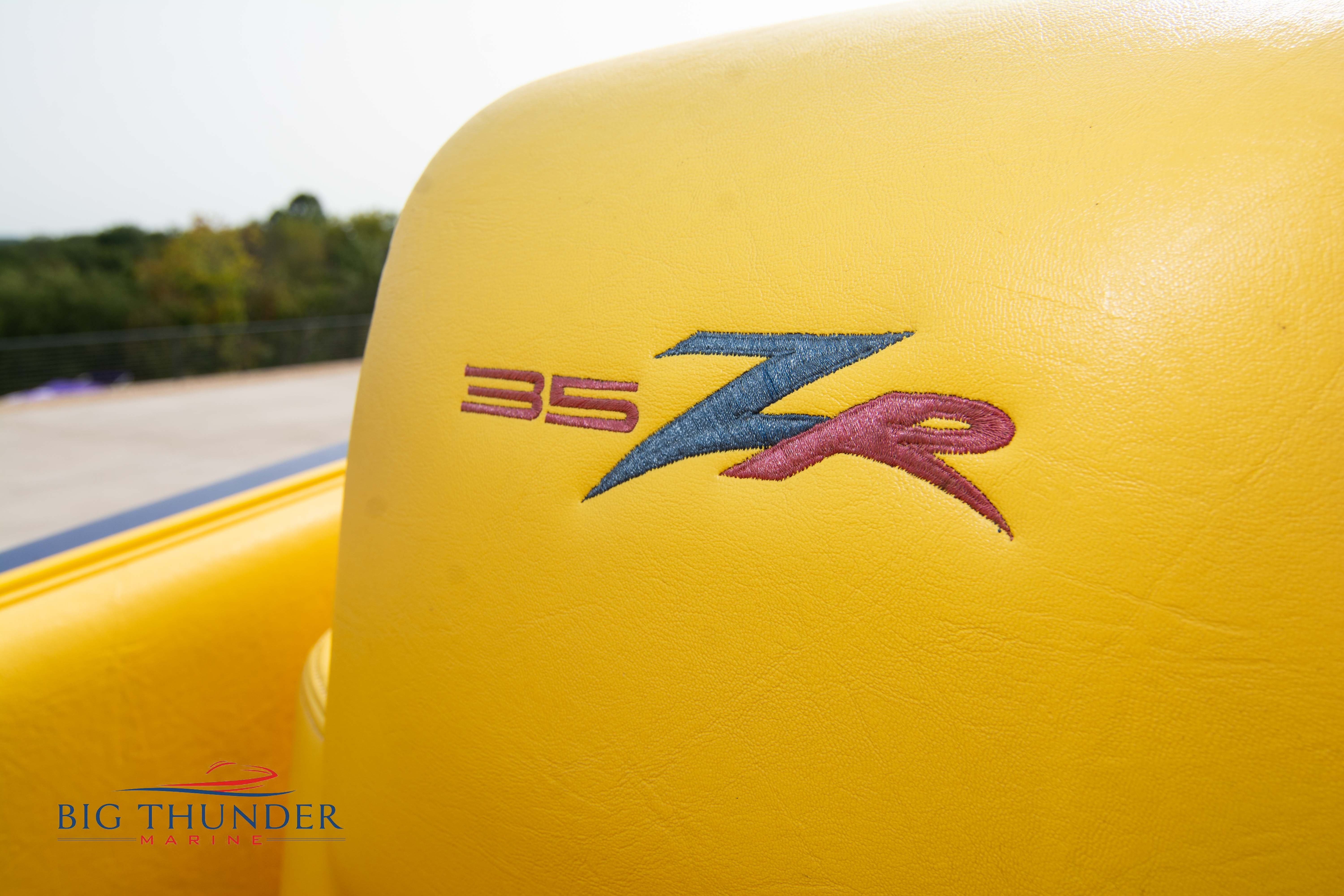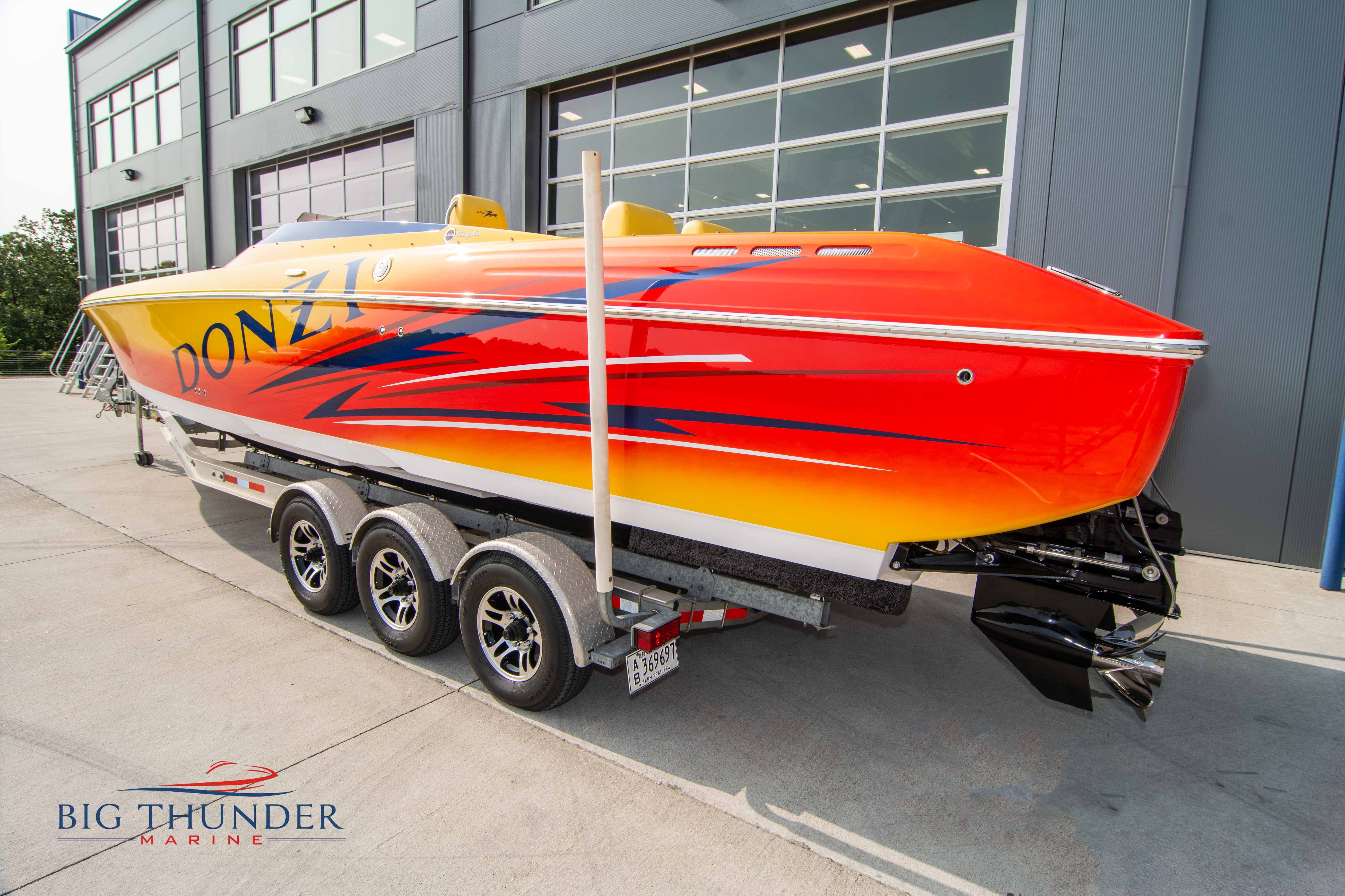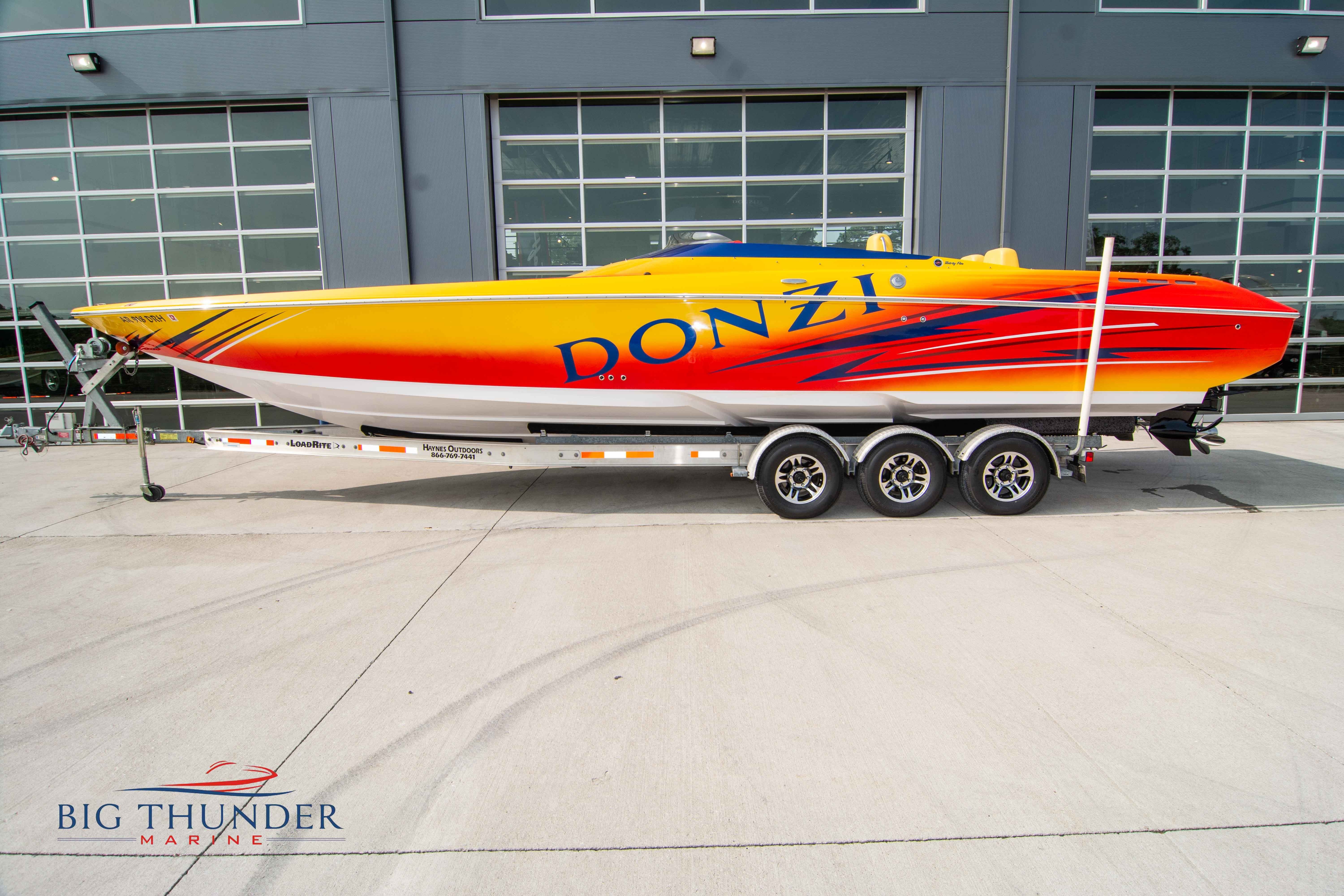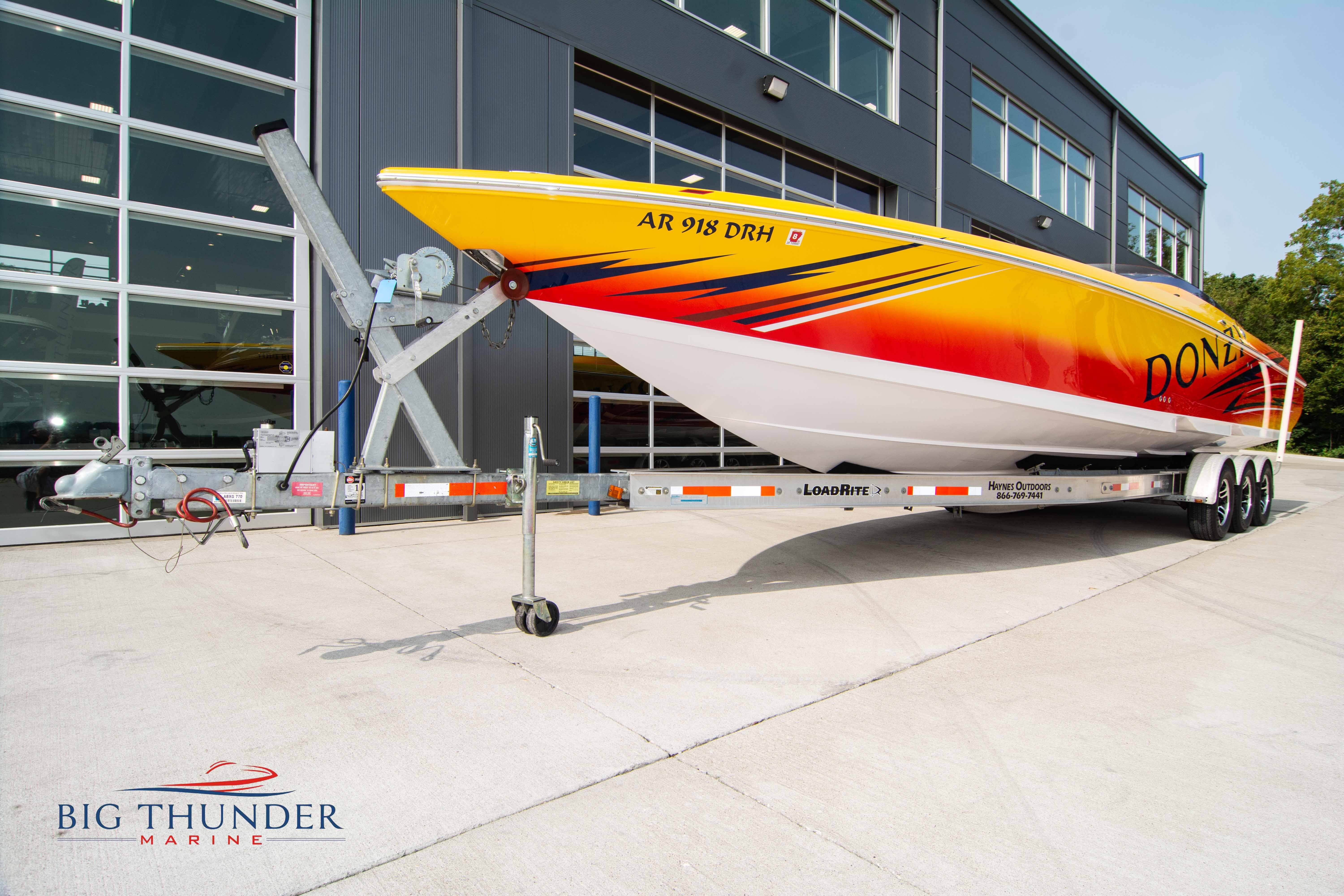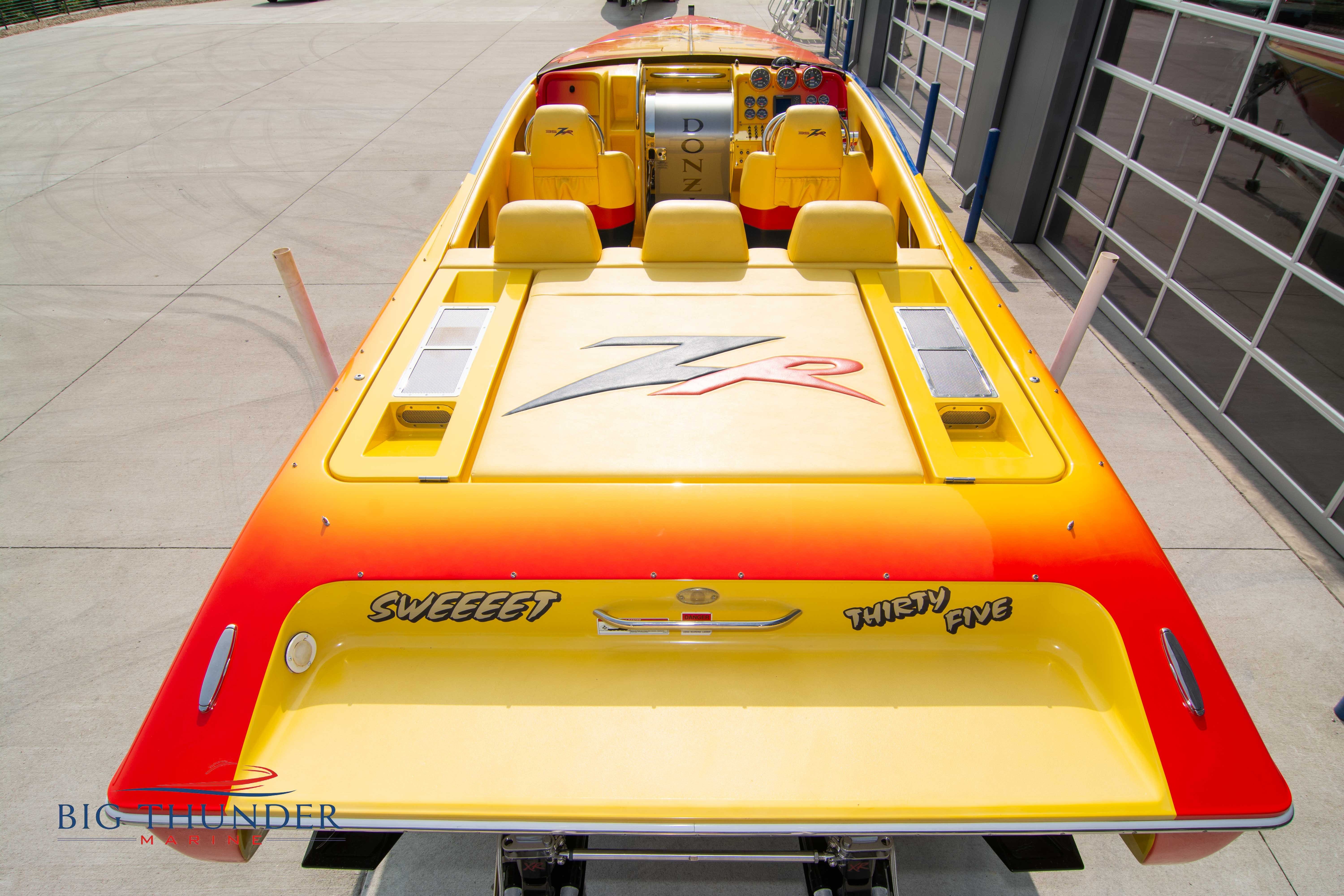 2006 Donzi 35 ZR Mercury Racing HP525EFI (435 on boat - top ends 65 hours ago - 83 mph) XR drives, 30 pitch Maximus 5 blade props, 280 K planes, mechanical drive/tab indicators, Latham hydraulic steering, Livorsi gauges, GPS speedometer, Lowrance GPS, depth sounder, halon system, silent choice exhaust, Fusion/JL Audio stereo with helm remote, electric bolsters, cockpit carpet, cockpit cover, new bimini top, cabin sink, shore power with AC/heat, battery charger, marine head, Load Rite aluminum trailer with aluminum rims included.