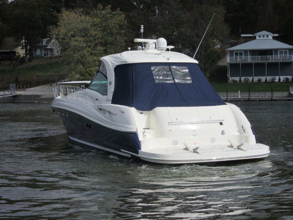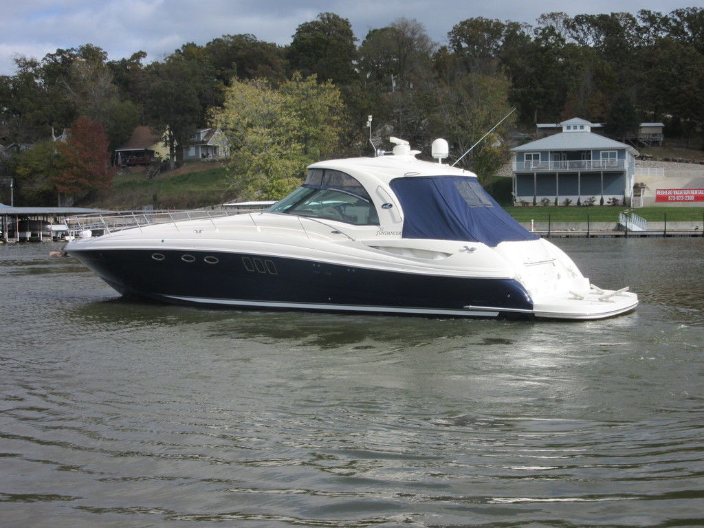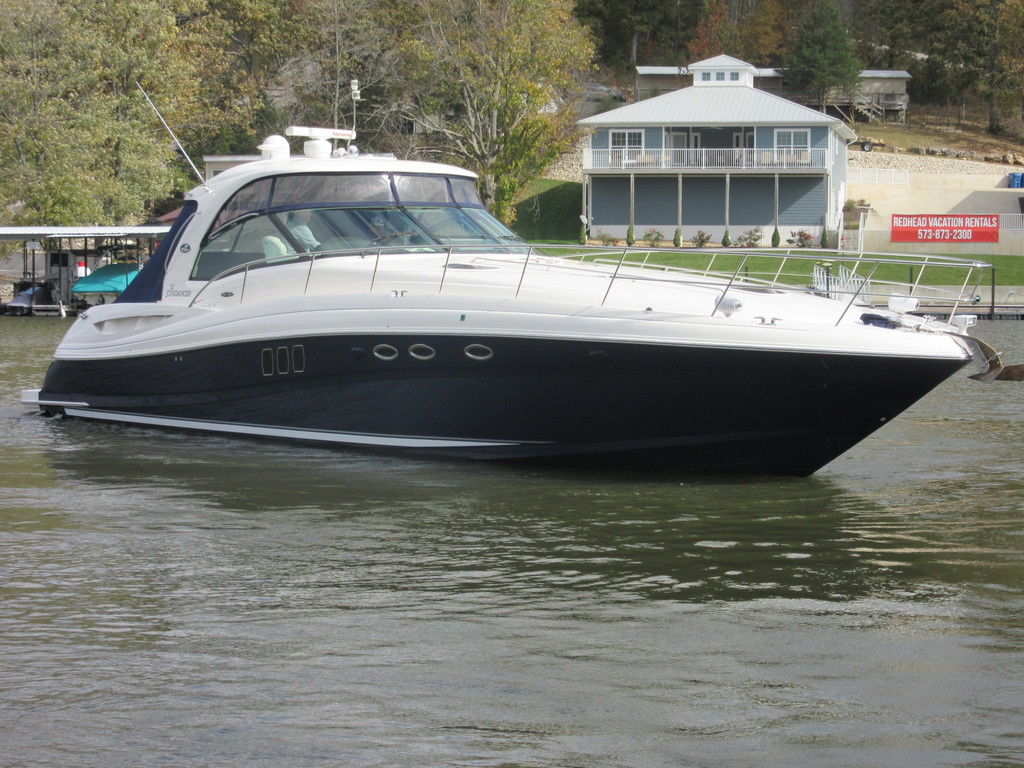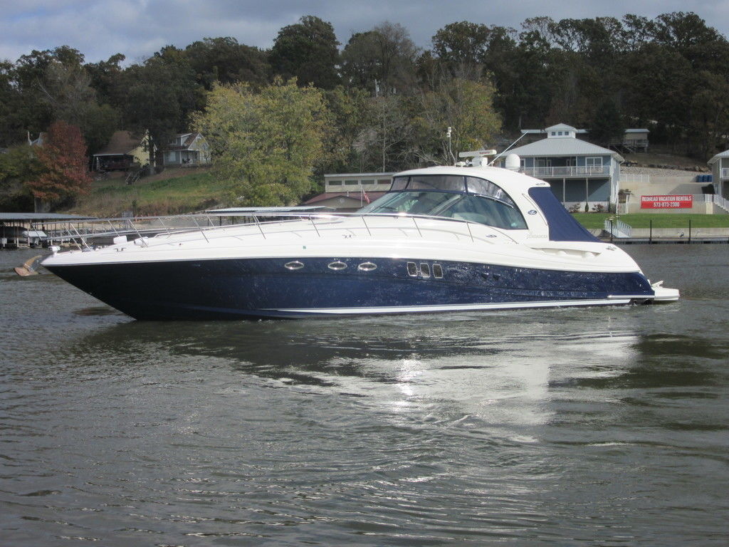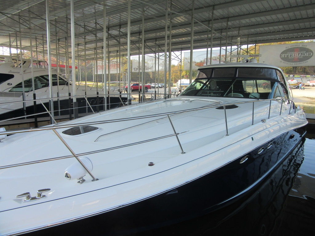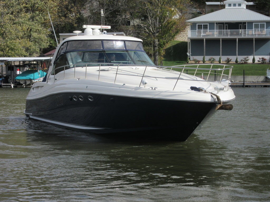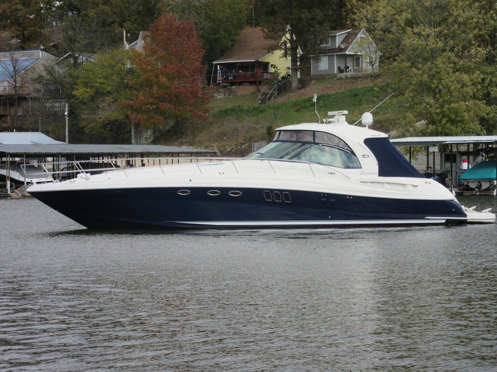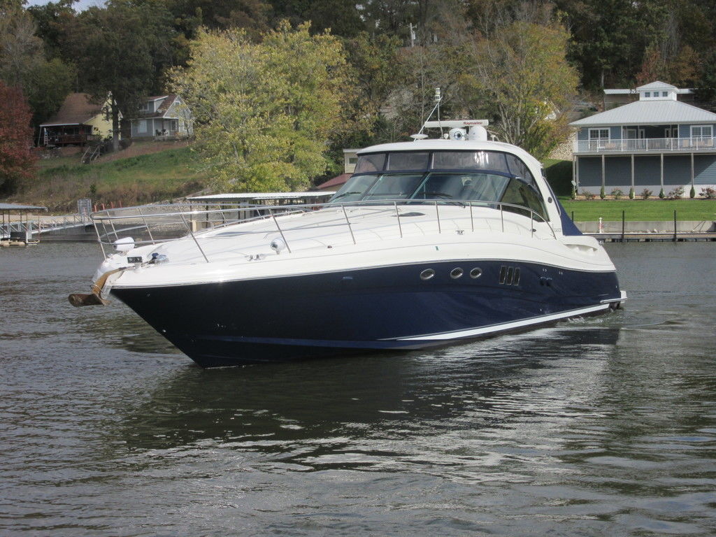 2006 FRESH WATER ONLY 2 OWNER Sea Ray 52 Sundancer powered by twin Cummins QSM-11 Diesel V-drives with 870 hours, Onan diesel generator with 2803 hours, bow thruster, hydraulic swim platform, cockpit A/C & heat, Smartcraft, Raymarine E120 GPS/Chartplotter/Radar with 4kW open array, Raymarine auto pilot, VHF radio, Sea Ray Navigator II GPS/Chartplotter, Fusion/JL Audio stereo system, cockpit TV, wetbar with refrigerator, ice maker, and sink, remote spotlight, two burner stove, coffee maker, microwave/convection oven, under counter refrigerator and freezer, and sink. Trac Vision satellite TV, Salon 30” LCD flatscreen with Bose Lifestyle sound system, 17” LCD TV/DVD combo in master stateroom, two 14” LCD TV/DVD combos, two full heads with Vacuflush toilets and full showers, central vacuum system, washer/dryer, Cablemaster Glenndinning 50 Amp 75’ shore power cord, and windlass anchor. September 2017 new bottom paint, buff and wax, new hull stripes, new props, original props included for spares, 700 hour service performed by Mid-South Cummins. All trades considered, financing and transportation available.