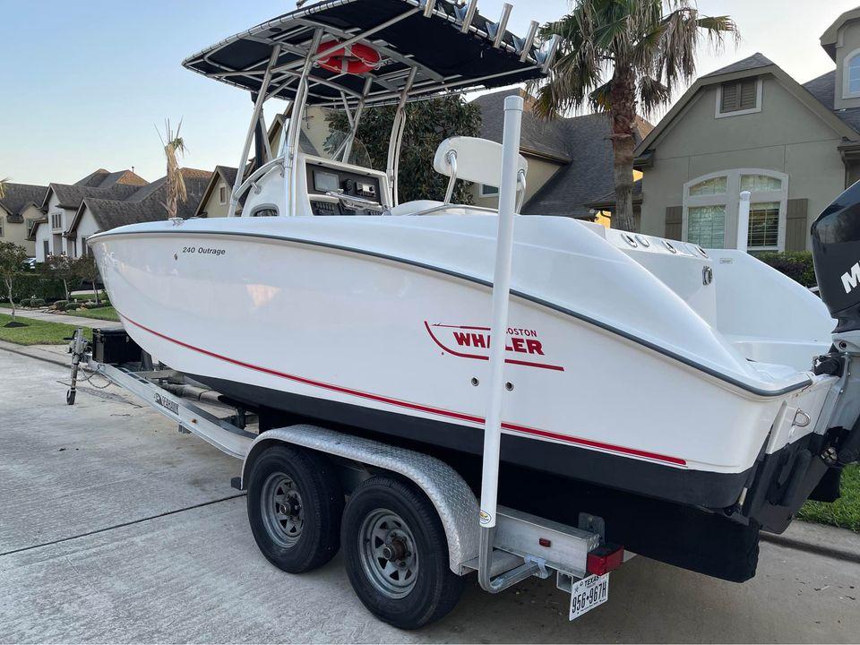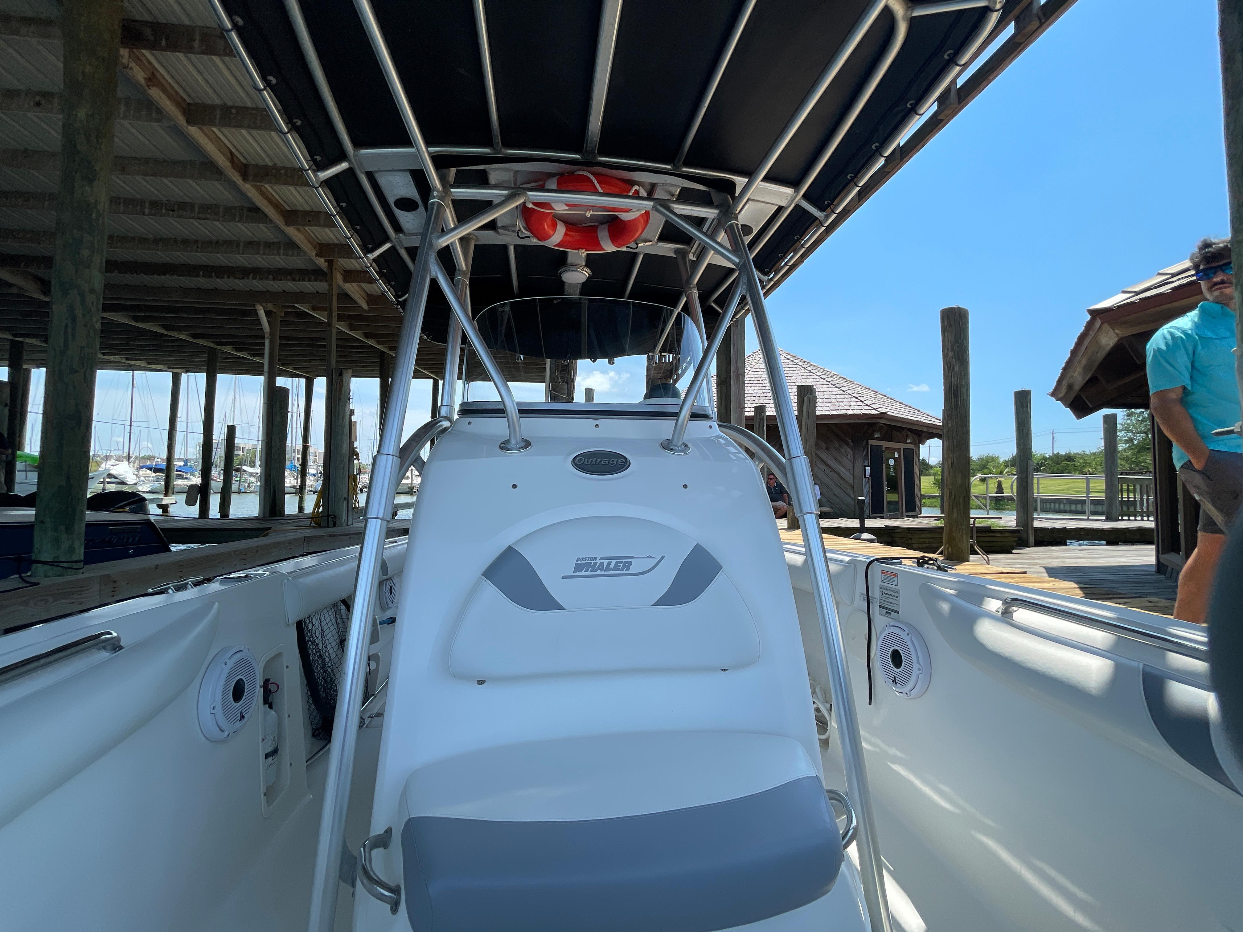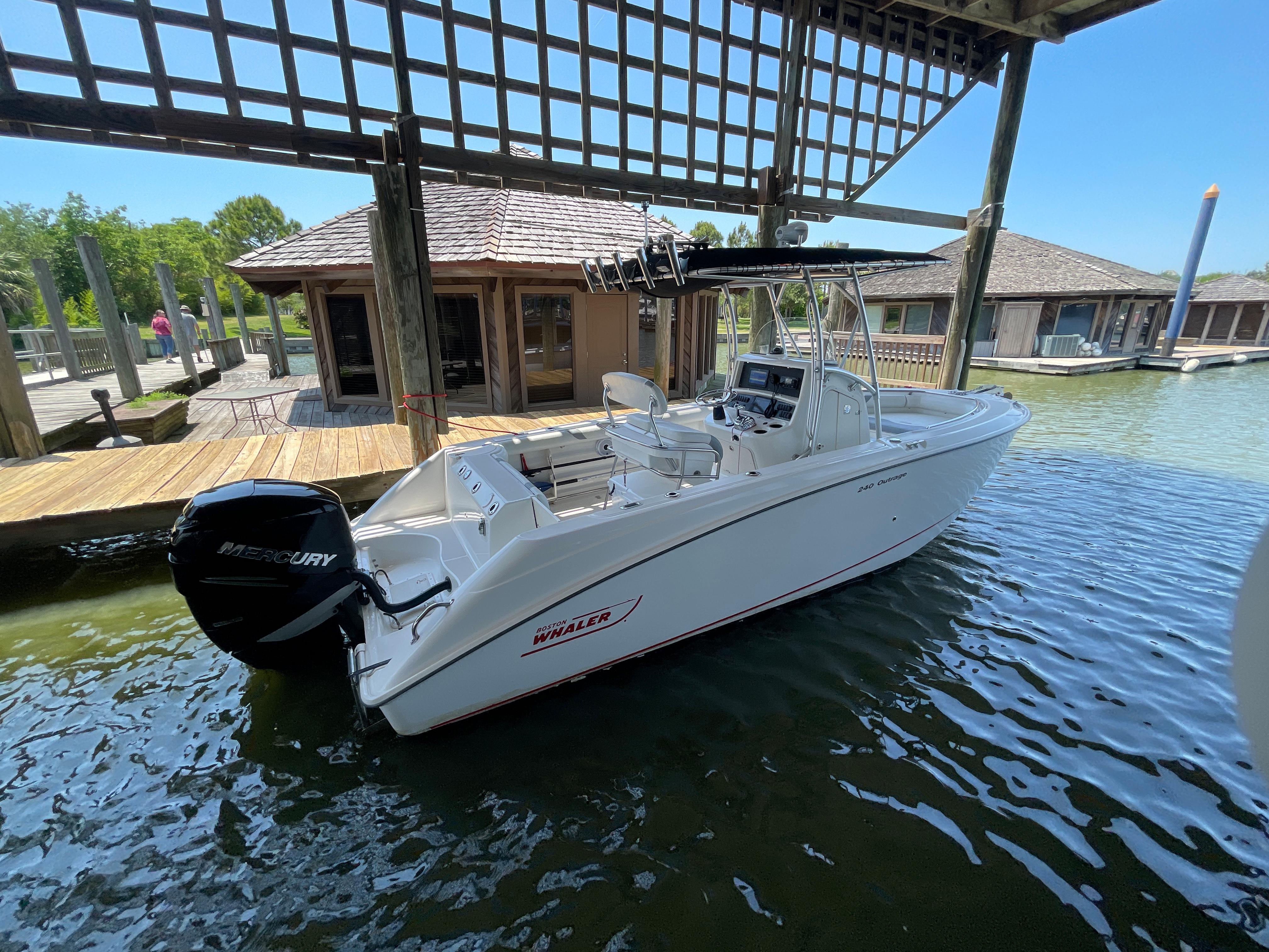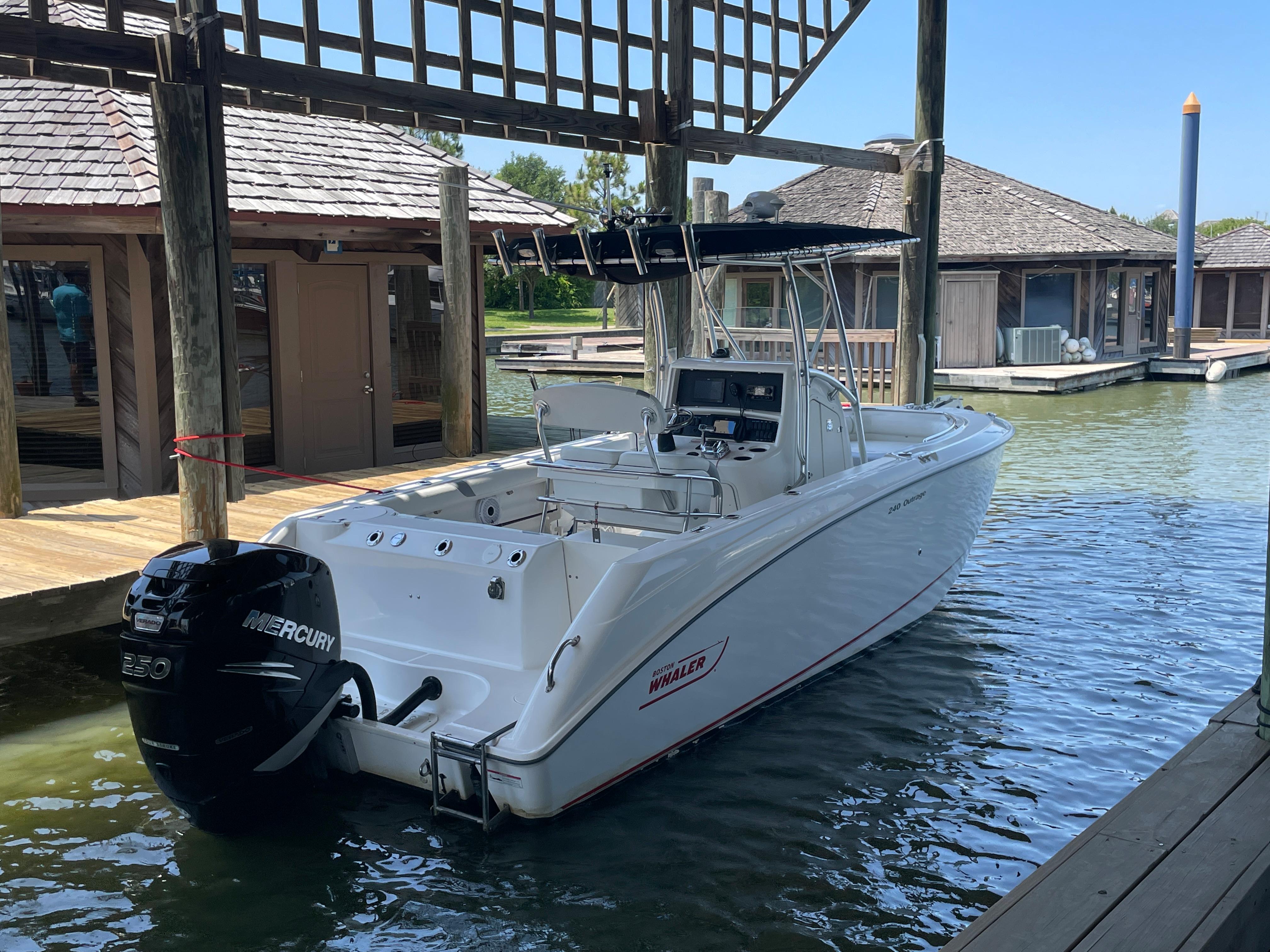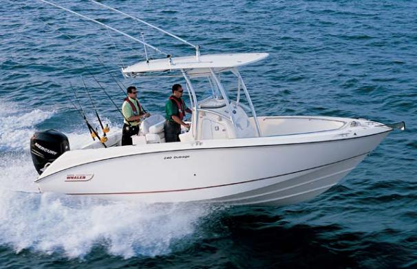 With big-boat standard features in an easily trailerable package, the Boston Whaler 240 Outrage is ready for serious bluewater fishing right out of the box. Its wide beam provides plenty of space for 360-degree fishing for up to a dozen avid anglers - made to feel comfortable and secure, thanks to high interior freeboard, stainless steel toe rails and aft coaming bolsters. There's ample storage for everyone's gear, including rod holders at the gunnels and transom, as well as under-gunnel rod racks, plus port and starboard fishboxes to hold the day's catch. An enclosed head / storage area helps keep the fun going all day long without heading back to shore. And getting in and out of the boat is easy, with a convenient transom door and integral swim platform with grab rail and stainless steel swim ladder. Select from a host of options, including dual engines, leaning post options and much more.