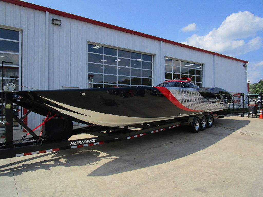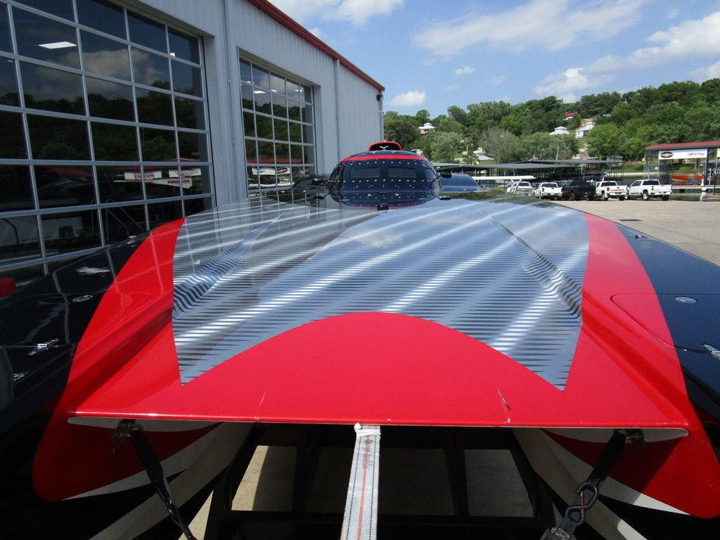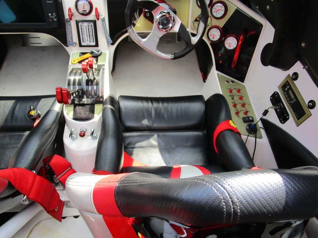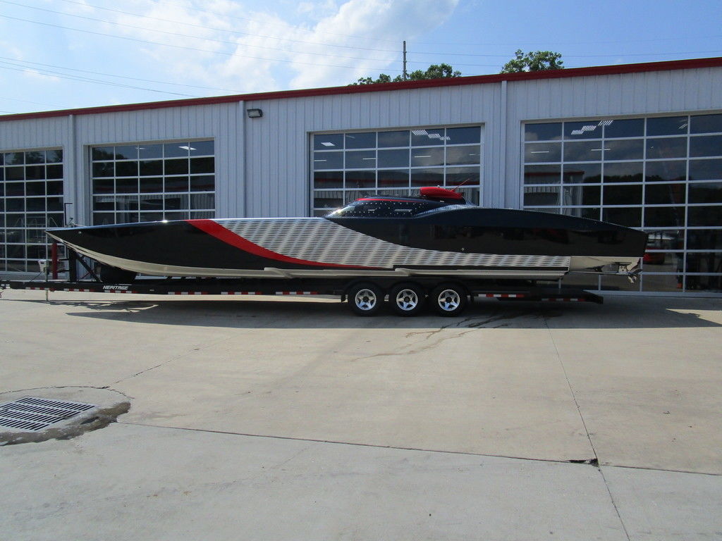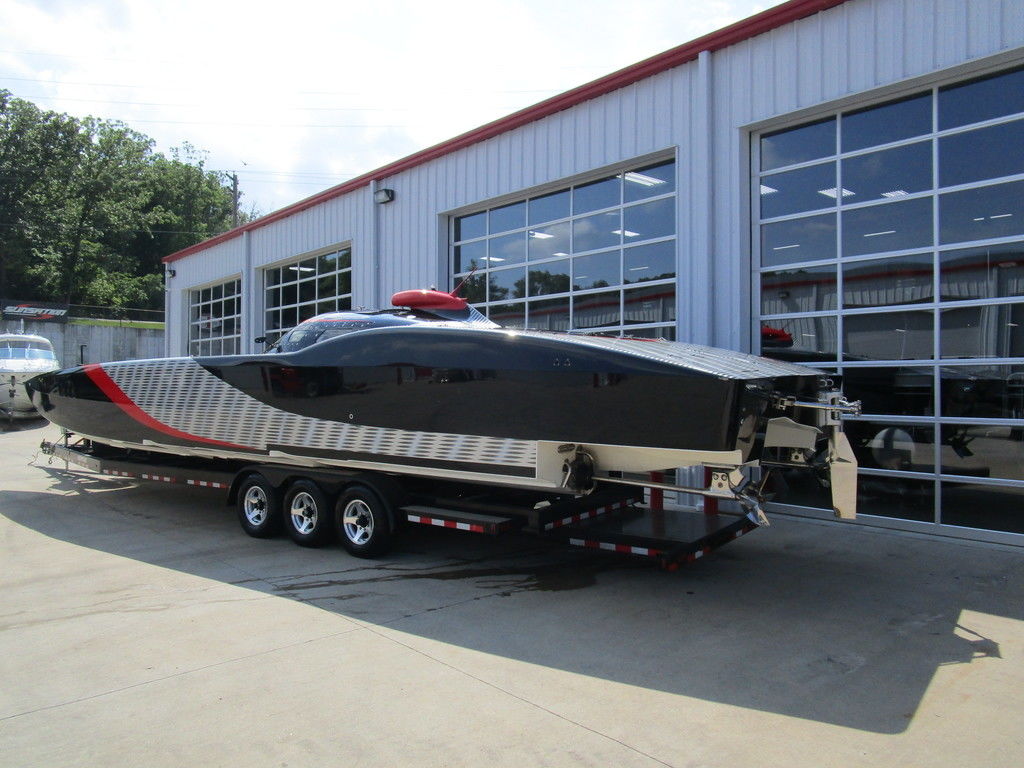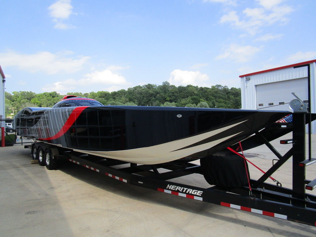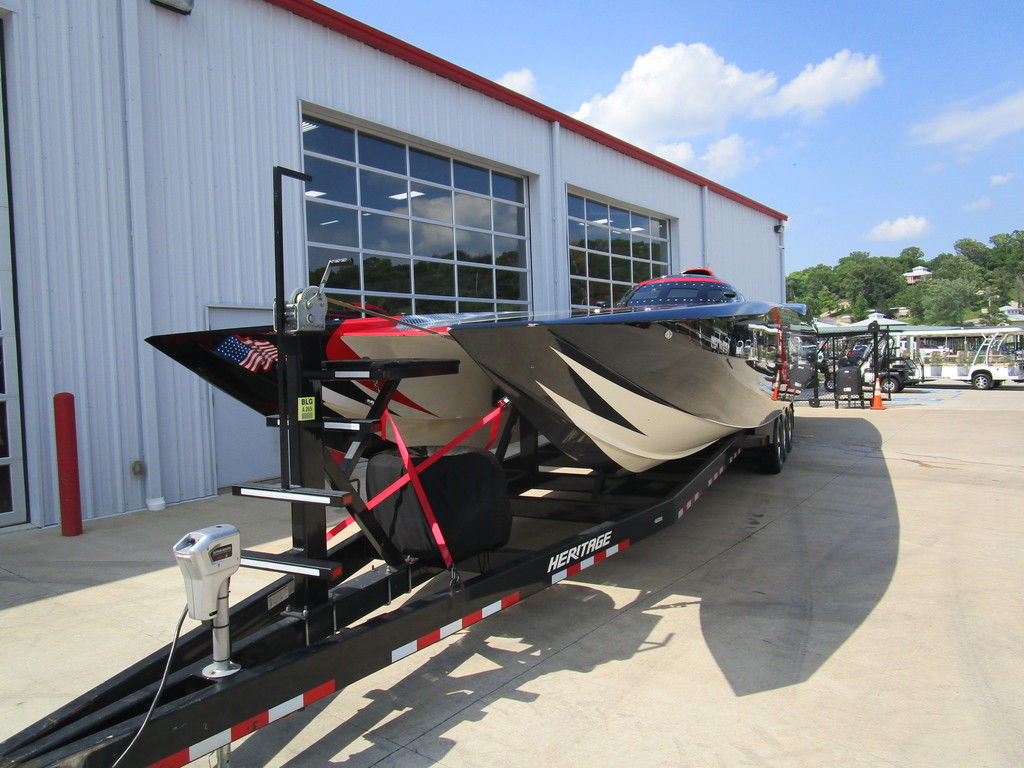 2007 MTI 44 Bud Select race boat converted to pleasure powered by twin Sterling 1200s, shaft drives with rudder, Mercury CNC props 5 blade props, tunnel tab, Racepak gauges, Raymarine GPS/Chartplotter, Livorsi gauges, GPS speedometer, mechanical indicators for shafts and tunnel tab, intercom system with headsets, vhf radio, fume detector, halon system, escape hatch in floor, and Heritage flat trailer included.