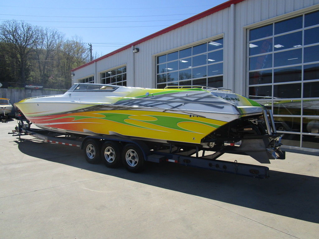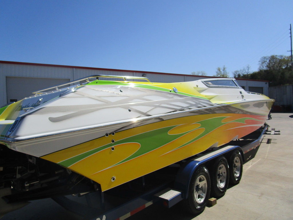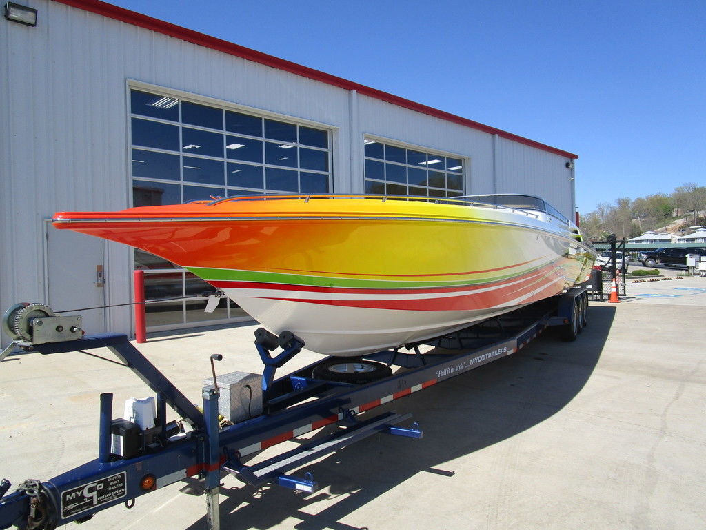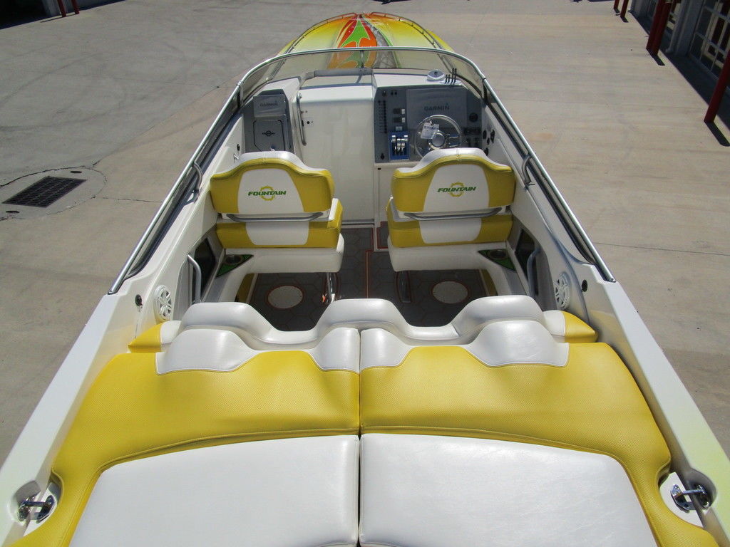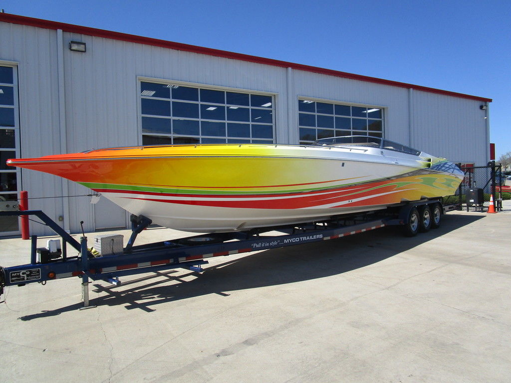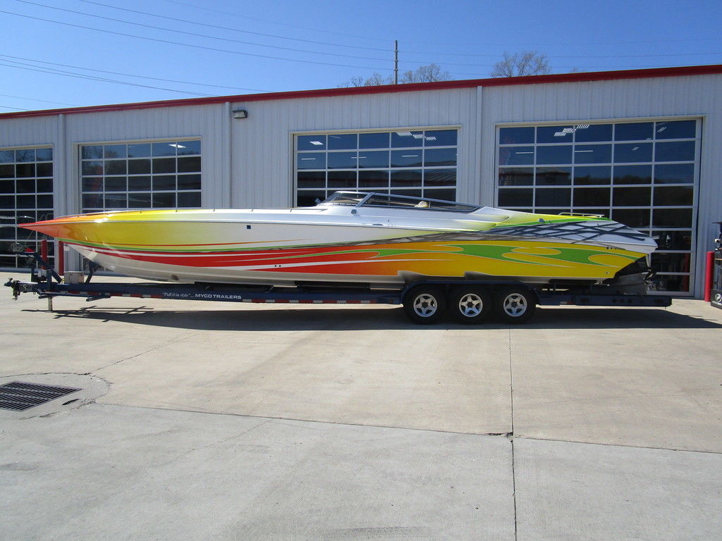 2008 Fountain 42 Lightning powered by twin HP700SCi with 113 hours on rebuilt motors from Precision Marine, 239 on boat. SSM# 6 dry sump drives, Hering 17x37.5 16° rake 6 blade props, upgraded two stage Hardin Marine stainless water pumps, upgraded intercooler stainless fitting and water flow kits, Whipple polished stainless air cleaners, upgraded stainless exhaust. NXT transmissions, rebuilt by BAM Marine- March 2017, upgraded output shafts and gears installed, April 2016 -$25k Mitcher T custom Paint job, 380 Kplanes, underwater lighting, New Garmin 7616 & 7607, Livorsi billet controls with all new cables, Tiger Performance 4 man intercom system, Bow thruster, heads up mechanical indicators, VHF radio, upgraded Fusion/JL Audio stereo, New Sea Deck flooring, new cockpit/sunpad vinyl, new Isotta steering wheel, new 3 bank battery charger, billet battery boxes, electric bolsters, Vacuflush head, and 2005 Myco custom triple axle trailer/drive guard with electric over hydraulic brakes, dual scooter racks, painted Mercury Racing Blue. New tires and bunk carpet included. Financing and transportation available.