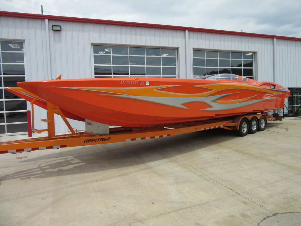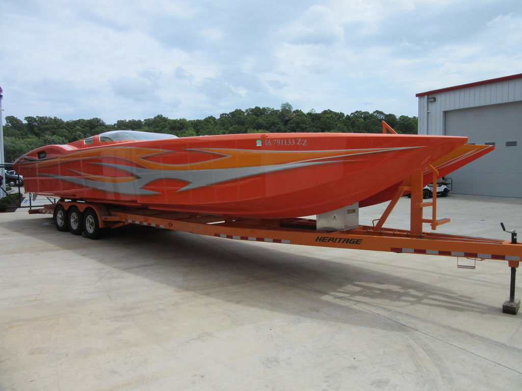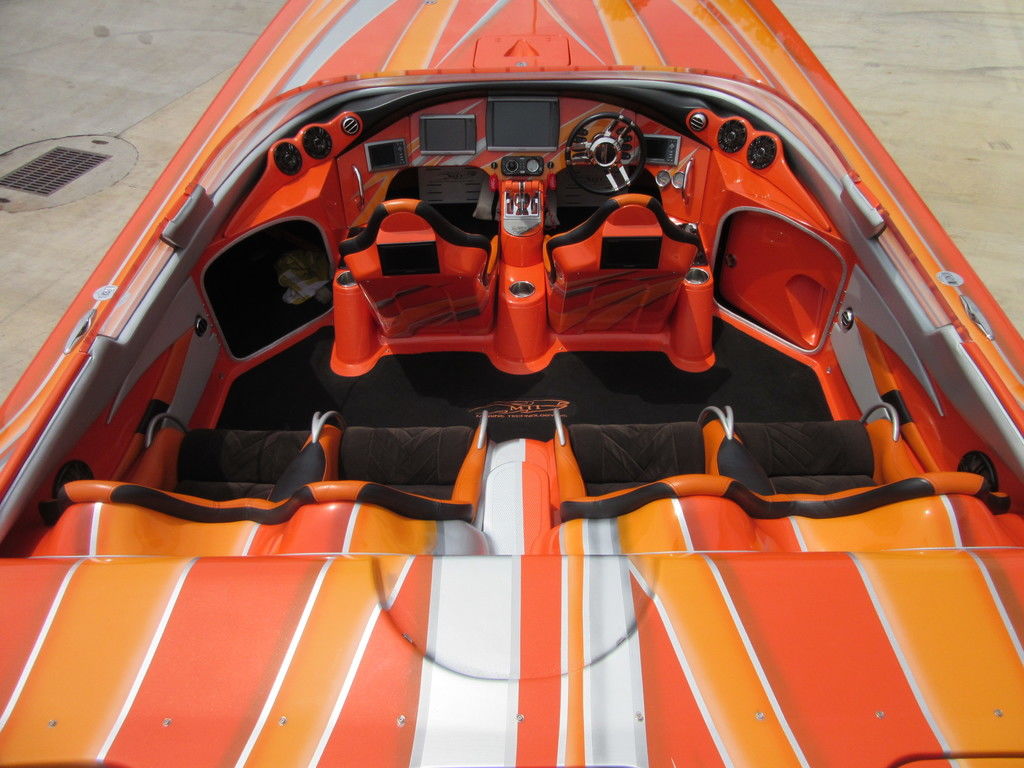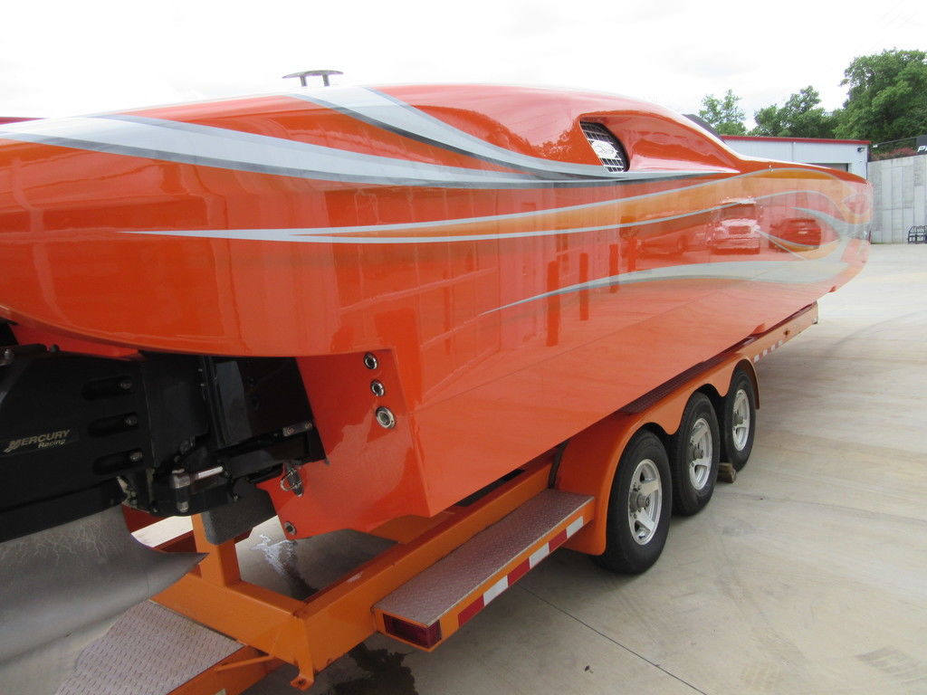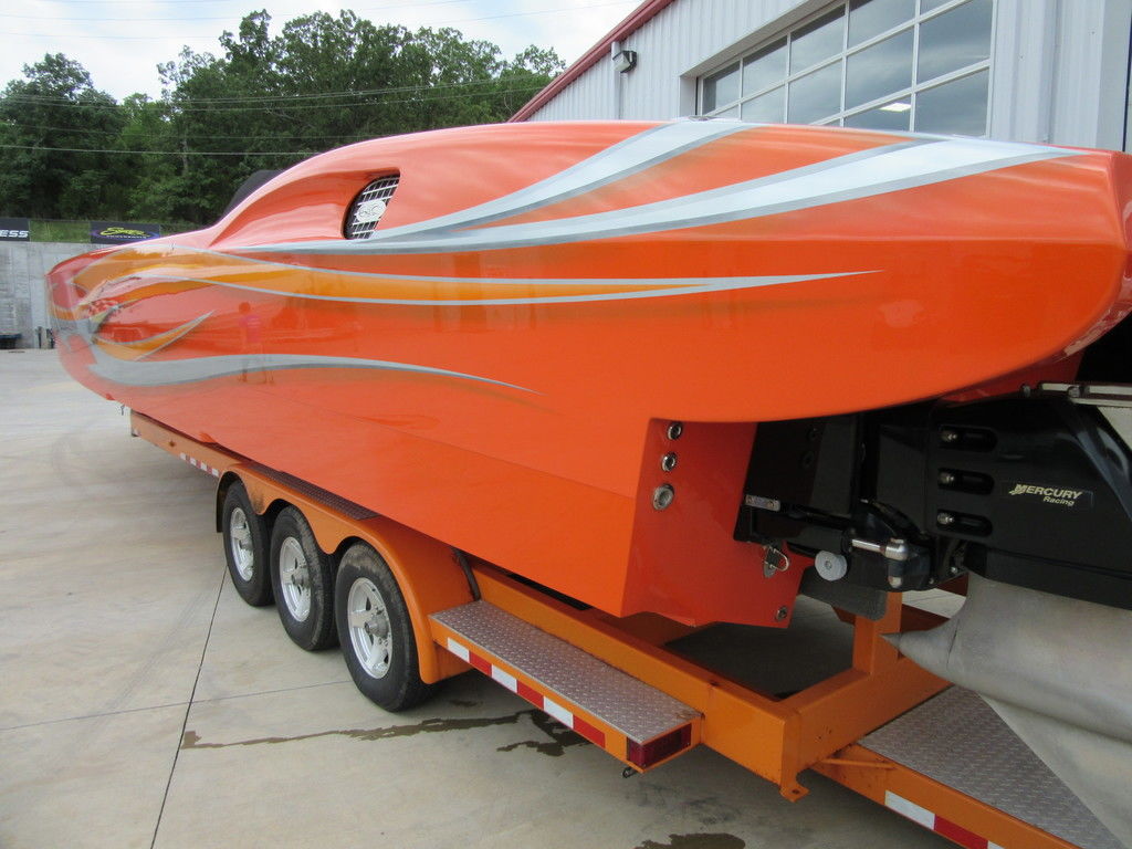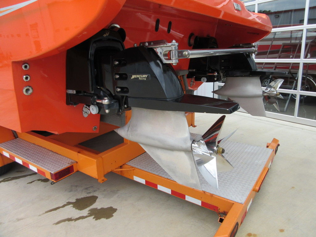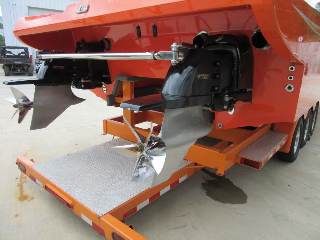 2008 MTI 42 powered by twin Mercury Racing QC4V1100 twin turbo with 152 hours, SSM#6 sterndrives with Mercury CNC 17x38 5 blade props, (2) Smartcraft Vesselview, Garmin GPSmap 5212 touchscreen, Garmin GPSmap 5008 touchscreen, Sony AM/FM/MP3 player, custom MTI throttle/shifters, video monitors in seatbacks, halon fire suppression system, LED bilge lighting, custom MTI padded cockpit carpet, cockpit cover, and Heritage triple axle trailer with toolbox. Financing and transportation available.