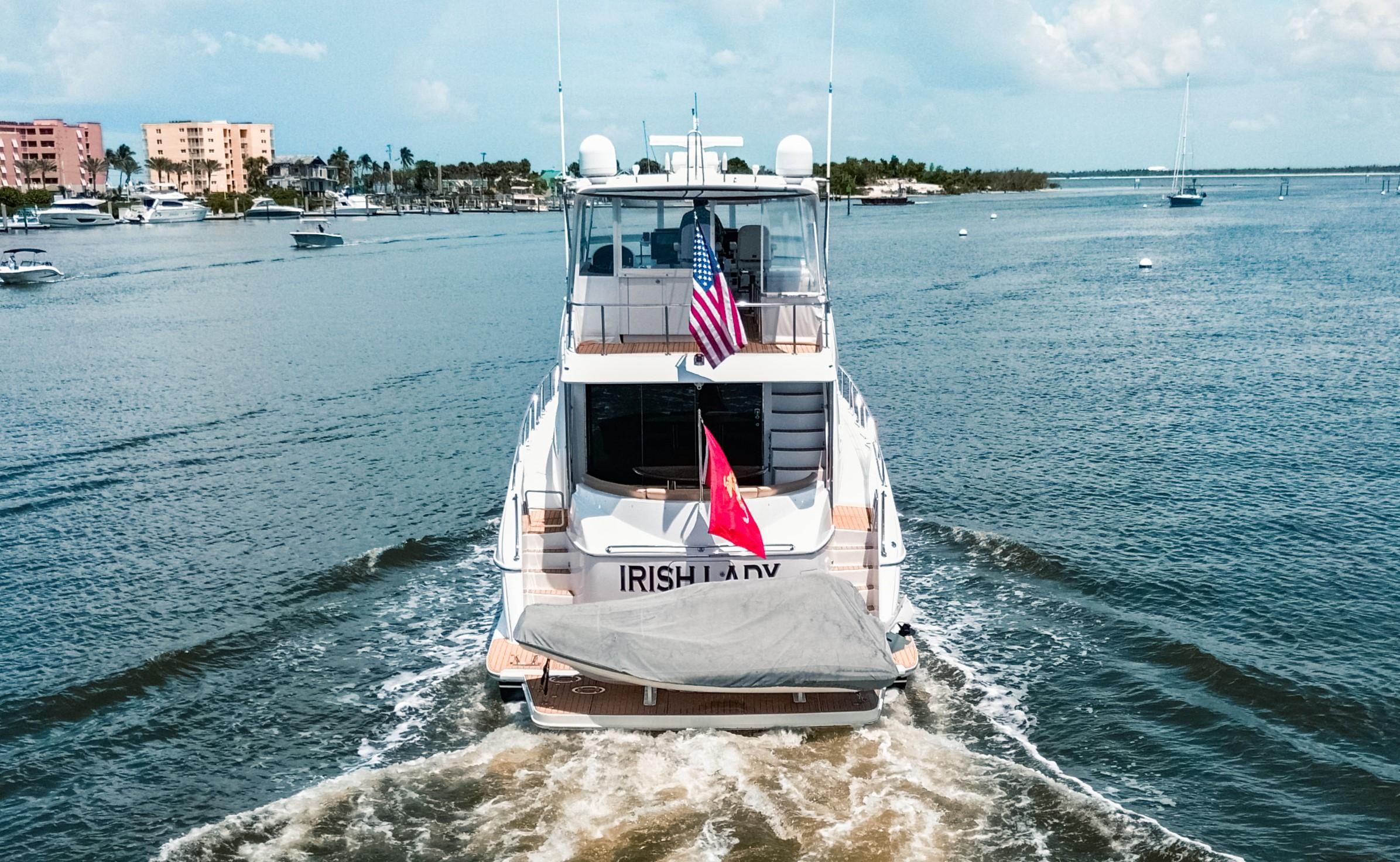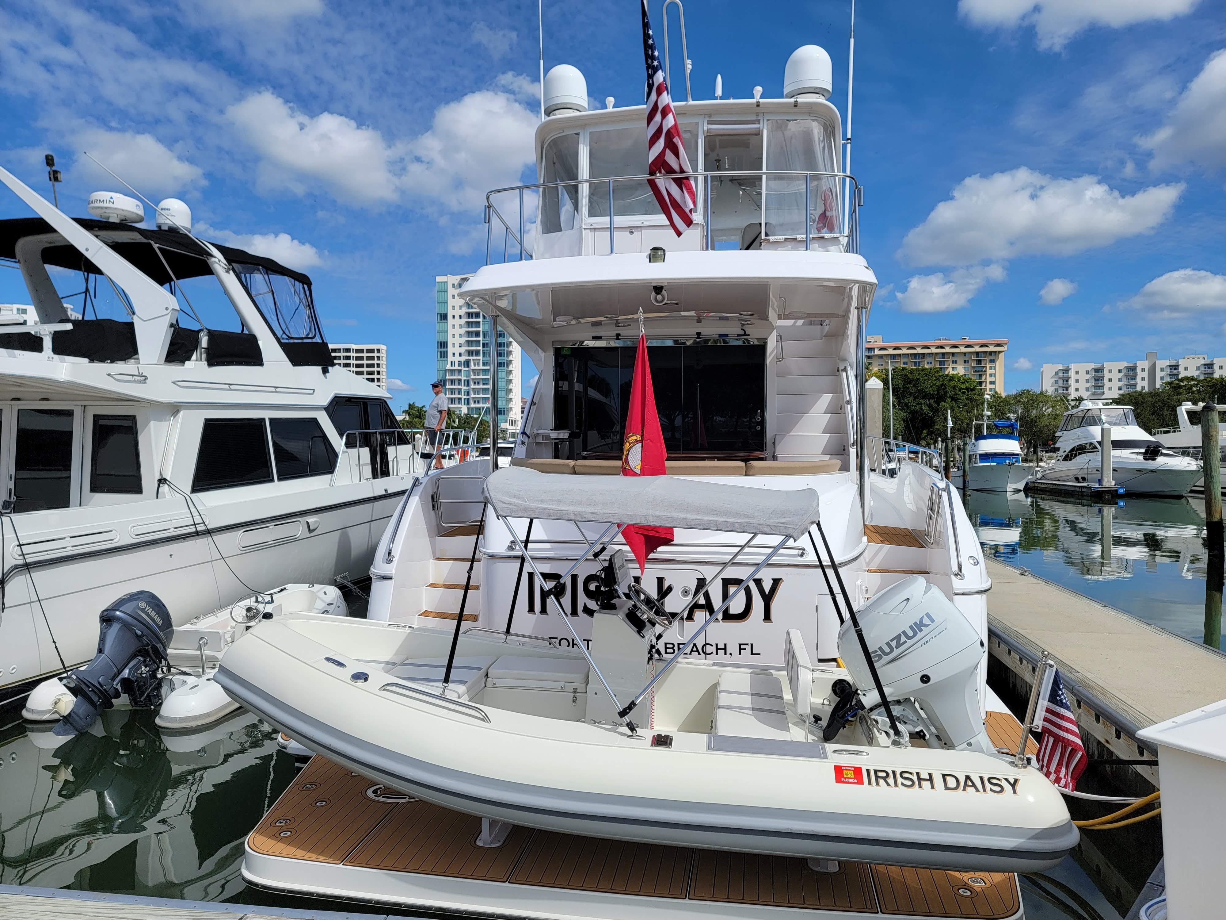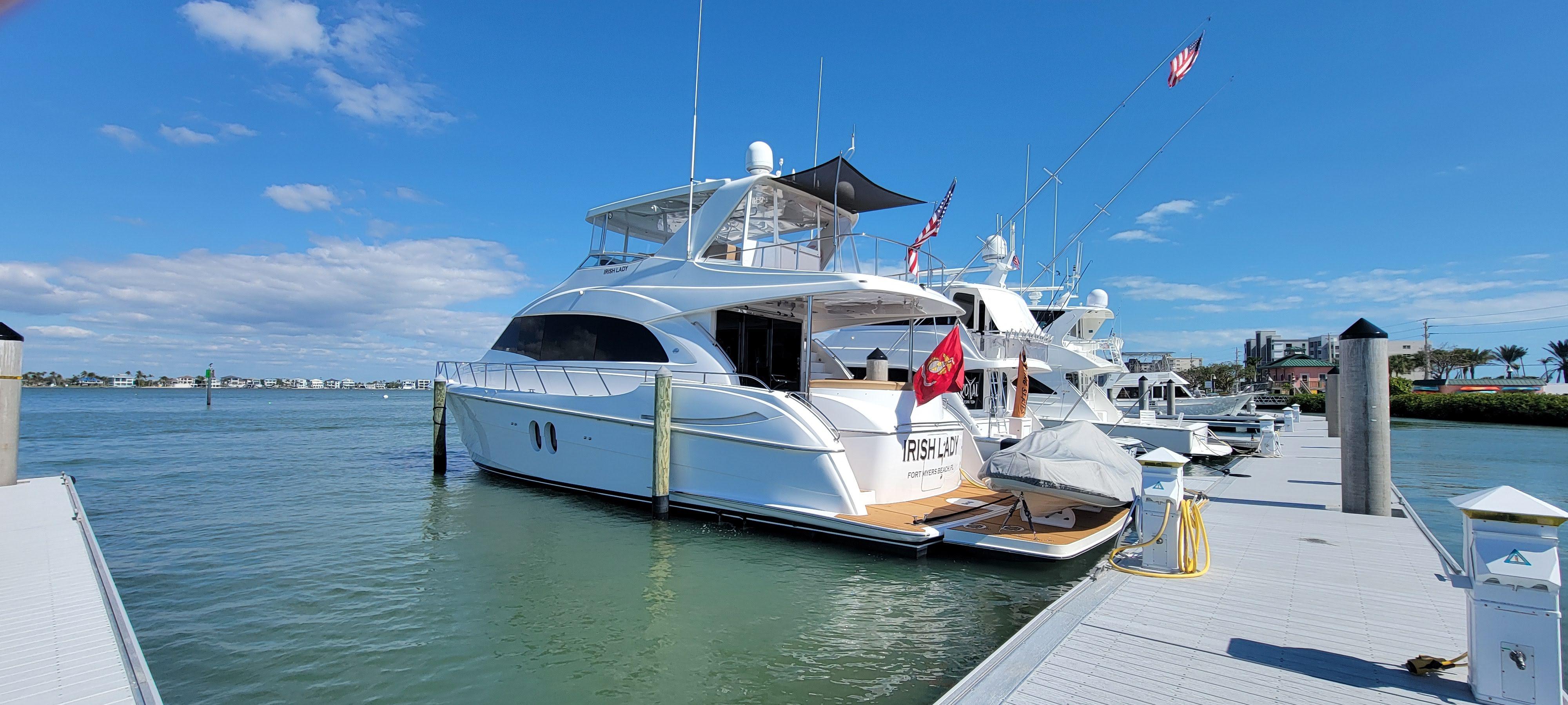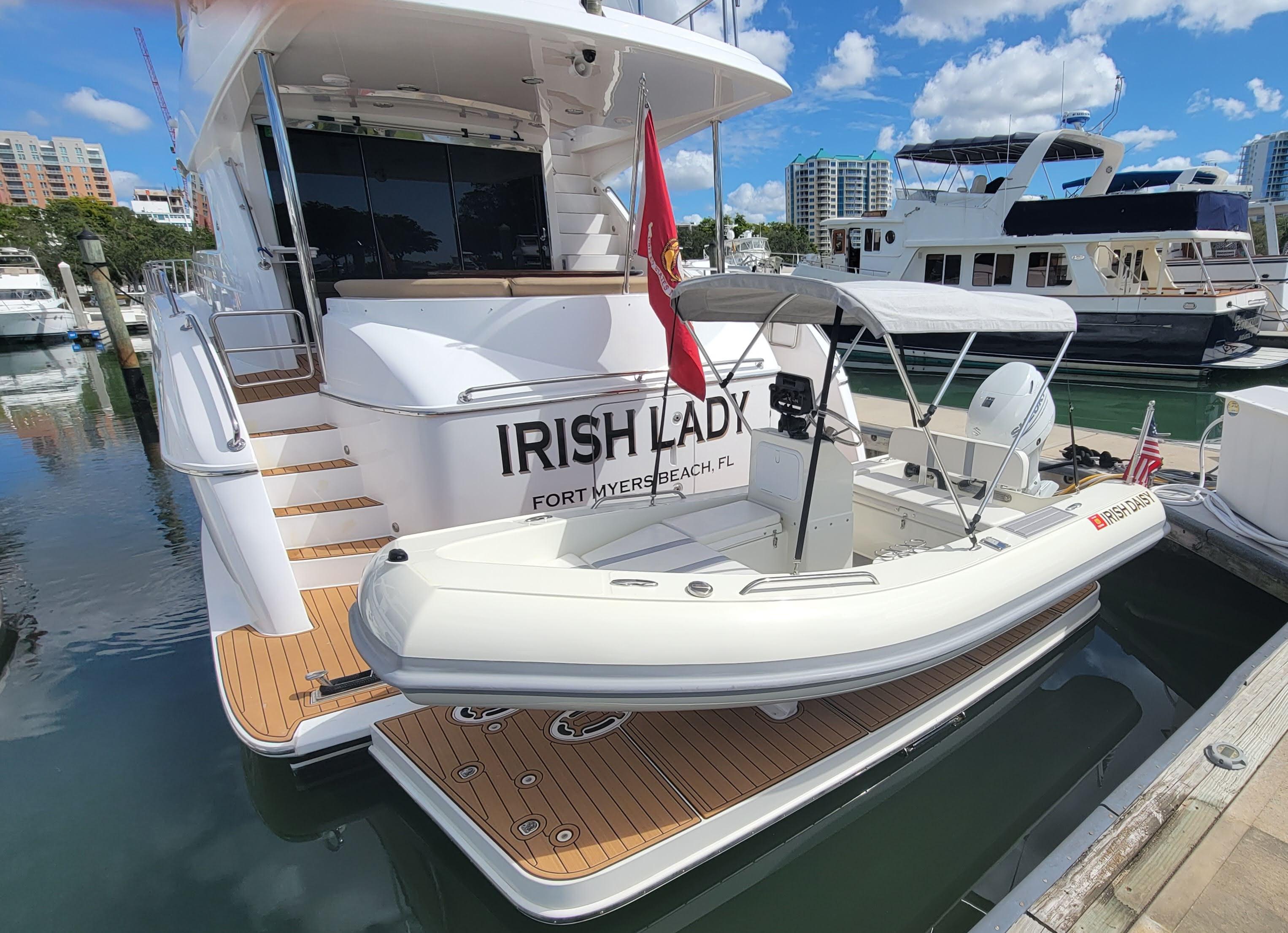 This is the best priced 60 Hatteras in the country. Located in Naples, Florida - this beautiful yacht has been meticulously maintained and updated by experienced owners. The owner holds a USCG 100 ton Masters License and is a former US Marine. After going through the boat the attention to detail and level of upkeep is instantly apparent. From the flybridge hardtop down to the lowest bilge areas she is white glove ready. She offers three staterooms and two heads, plenty of storage. If you have a large family, there is plenty of room. The current owners regularly have held gatherings from 10 up to 35. There is seating for 26 in the main seating areas not including the rear flybridge deck. Her safe dry solid ride allows for easy movement throughout the vessel. Over 18 feet of beam and nearly 65 feet of length, the Irish Lady provides exceptional space for long range travel and a high quality for living aboard. The vessel's maneuverability is efficient for her size with both bow and stern thrusters and the remote Dockmate system that allows for docking anywhere on the boat. Safety is provided with a fiberglass tender, there is a McMurdo Smartfind AIS EPIRB and a six person automatic life raft on the flybridge hardtop. The air-conditioned helm is befitting an experienced Captain, there are three large Garmin 8616 MFD, two Garmin GMI 20, 48 mile open array radar, Garmin sonar, FLIR M364 (thermal night vision), two ICOM VHF units, Airmar True Wind Weather Station, a Garmin Blackbox AIS transceiver, Apollo Fusion Sirius entertainment system with 4 zones and High Performance Starlink. The high performance Starlink provides internet both at anchor, docked, or underway up to 25mph. With two Platinum Pompanette seats centerline and a large L settee to port with a table there is room to entertain and catch the views underway. There is a refrigerator to the rear of the flybridge and easy access to the galley from the interior stairs and the rear deck from the exterior stairs. When the weather allows, the full EZ2C enclosure has panels that can be opened for the full experience of being underway. To the rear of the flybridge, the open deck area has a stainless railing for safety allowing for many different options in seating. The main level is made up the lower salon and upper galley. The salon has seating for eight with a large couch and opposite a large love seat with matching ottomans. The salon can be opened to the rear deck by opening the three full height glass doors into one panel. This creates one entertaining place including the rear deck, salon, and the galley. There are four sound zones controlled by the Apollo Fusion system to set proper levels while entertaining aboard. The flybridge, rear deck, transom decks, and all exterior stairs are covered with SeaDek. This provides safety and comfort, wet or dry, without the high cost of teak. All exterior seating is covered with top quality Sunbrella Horizon vinyl and all of them have additional heavy covers to protect them when not used or underway during in-climate weather. The lower levels hold the three sleeping staterooms. A full beam owner's suite has a king bed, both a walk-in closet and smaller closet, and both sides of storage drawers. There is a surround sound Sony system with LED television. The en-suite head has dual sinks and a full size shower. Both toilets are elongated Raritan with raised bases, and there is no holding tank. The USCG certified Raritan sanitation system treats all waste and processes it out the bottom of hull as inert material. No more pump outs and dealing with the problems that come with them. Right outside the owner's suite are the stacked Miele high capacity M1 T1 washer and dryer. These are top of the line, full size units, that can service a king mattress pad. The water heater has also been upgraded to a 38 gallon dual element tank providing 60 gallons of hot water per hour. Even with a full boat, no cold showers. From the owner's suite traveling towards the bow are the cross bed bunk room and VIP stateroom, each have hanging and drawer storage, and LED displays. They share a guest bathroom with a single sink and shower. Both the owner's suite and the guest areas have separate A/C zones. Down the rear deck steps is the transom and hydraulic lift that carries the 14' Rigid Boat tender with a 60hp Suzuki outboard. The tender has a full bimini top, dive ladder, and a integrated 16 gallon fuel tank, and a 9" Garmin MDF with Sideview and Clearview sonar. Access to the engine room is a large hatch from the rear transom opening to the lazarette or the large floor hatch located on the back deck. The full beam engine room houses two 1000hp CAT C-18 twin turbo marine engines, a CAT C2.2 Marine Generator, Aqua-Whisper Water maker, Spot Zero, and all the other mechanicals with over 7' of headroom.