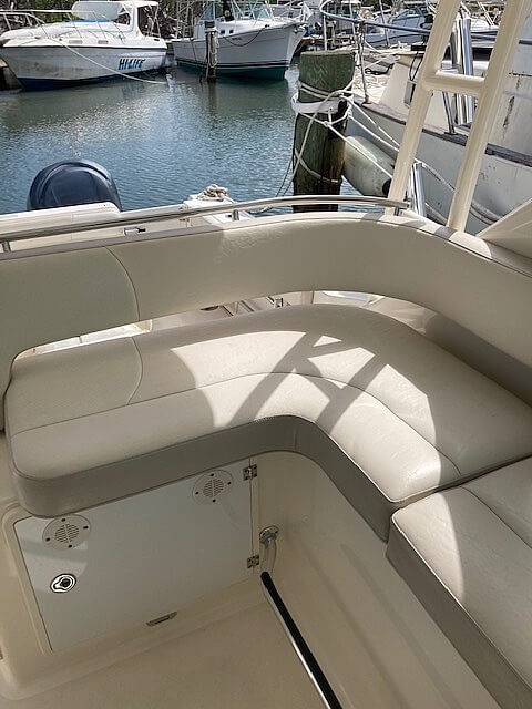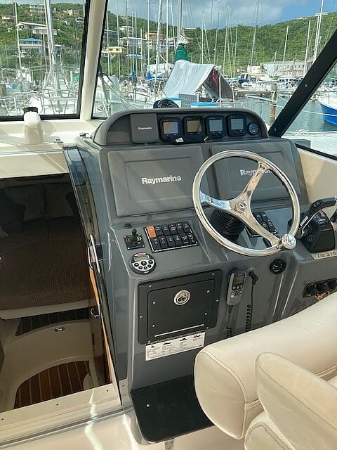 This vessel is located in St Thomas, Virgin Islands and is in great condition. She is also equipped with twin Yamaha engines that have 350 hours.