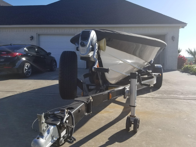 Boat is stored inside with custom cover on a custom trailer with swing tongue.