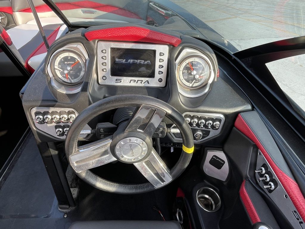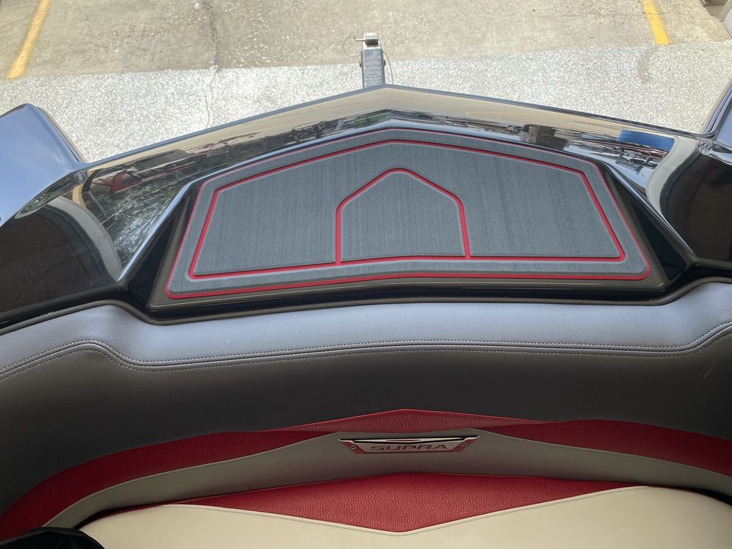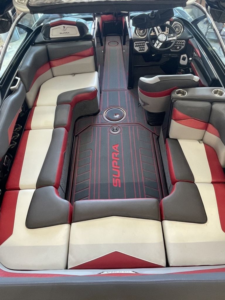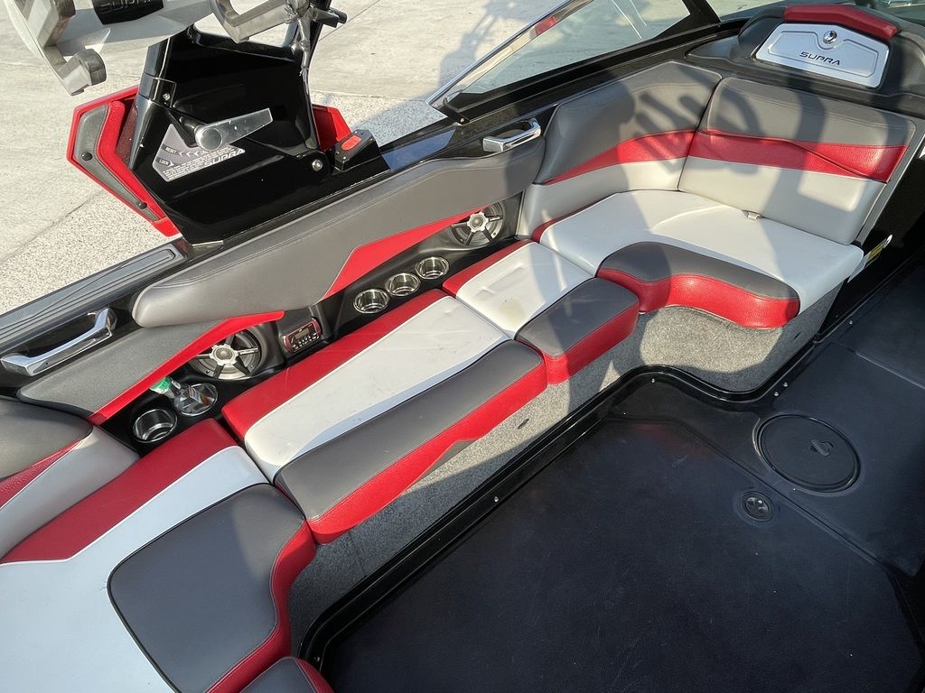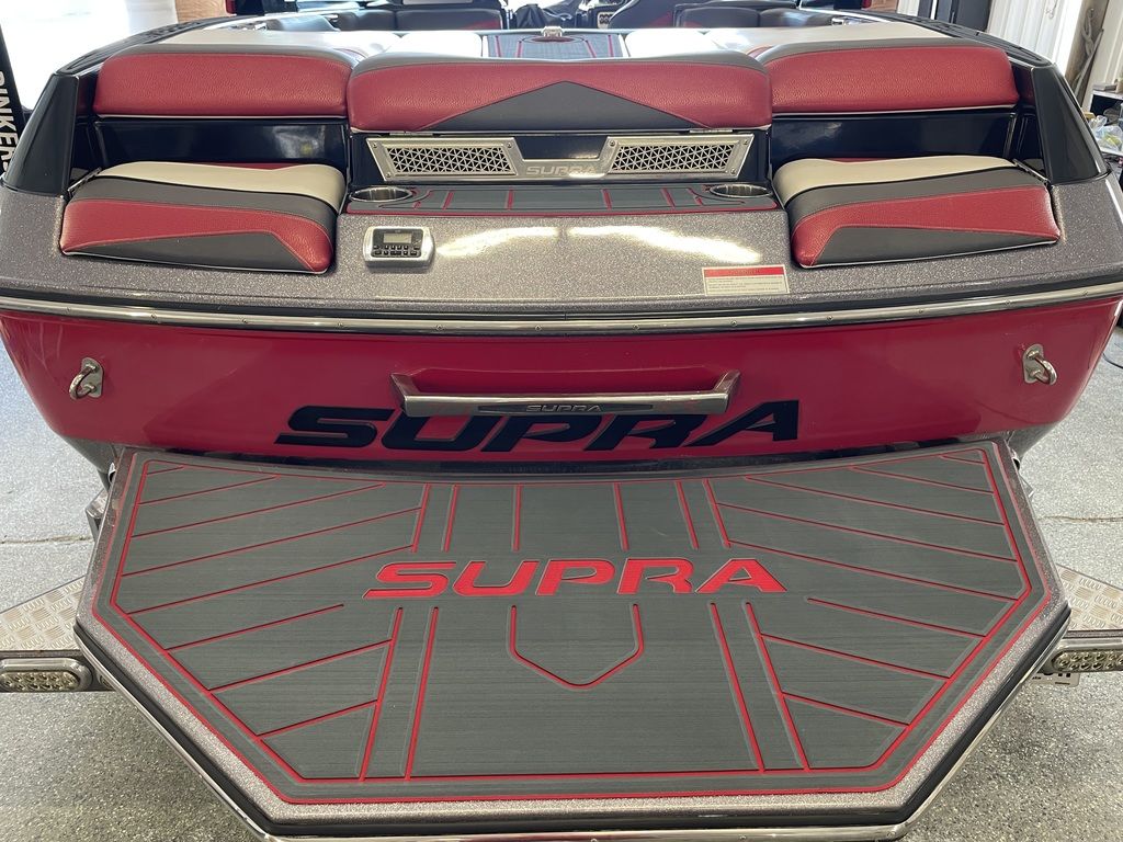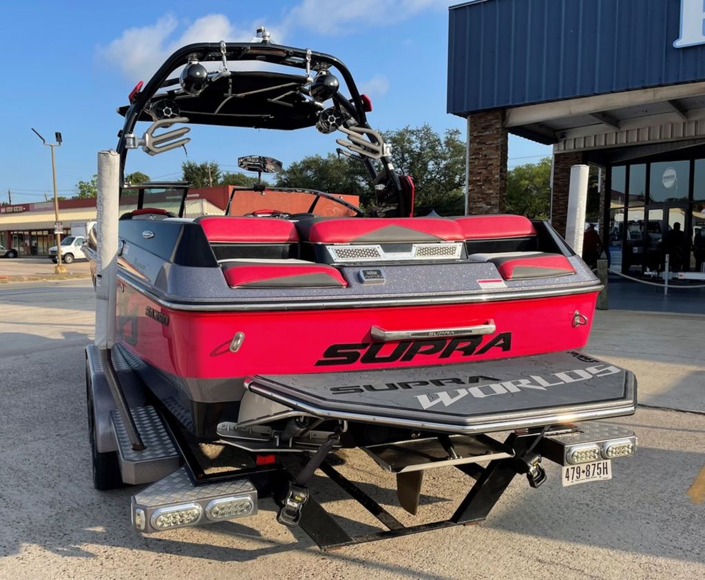 The 2014 Supra SA350 combine shocking wakes, precise handling and an awesome interior, but in true Supra style this wake boat has upped its shock value. The Supra SA shines with new metal flake gel coat colors, Blacked-out and Verge hull graphic as well as new Pro Edge Tower Contrast color options. The SA has gone soft, but durable on the inside with the abrasion resistant stain protected SupraSkin vinyl from Spradling; bringing together new colors and textures for an even more luxurious look and feel. A new aggressive windshield lifts the eyes of the boat to the level of refinement shared by the lofty attitude of the Barrage Front End and powerfully calming Battle Prep Transom. The SA still attacks the water with 350-550 horses of Indmar power, depending on your engine choice, pro hull design and precision underwater gear. Snap-out carpet covers a fiberglass floor for a quiet convenient base to a plush interior. 900 pounds of hard tank sub structural floor Liquid Lead ballast, a loaded Roswell Pro Edge Tower, Zero Off GPS speed control, the SmartPlate, VISION Touch Rider Profiles and 1,300-pounds of available Flex ballast will wake-up dreams of going pro. The Supra SA is shock and awe.