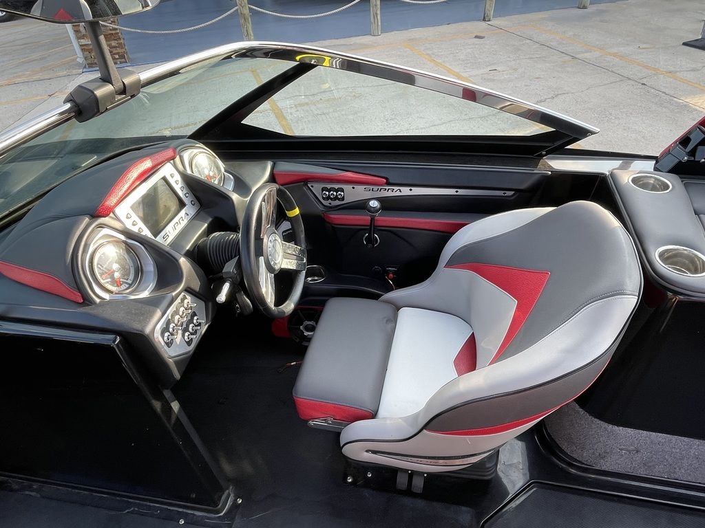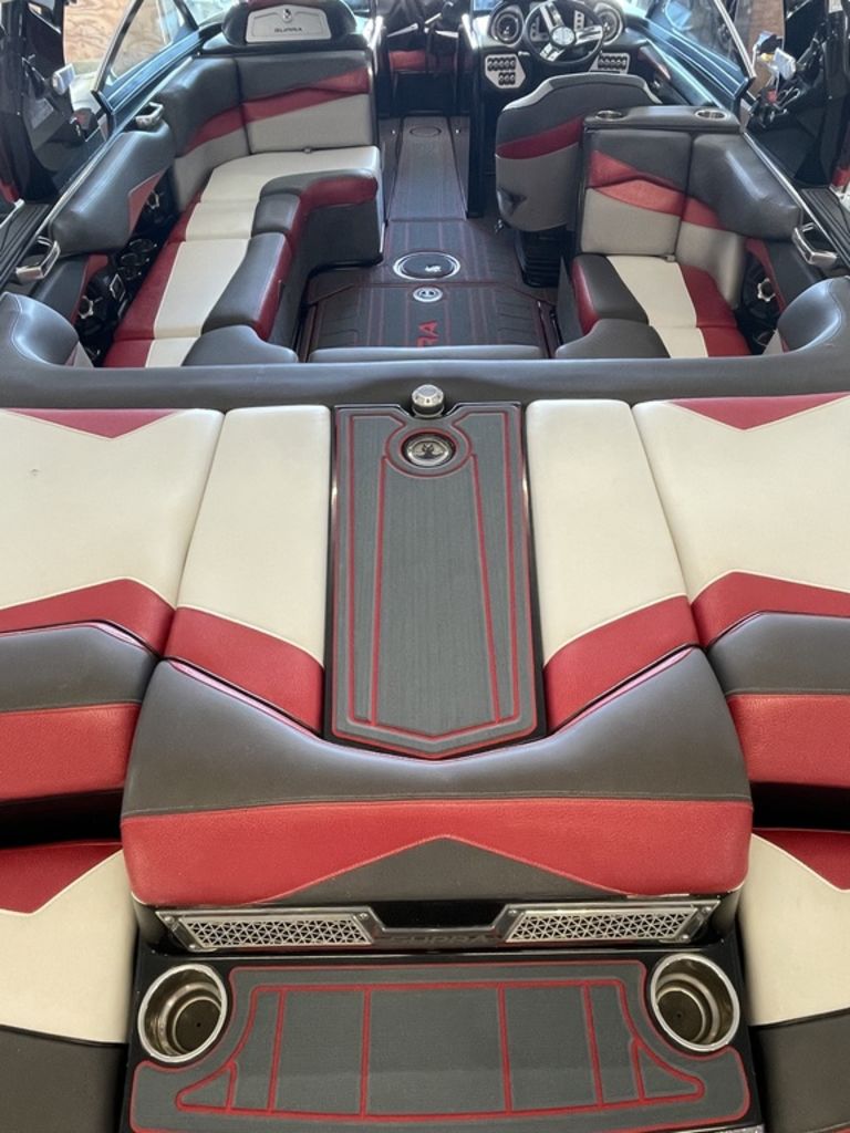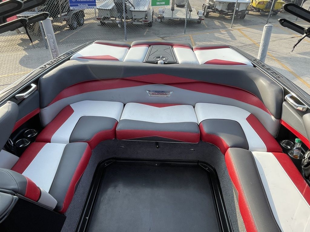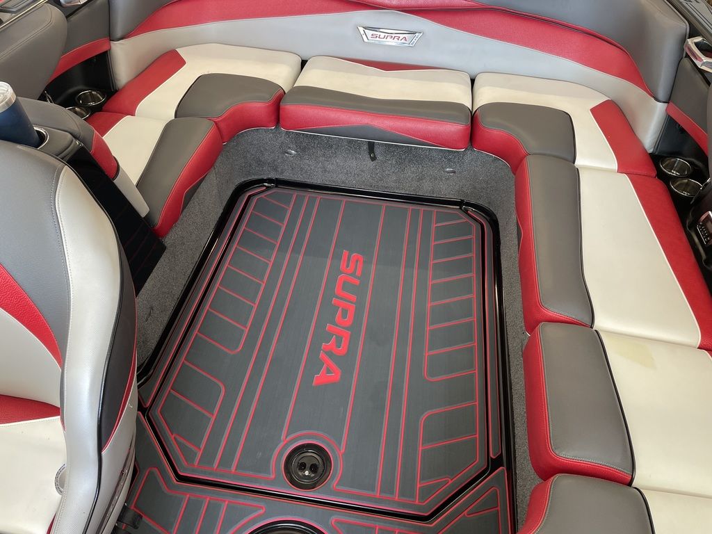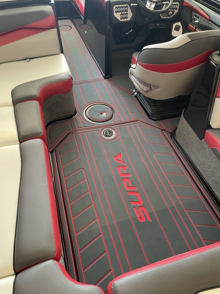 The 2014 Supra SA350 combine shocking wakes, precise handling and an awesome interior, but in true Supra style this wake boat has upped its shock value. The Supra SA shines with new metal flake gel coat colors, Blacked-out and Verge hull graphic as well as new Pro Edge Tower Contrast color options. The SA has gone soft, but durable on the inside with the abrasion resistant stain protected SupraSkin vinyl from Spradling; bringing together new colors and textures for an even more luxurious look and feel. A new aggressive windshield lifts the eyes of the boat to the level of refinement shared by the lofty attitude of the Barrage Front End and powerfully calming Battle Prep Transom. The SA still attacks the water with 350-550 horses of Indmar power, depending on your engine choice, pro hull design and precision underwater gear. Snap-out carpet covers a fiberglass floor for a quiet convenient base to a plush interior. 900 pounds of hard tank sub structural floor Liquid Lead ballast, a loaded Roswell Pro Edge Tower, Zero Off GPS speed control, the SmartPlate, VISION Touch Rider Profiles and 1,300-pounds of available Flex ballast will wake-up dreams of going pro. The Supra SA is shock and awe.