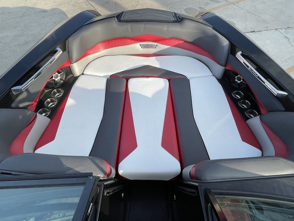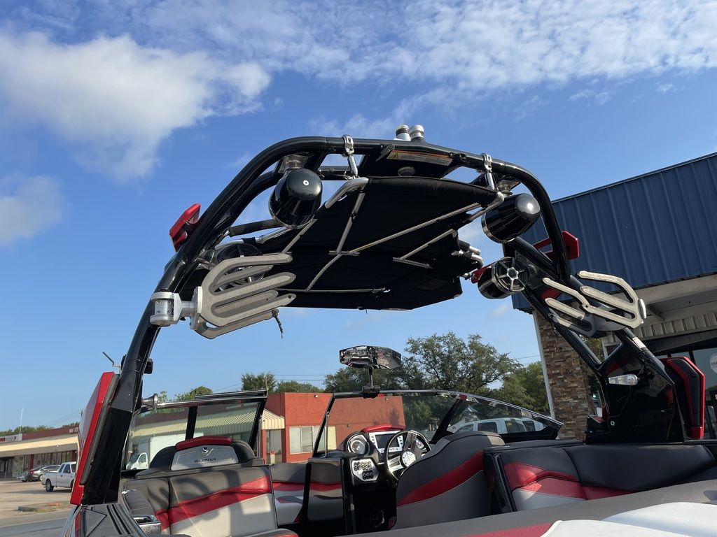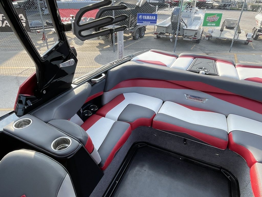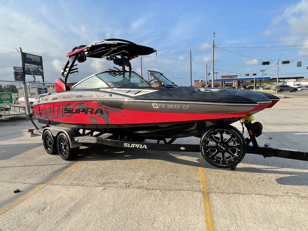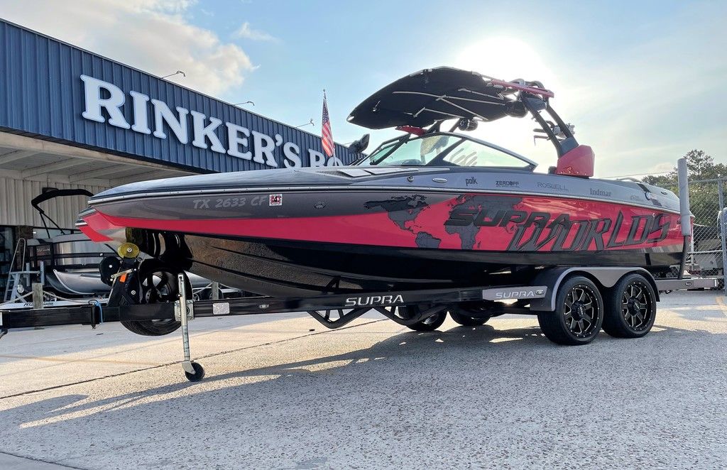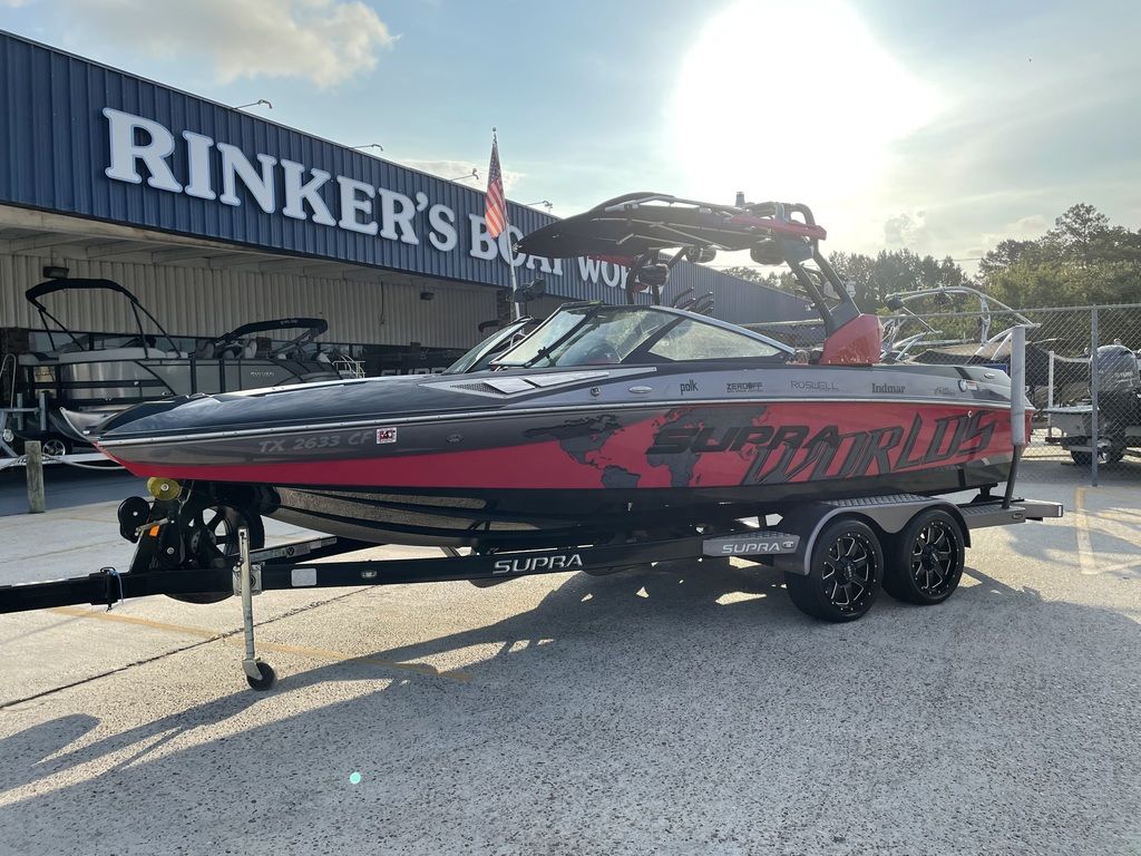 The 2014 Supra SA350 combine shocking wakes, precise handling and an awesome interior, but in true Supra style this wake boat has upped its shock value. The Supra SA shines with new metal flake gel coat colors, Blacked-out and Verge hull graphic as well as new Pro Edge Tower Contrast color options. The SA has gone soft, but durable on the inside with the abrasion resistant stain protected SupraSkin vinyl from Spradling; bringing together new colors and textures for an even more luxurious look and feel. A new aggressive windshield lifts the eyes of the boat to the level of refinement shared by the lofty attitude of the Barrage Front End and powerfully calming Battle Prep Transom. The SA still attacks the water with 350-550 horses of Indmar power, depending on your engine choice, pro hull design and precision underwater gear. Snap-out carpet covers a fiberglass floor for a quiet convenient base to a plush interior. 900 pounds of hard tank sub structural floor Liquid Lead ballast, a loaded Roswell Pro Edge Tower, Zero Off GPS speed control, the SmartPlate, VISION Touch Rider Profiles and 1,300-pounds of available Flex ballast will wake-up dreams of going pro. The Supra SA is shock and awe.