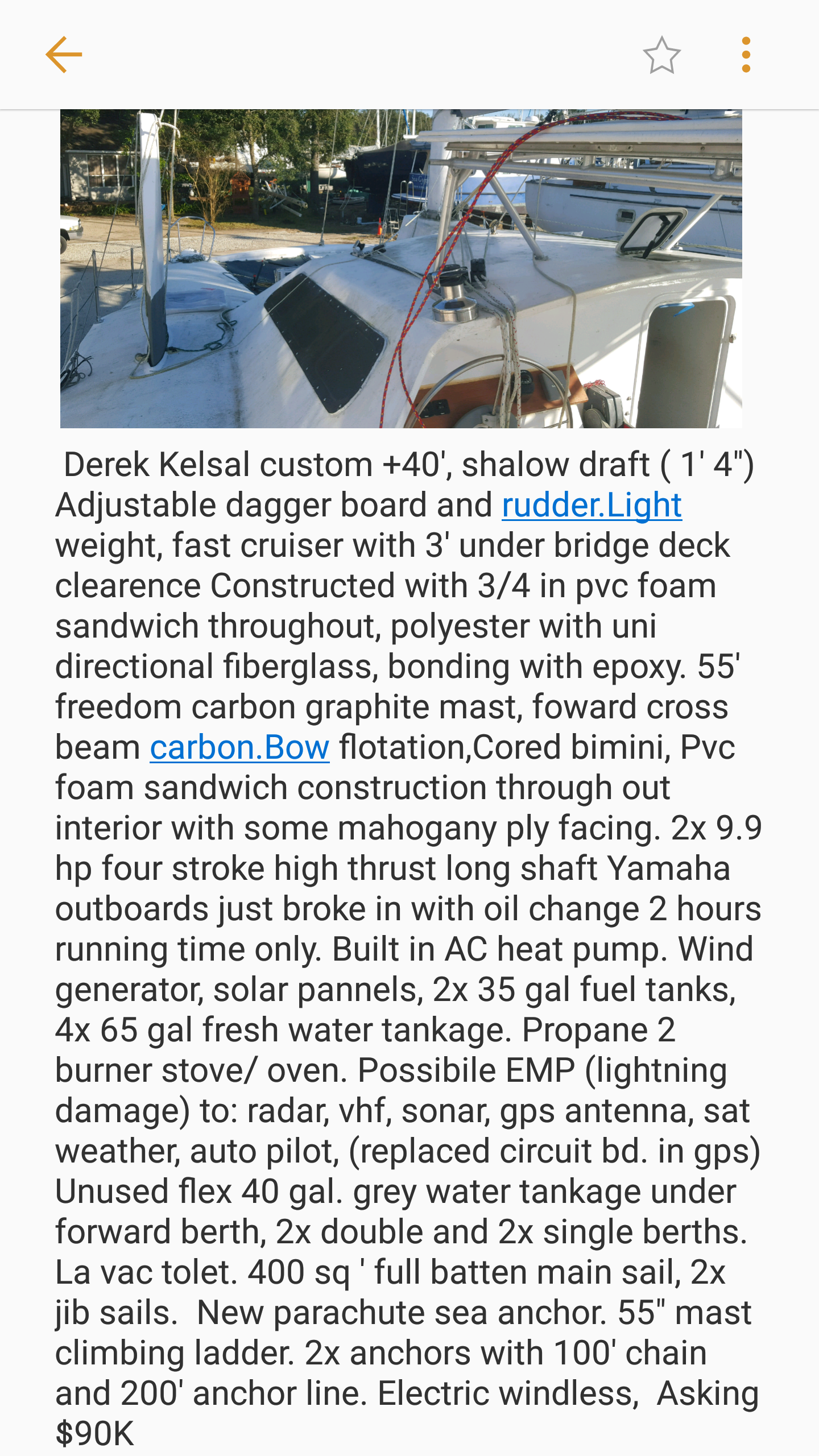 Shallow draft,fast cruiser, free standing carbon mast, 34 pvc foam and uni directional construction.