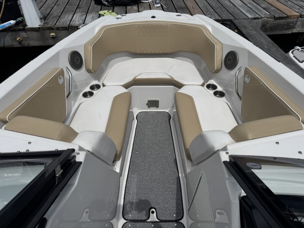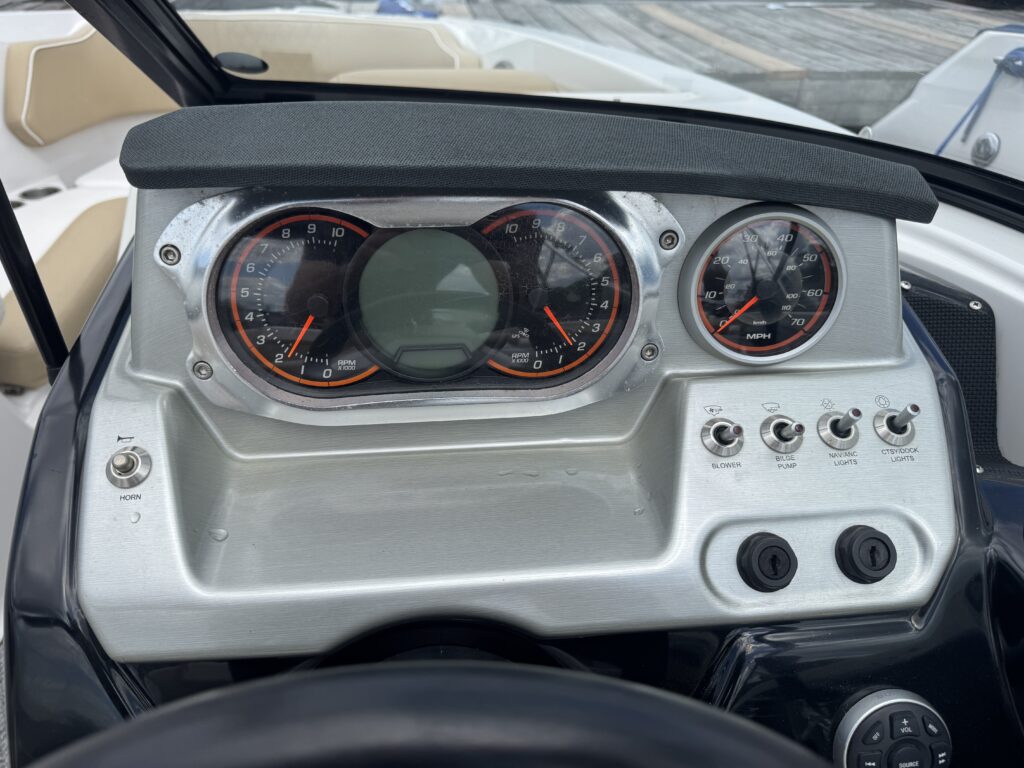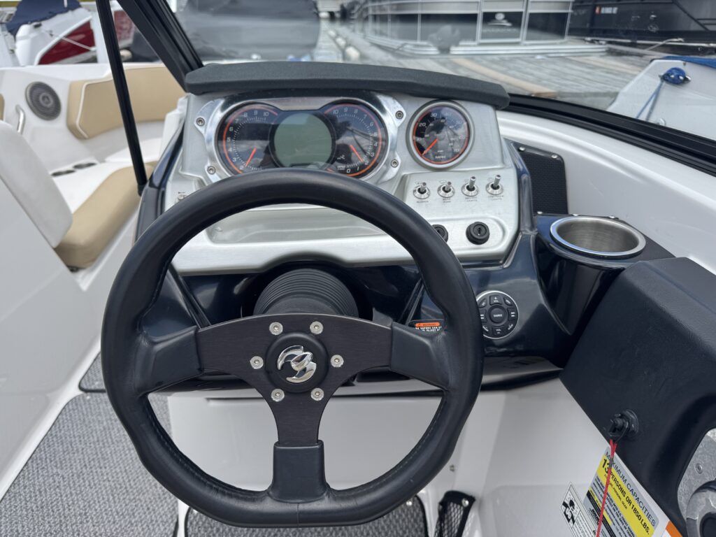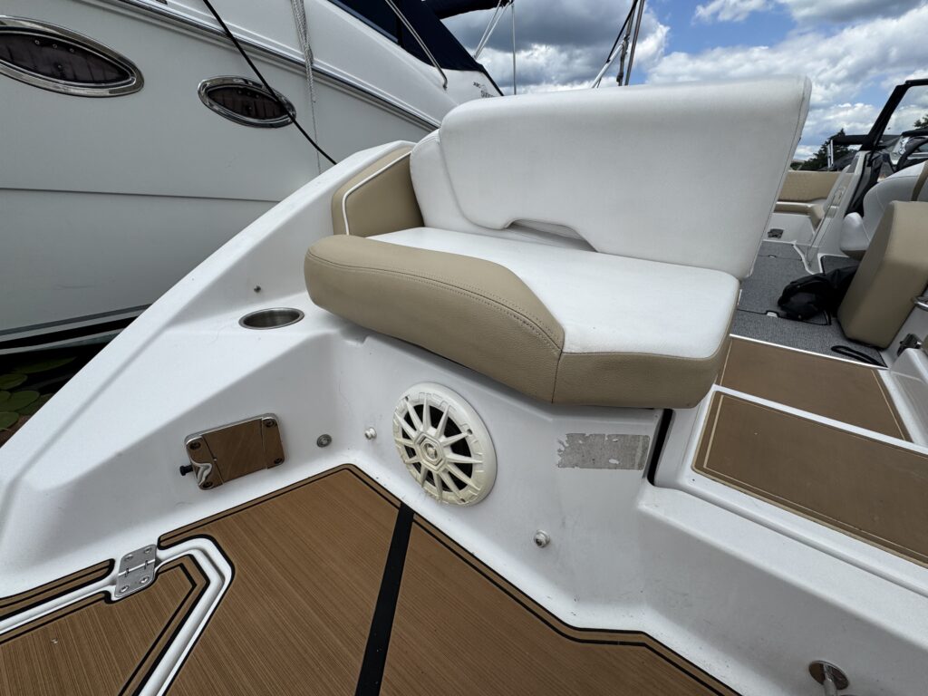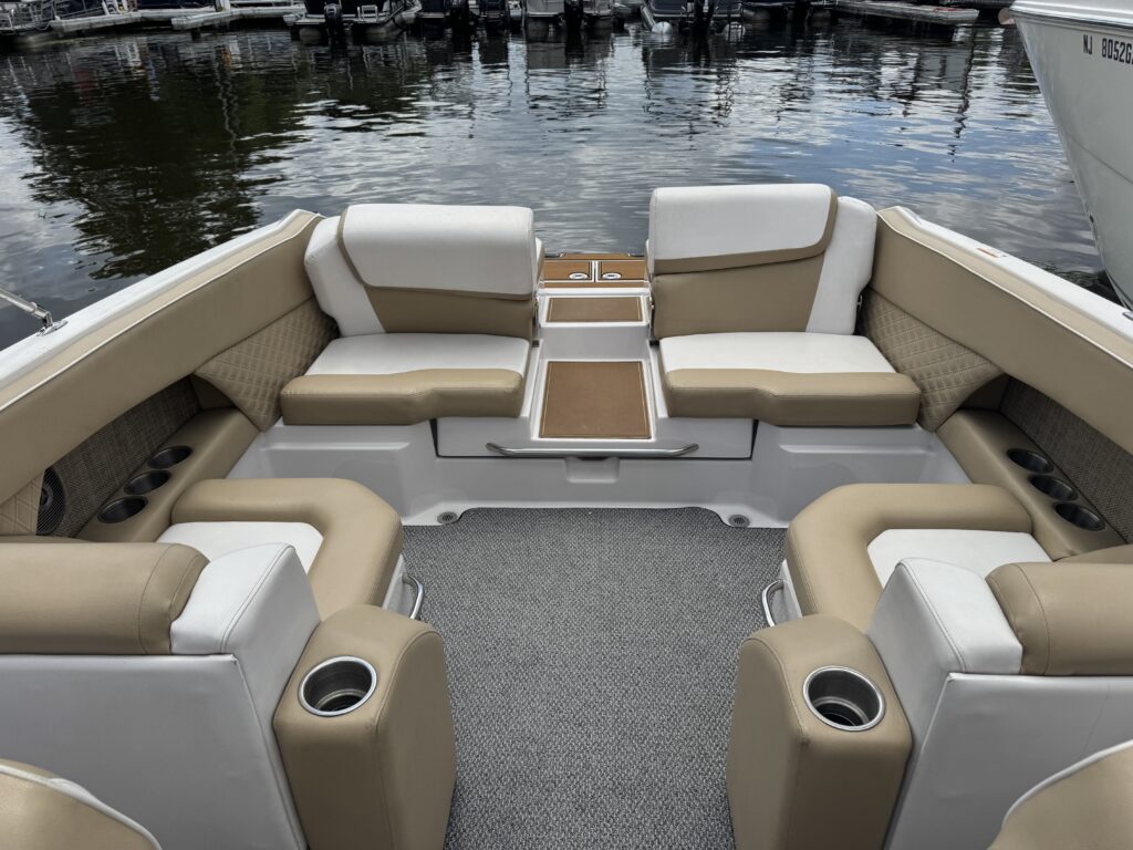 Features include bimini top, snap in carpet, Bluetooth stereo with remote on dash, head with pump out, depth finder, swim platform with speakers and mat, docking lights, underwater lights, blue interior lighting, two tables, and more!