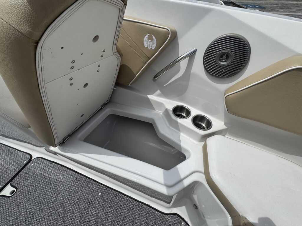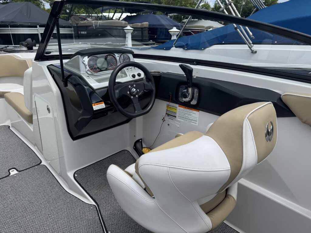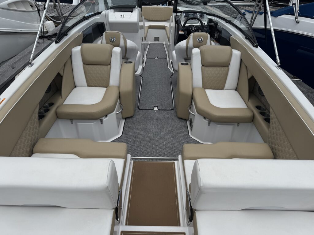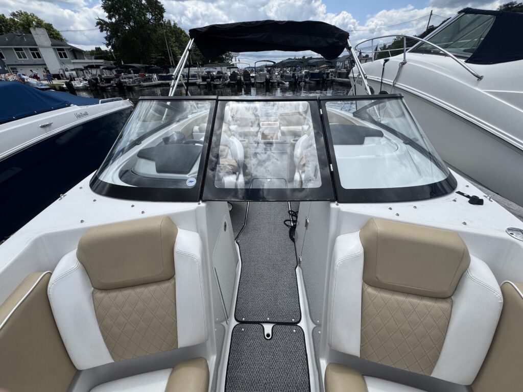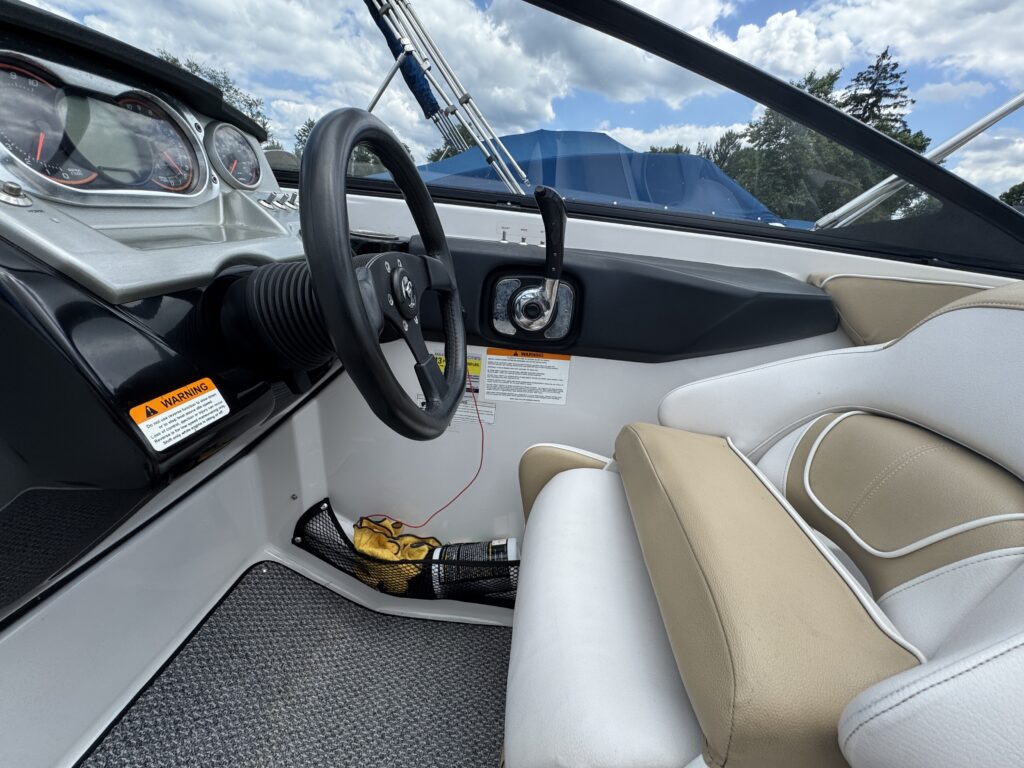 Features include bimini top, snap in carpet, Bluetooth stereo with remote on dash, head with pump out, depth finder, swim platform with speakers and mat, docking lights, underwater lights, blue interior lighting, two tables, and more!