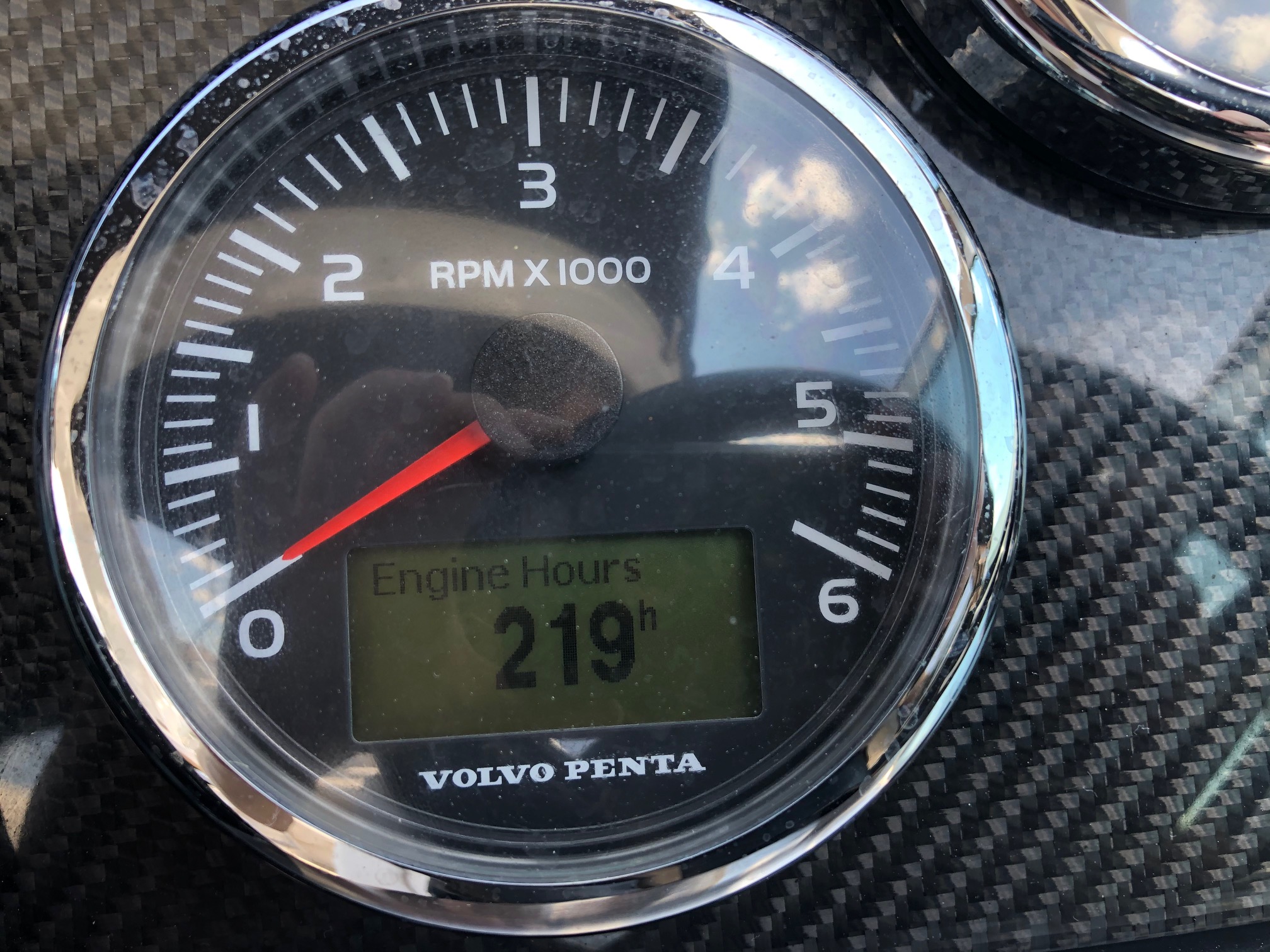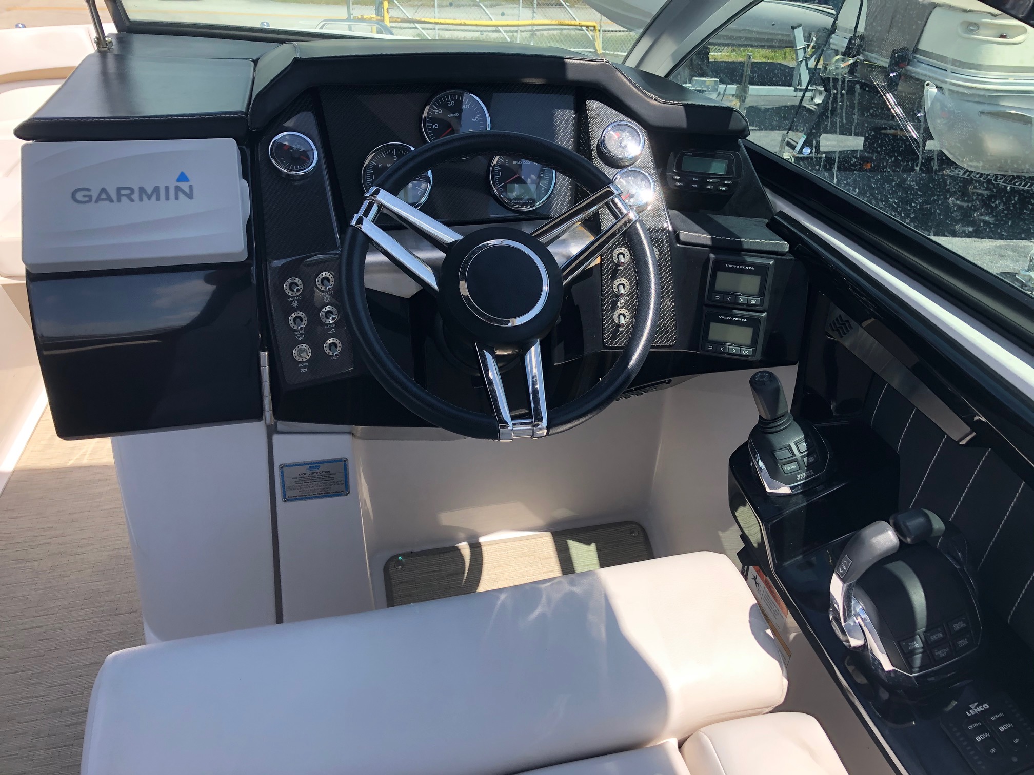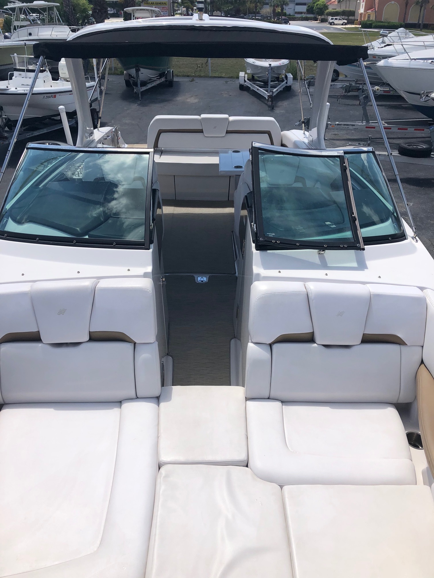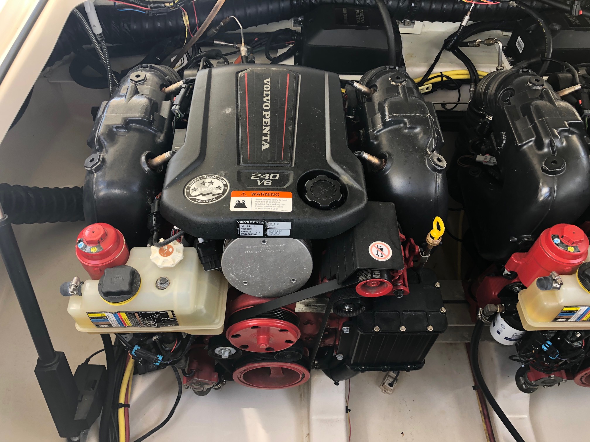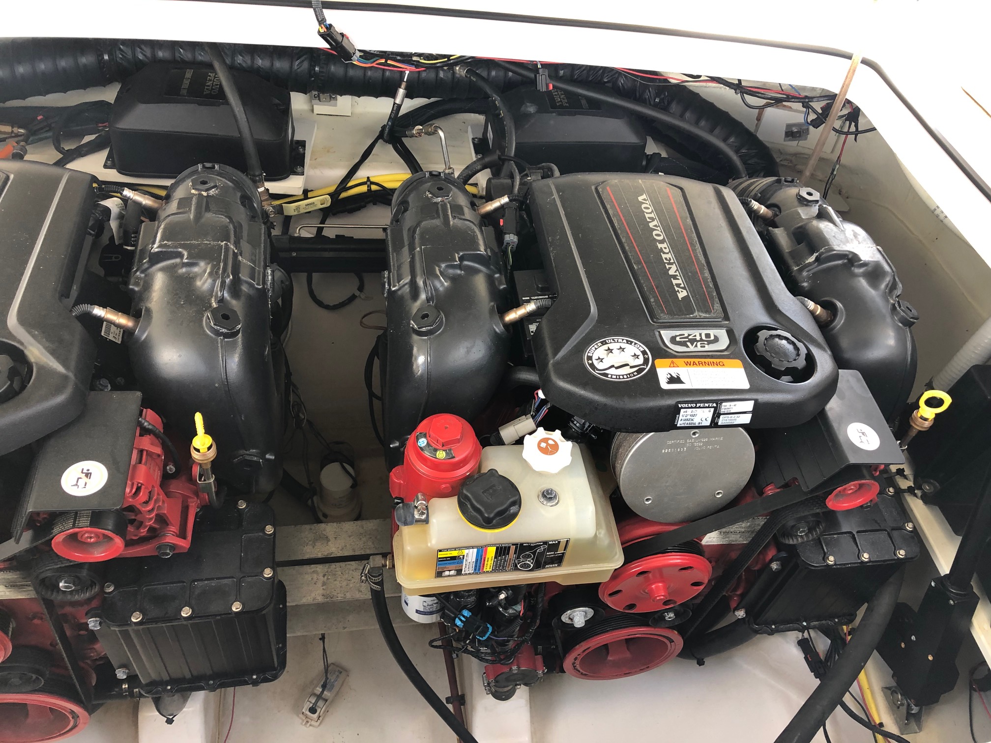 This 2016 Four Winns H290 is equipped with twin Volvo V6 240 hp motors (219 & 217 hours), pictured TRAILER IS NOT INCLUDED. This boat is loaded with options including a flush mounted Garmin GPSmaps 7607 XSV, Infinity stereo with JL auido speakers, Volvo joystick control, digital Volvo Penta gauges, windlass anchor, marine toilet with macerator, radar arch with bimini tops, deck fridge, under deck cooler storage with cooler, battery charger, fresh water shower, external fresh water hook up to flush motors. Comes with filler cushions to turn bow seating area into a fill in bed or have seating. Comes with side mounted table that can be set up in the bow or cockpit area. Snap on carpet. Full snap on boat cover included.